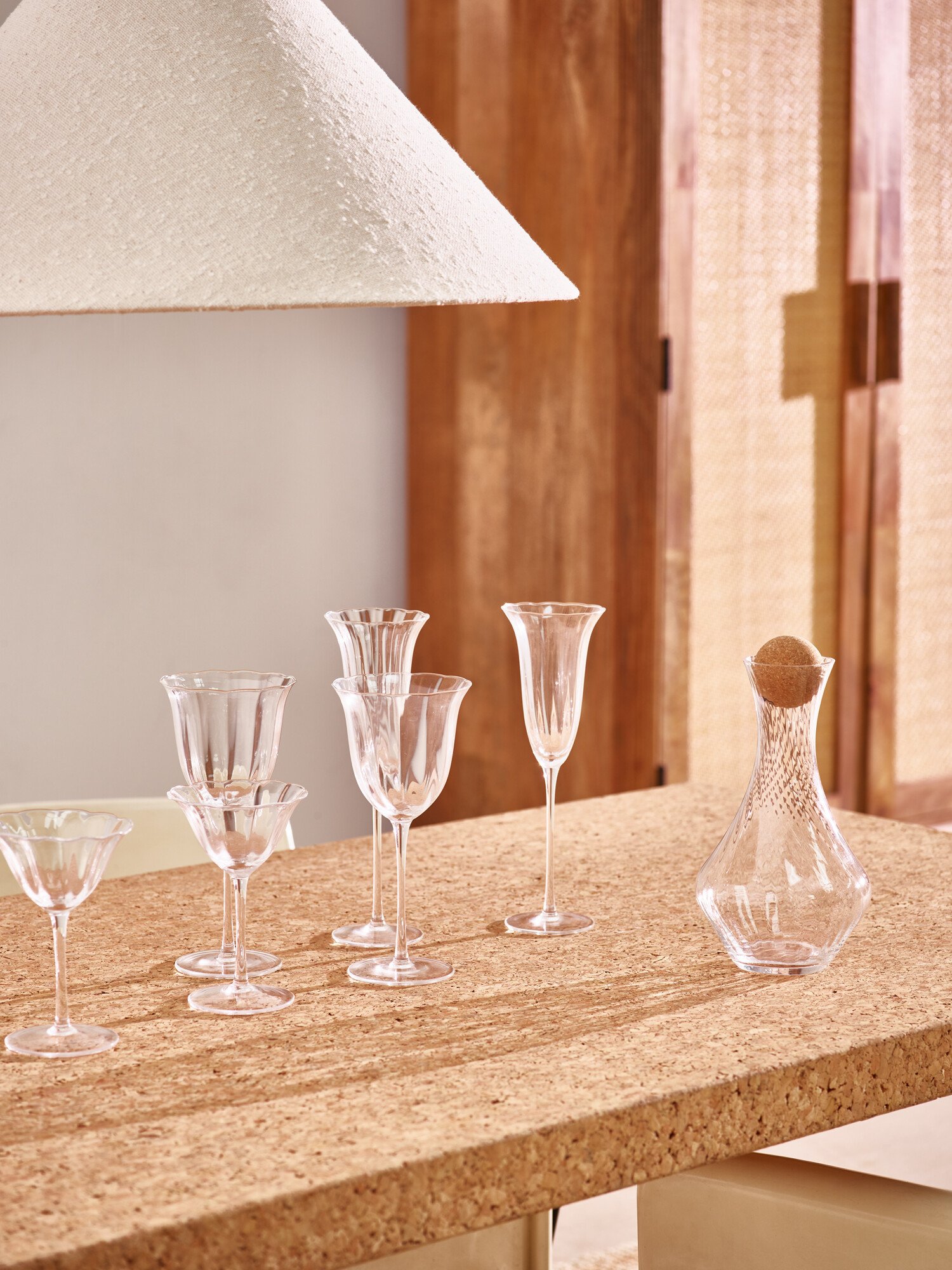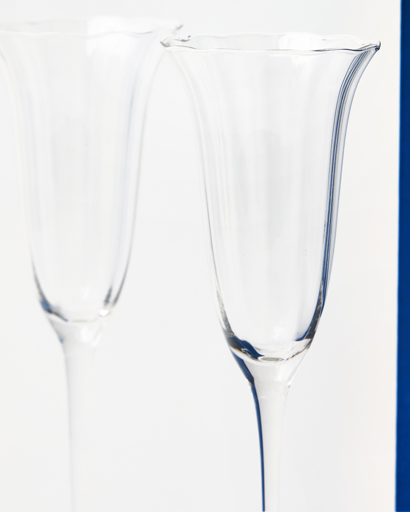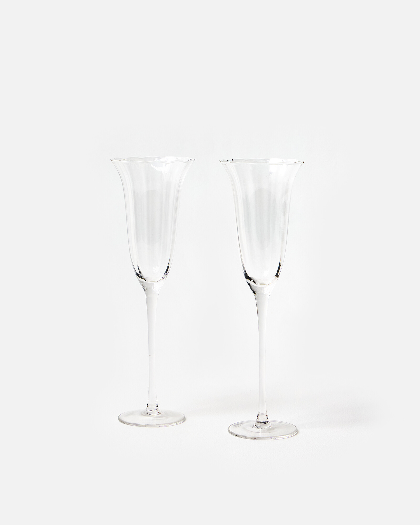 Set of two clear glass champagne glasses with tall, fluted bowls and lightly waved rims. Each piece is finished by hand, and invokes a sense of floral femininity with elegant curves and subtle details. Style and gift with other glassware from the Fleur range, for a sophisticated drinking experience.
