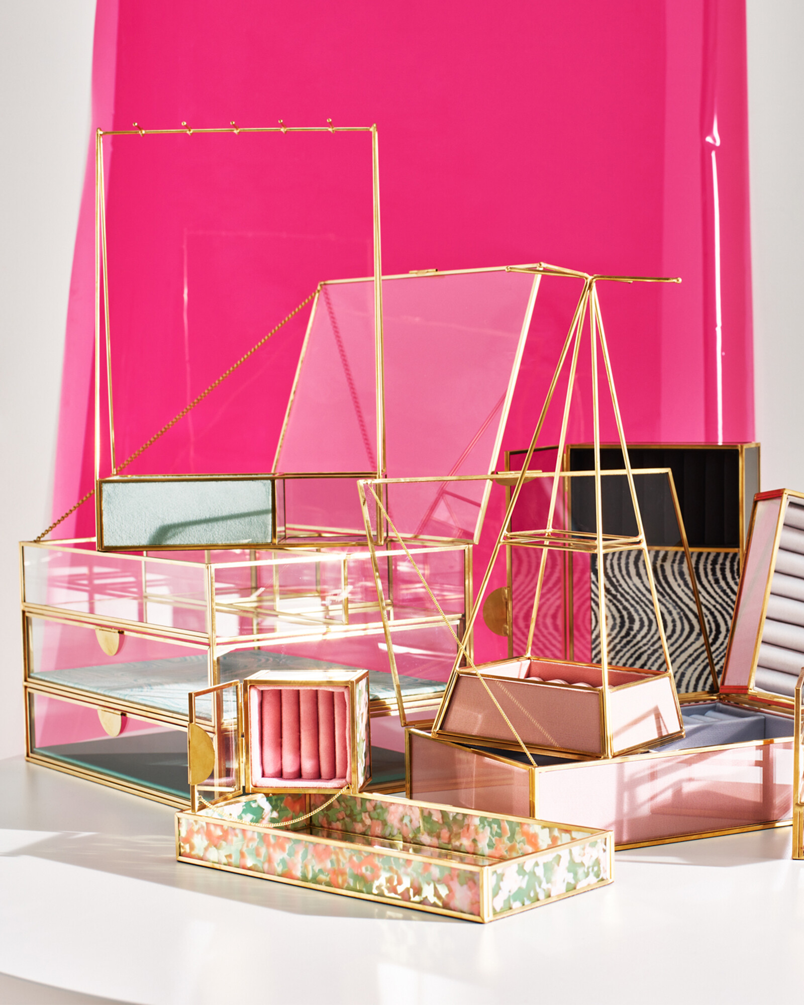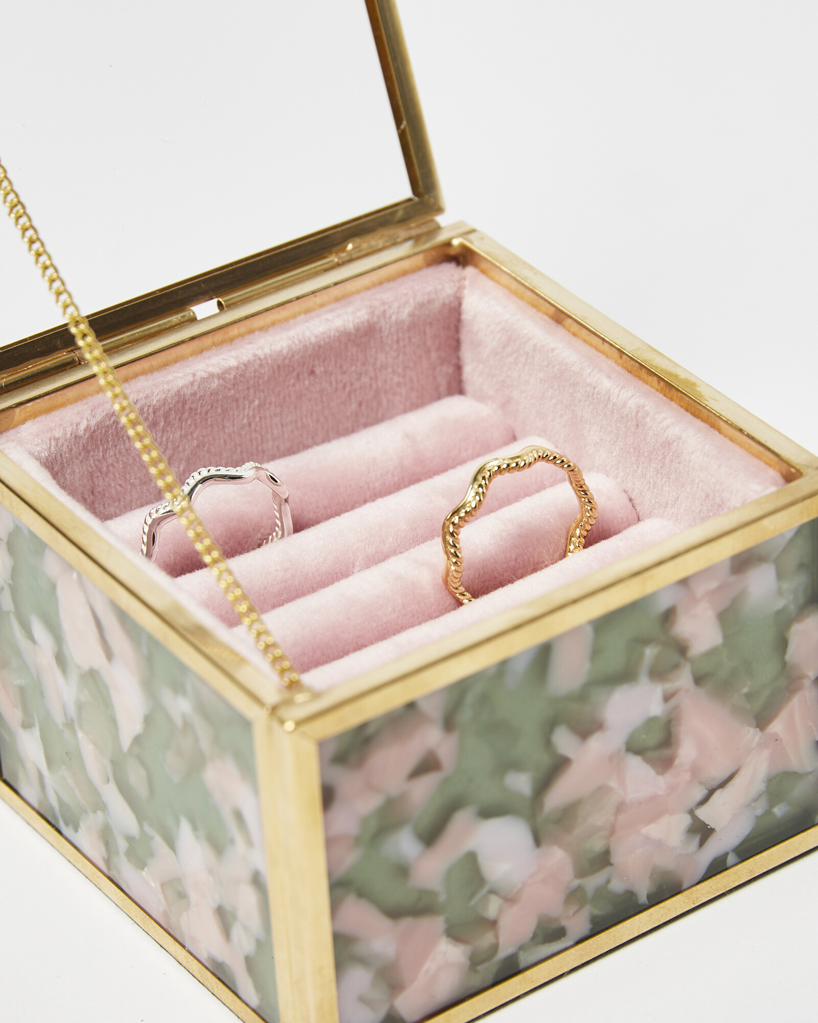 Compact ring box with a slim gold frame, clear glass and green & pink terrazzo-style resin. Slot your rings into the pink velvet compartments.