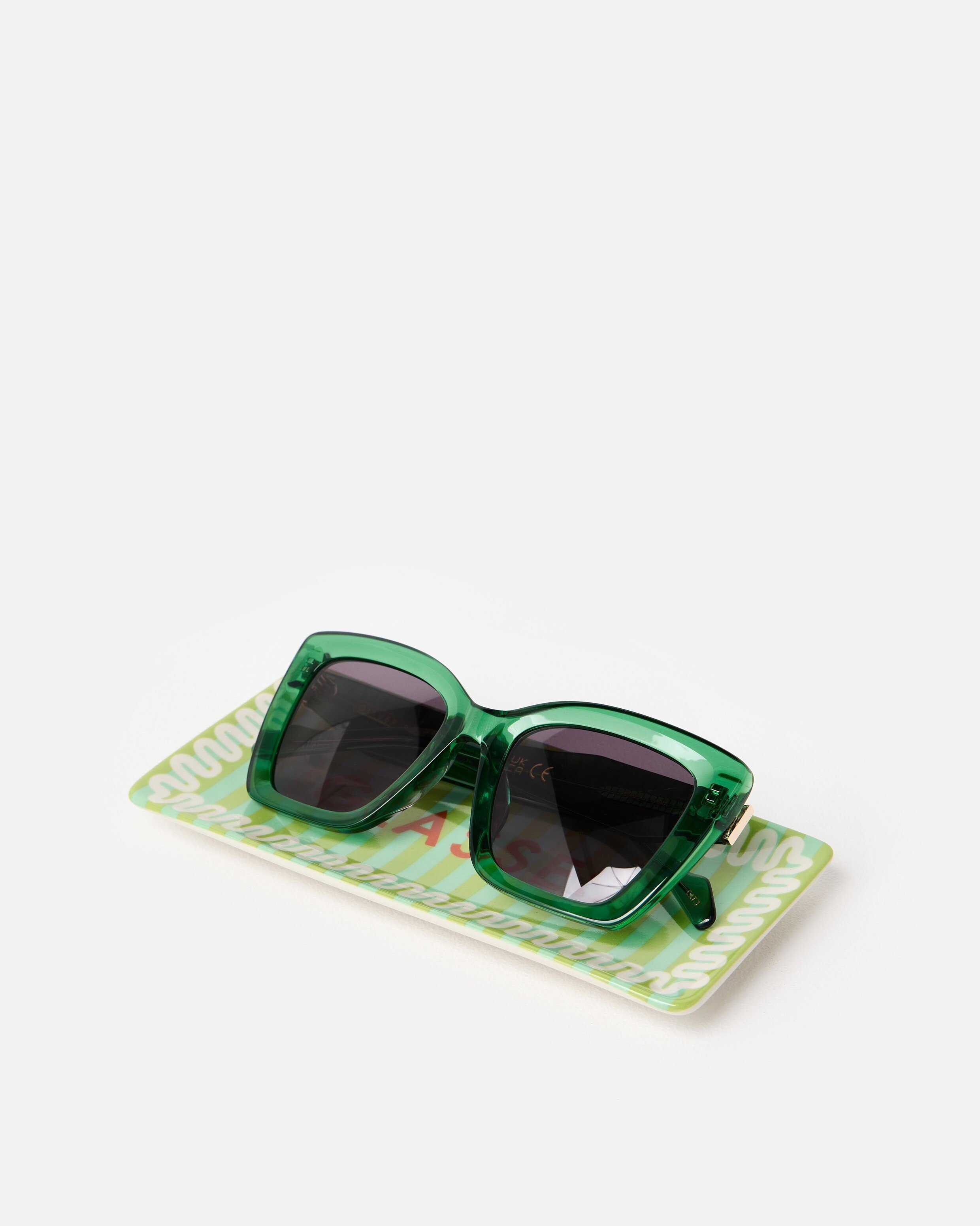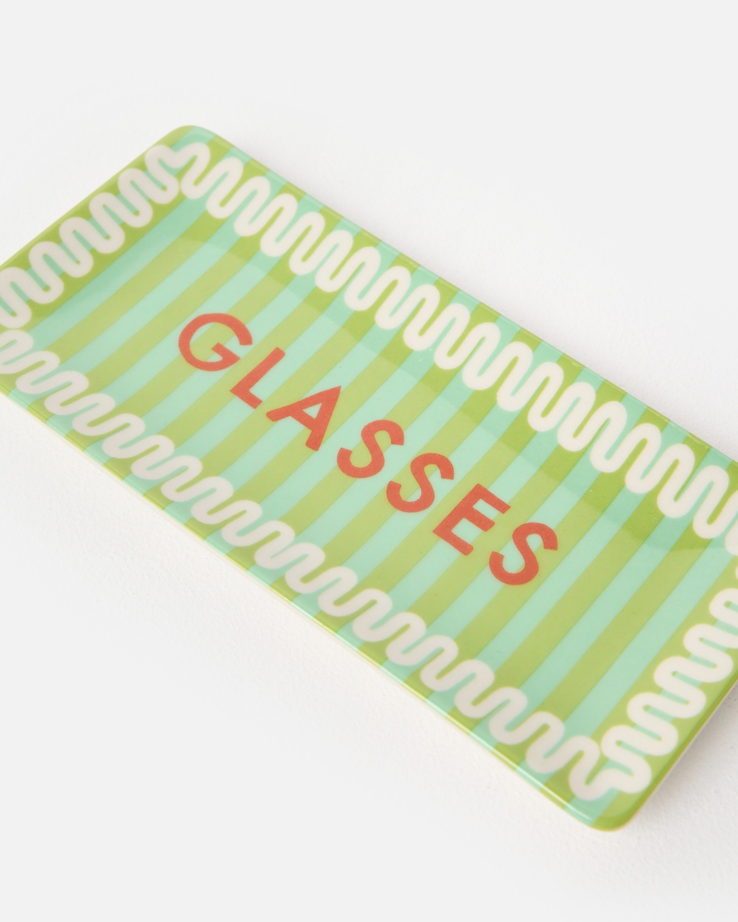 Patterned rectangular ceramic glasses tray with a blue and green vertical stripe, a contrasting white zigzag border, and 'Glasses' in bold red lettering across the centre. This glasses tray can be placed on a side table in your living room or at your bedside for easy access, and could be used to store reading glasses, sunglasses or other small items as a trinket dish.