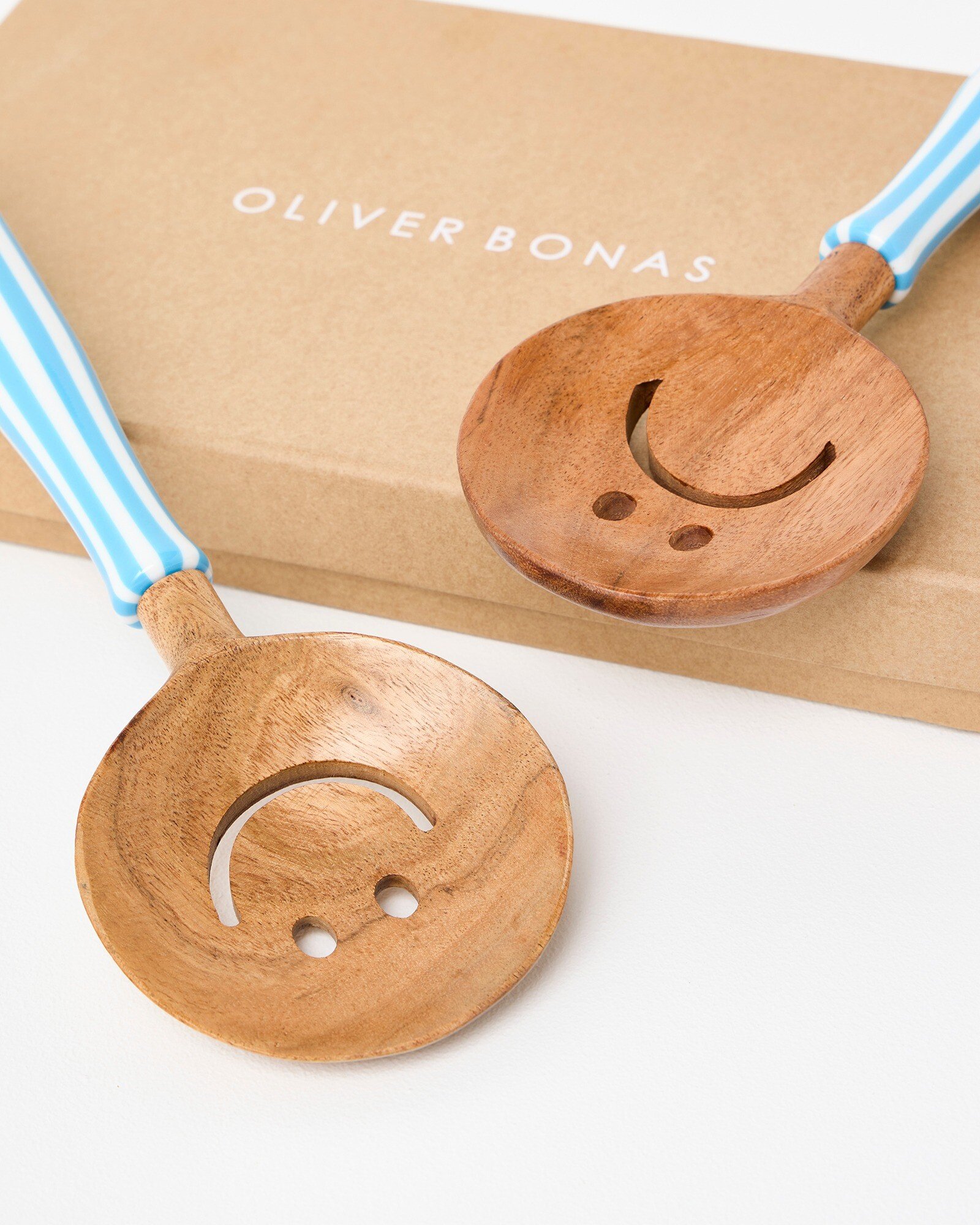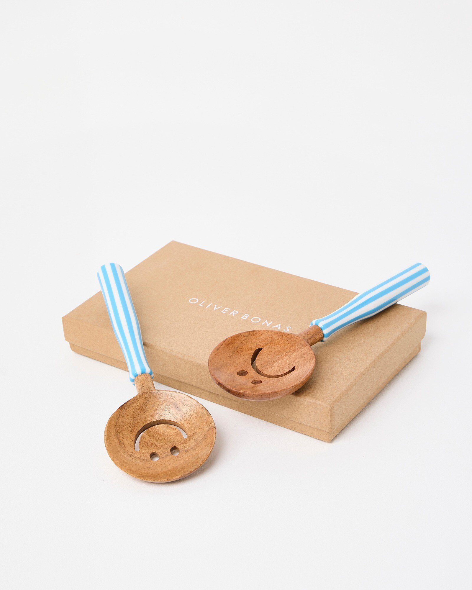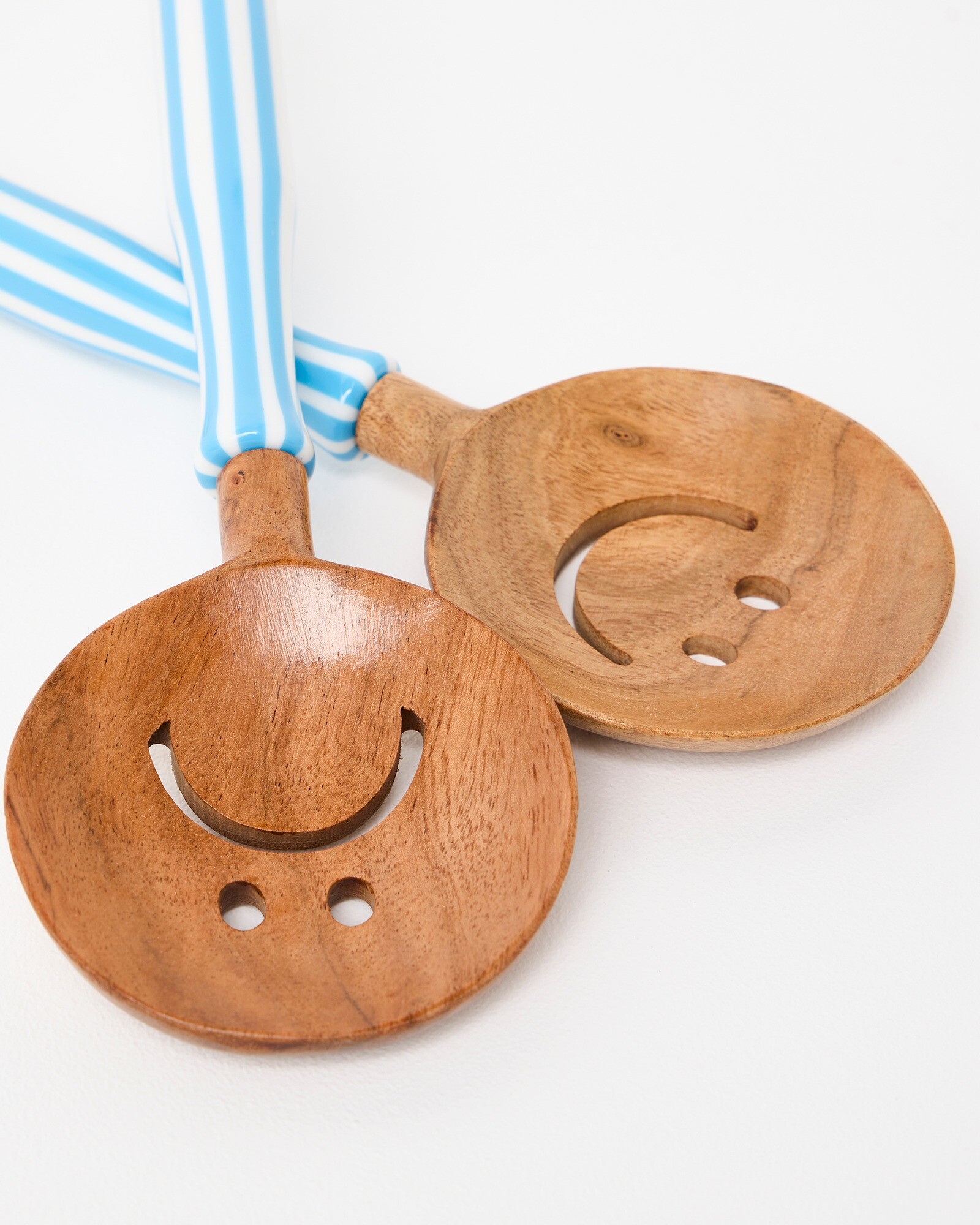 Set of two joyful salad servers made from a smooth, natural wood, with blue and white striped handles and cut out happy and sad face motif on each spoon. This set of two wooden salad servers arrives in a custom brown gift box, making an ideal housewarming, birthday or Christmas gift for friends and family members. Be sure to use for summer hosting alongside your other tableware pieces for a pop of colour.