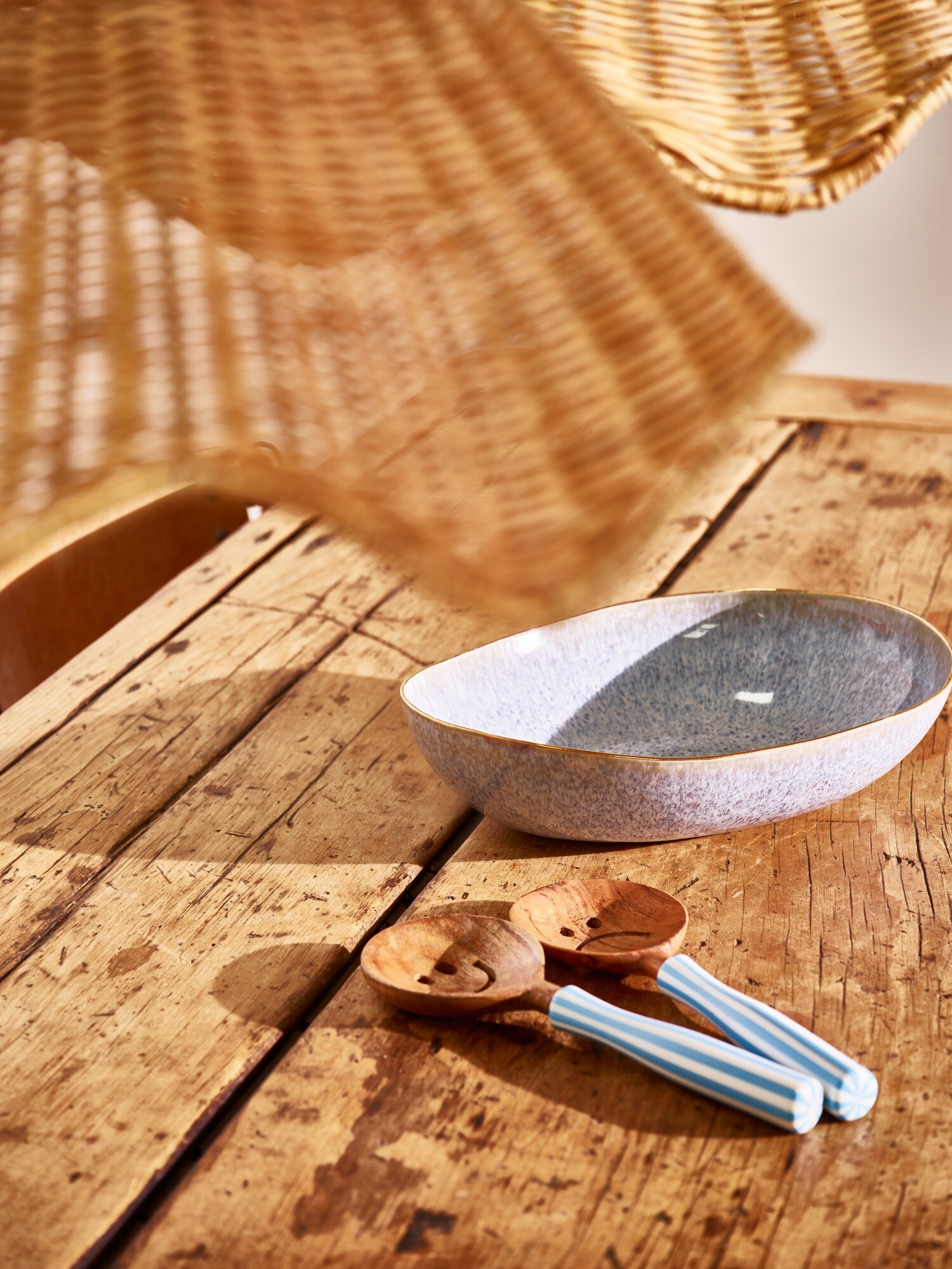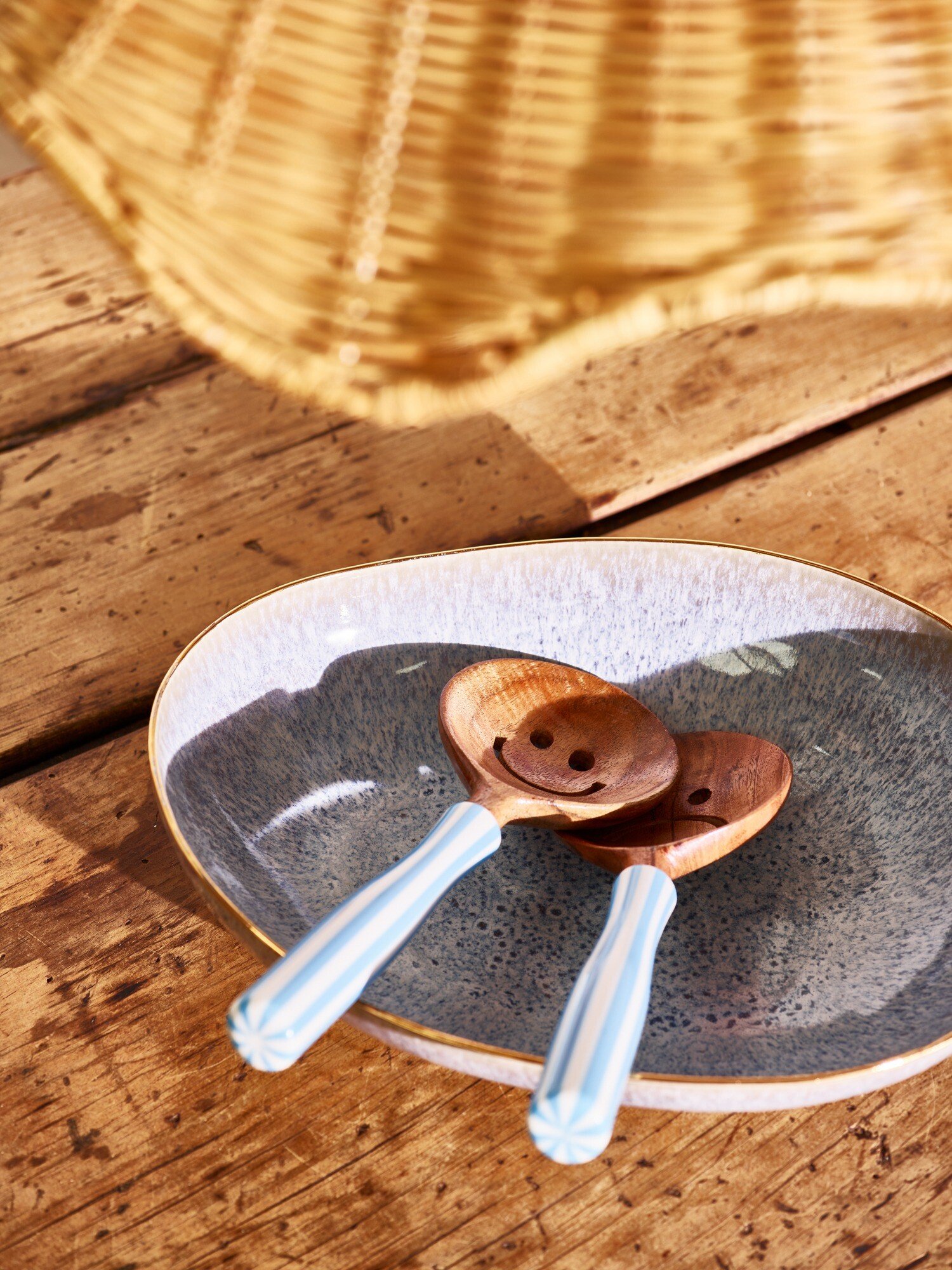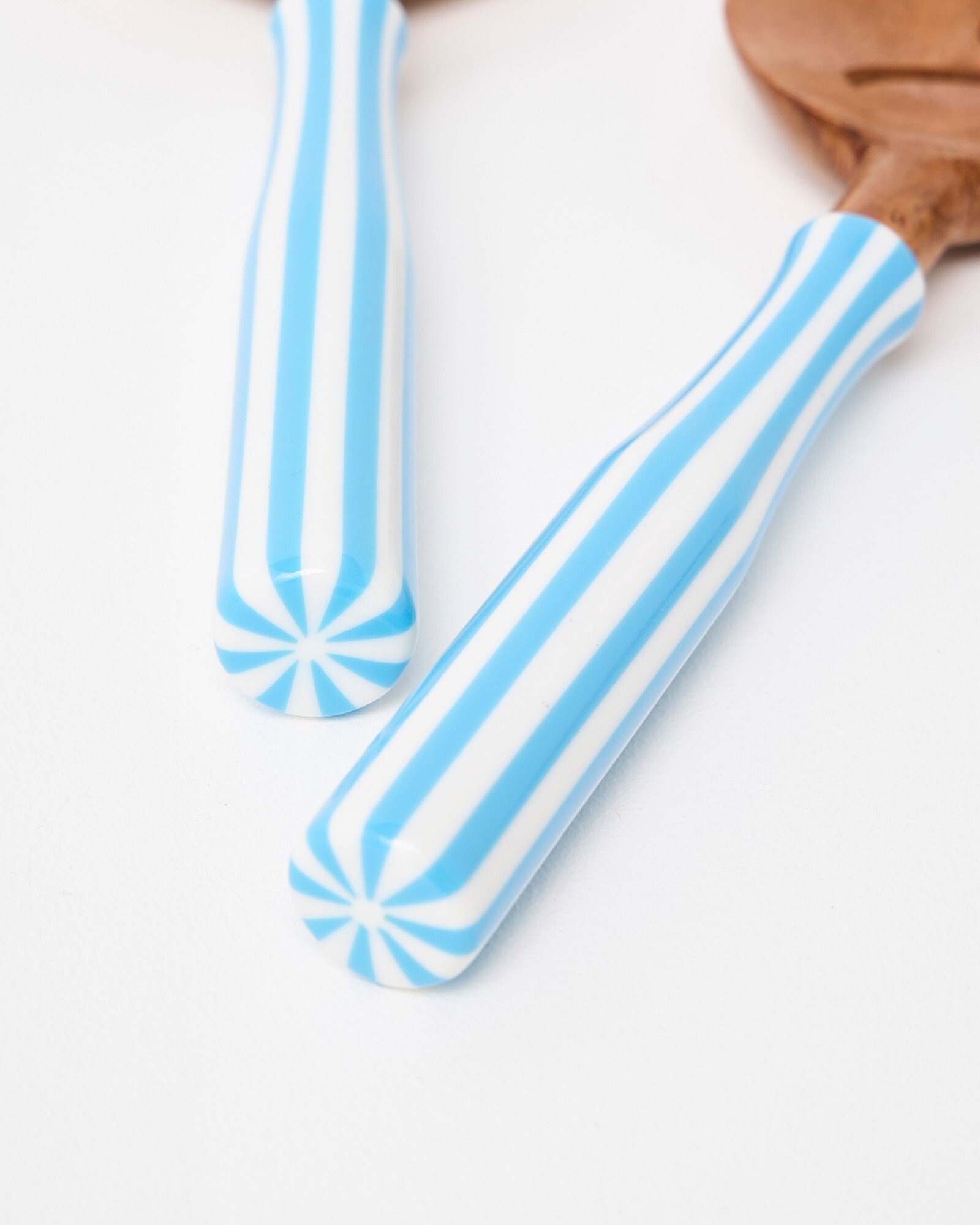 Set of two joyful salad servers made from a smooth, natural wood, with blue and white striped handles and cut out happy and sad face motif on each spoon. This set of two wooden salad servers arrives in a custom brown gift box, making an ideal housewarming, birthday or Christmas gift for friends and family members. Be sure to use for summer hosting alongside your other tableware pieces for a pop of colour.