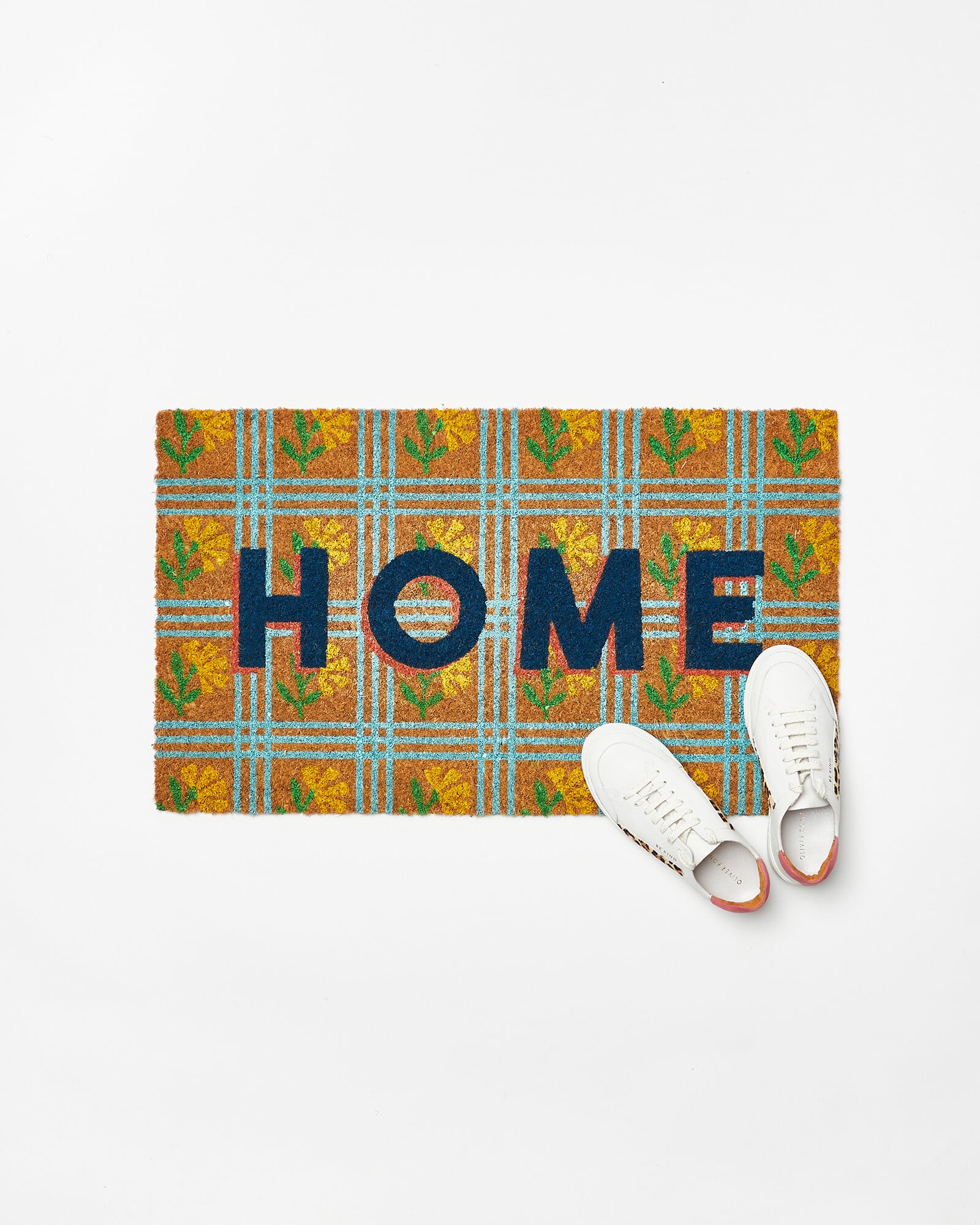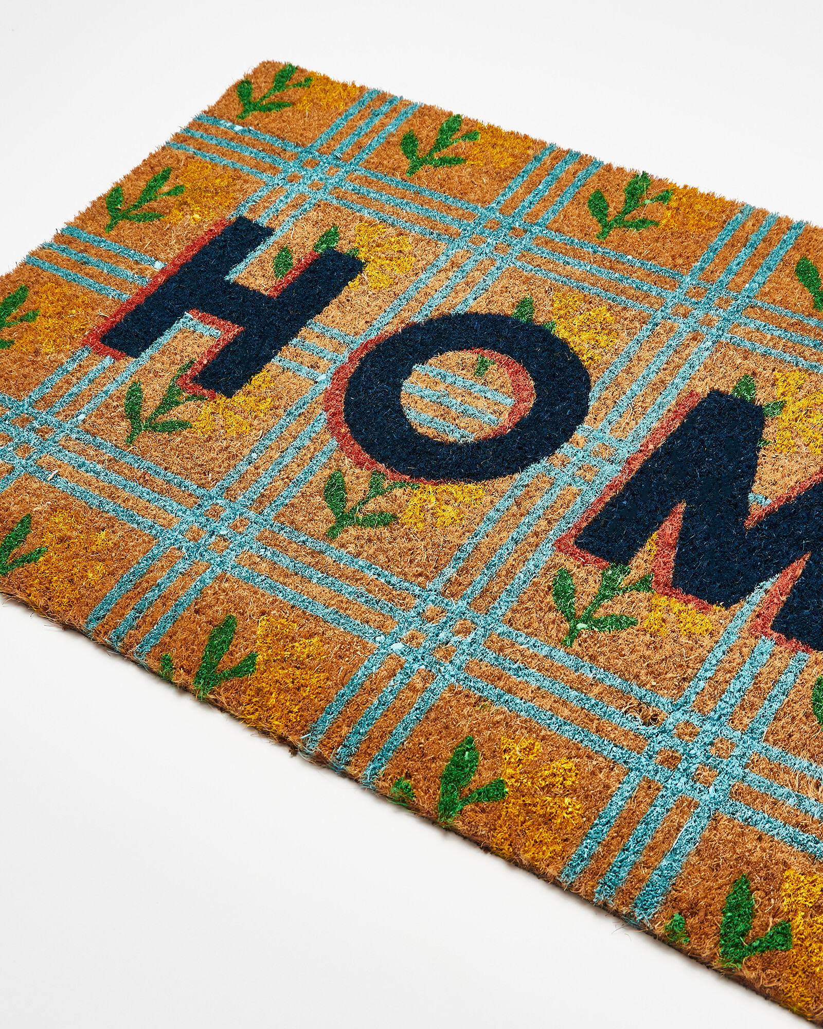 Give yourself a warm welcome home with this fun and vibrant doormat. With a tile inspired floral print in shades of yellow and green, it reads 'home' in the centre in navy type.