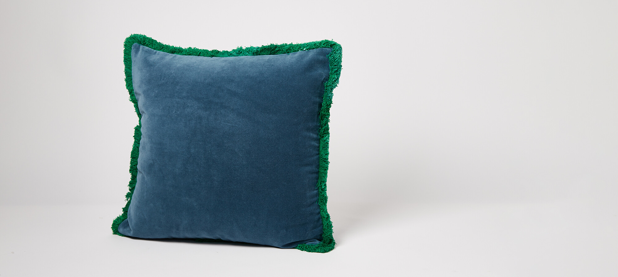 Add tactility to your home with the Issey Cushion Cover in soft blue velvet with green fringing. Add a separate cushion inner to complete the look.