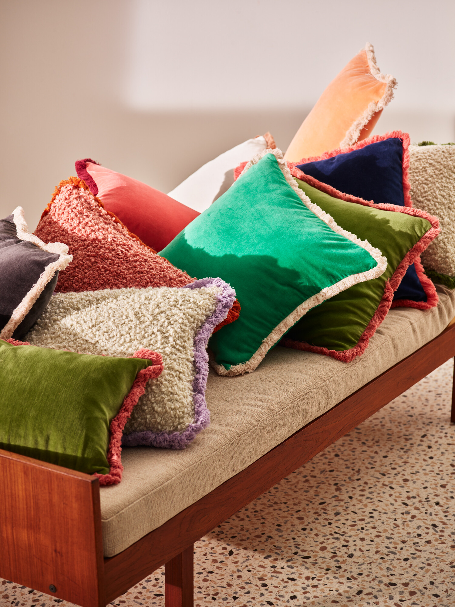 Add tactility to your home with the Issey Cushion Cover in soft green velvet with pink fringing. Add a separate cushion inner to complete the look.