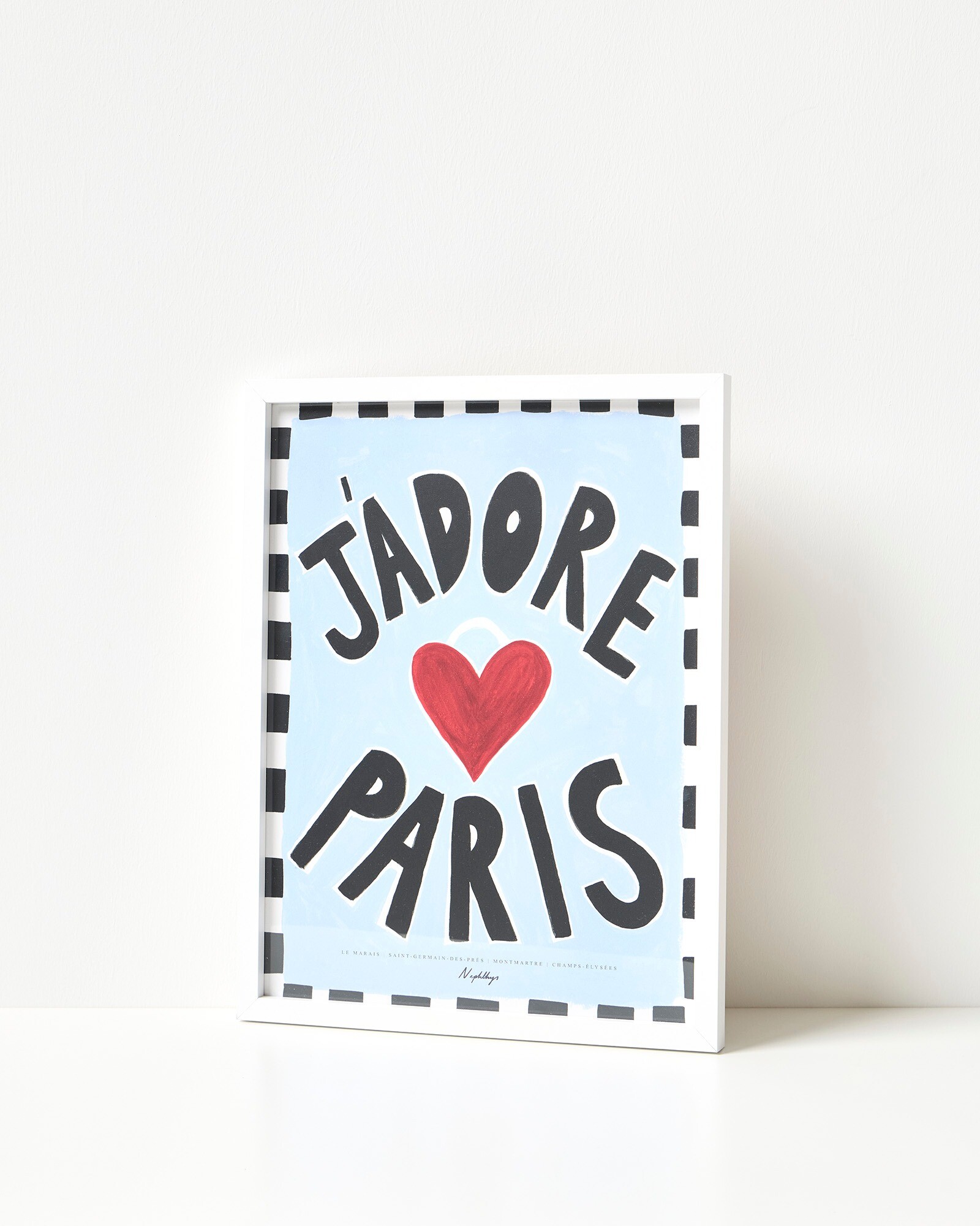 Bold wall art with a joyful J'Adore Paris print in a white wooden frame, designed by illustrator Nephthys Foster. Featuring a monochrome stripe border, red heart motif and light blue background, this framed wall art print is 30x40cm in size, the perfect living room wall art size for adding a Parisian feel to your room décor.