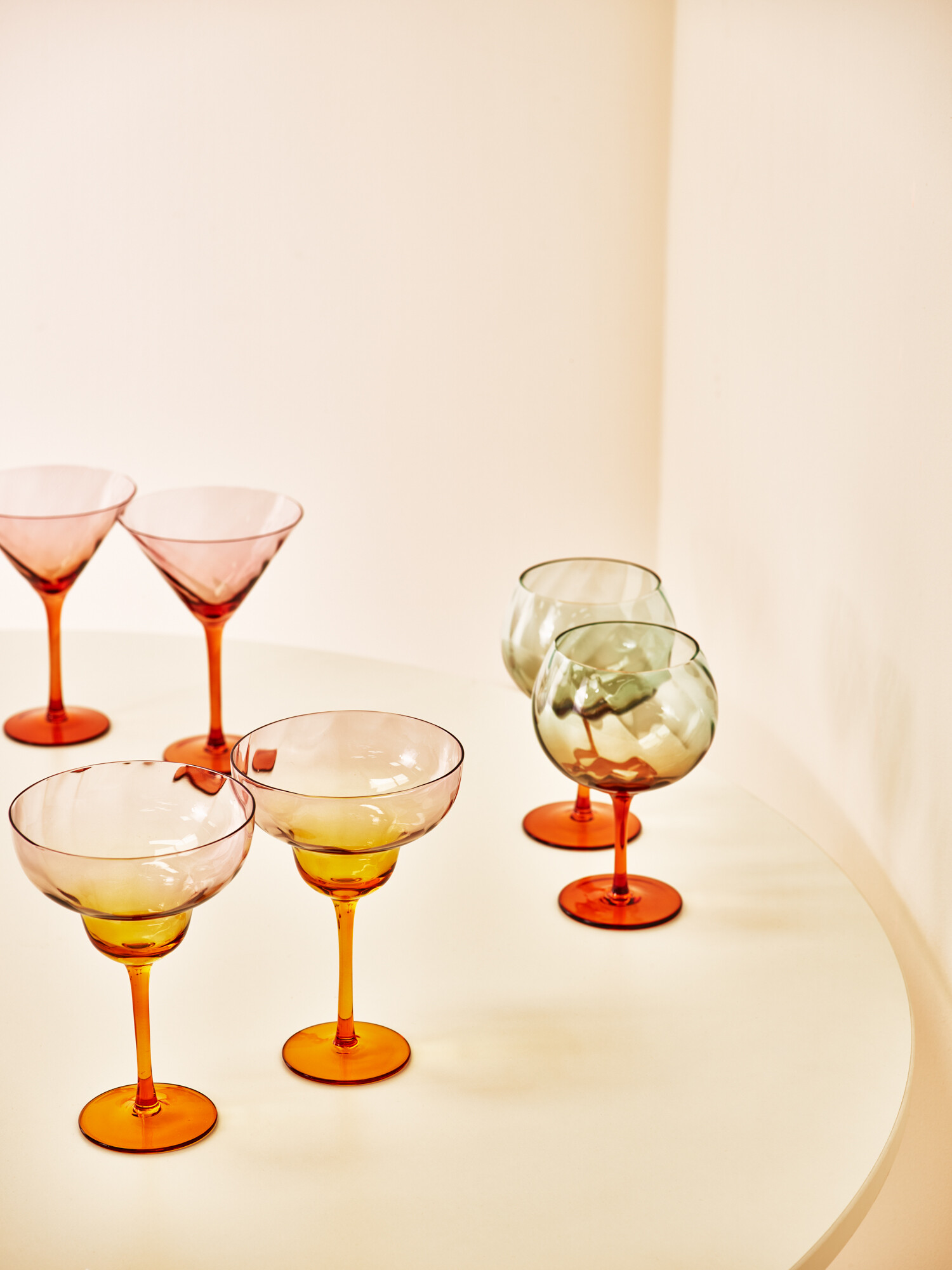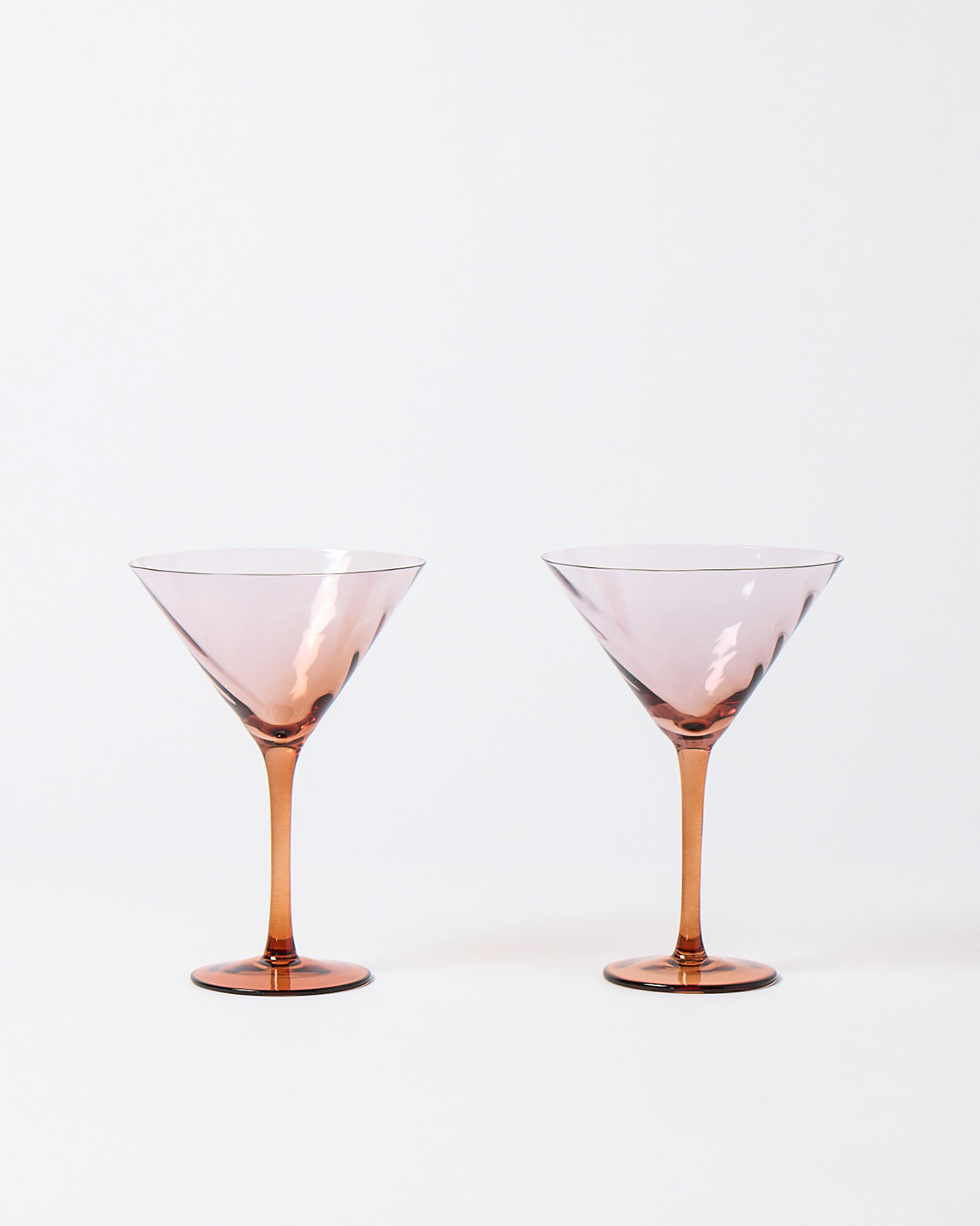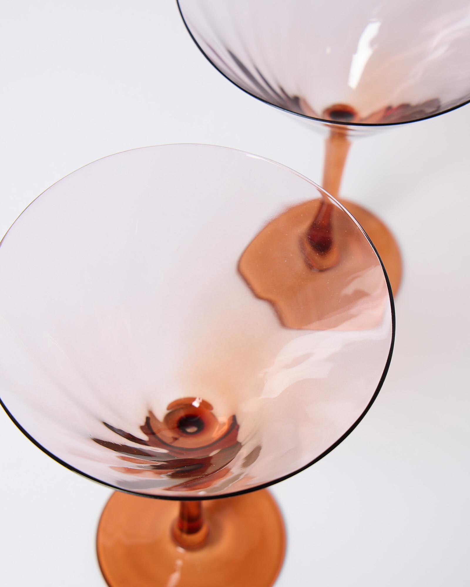 Two martini glasses pairing a traditional shape with a coloured ombre palette and subtle swirl in the bowl of the glass.