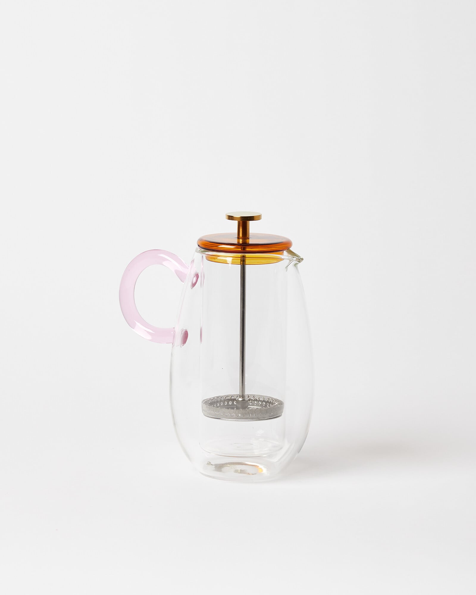 Pairing rounded silhouettes with vibrant colours, our Kona glassware collection is designed to brighten your mornings. Made from clear glass, this cafetiere has a pink handle and contrasting amber toned lid, complete with a stainless steel sieve.