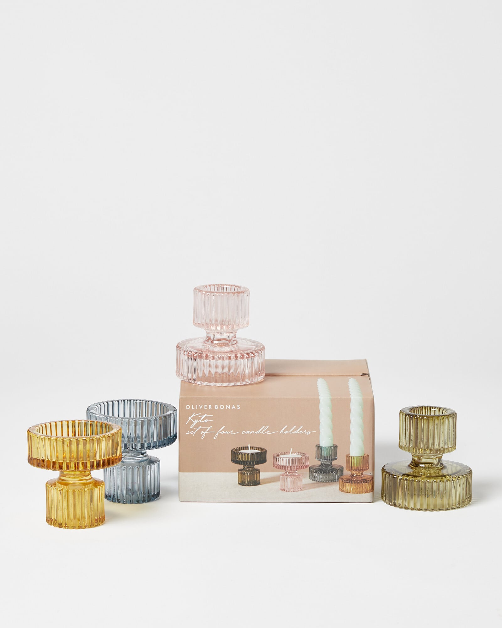 Decorate your table for a dinner party or add intention to a bubble bath with the Kyto Candlestick Holders. In a double-sided design, this set of four comes in shades of olive green, golden yellow, sky blue and pale pink with artful ribbed details.