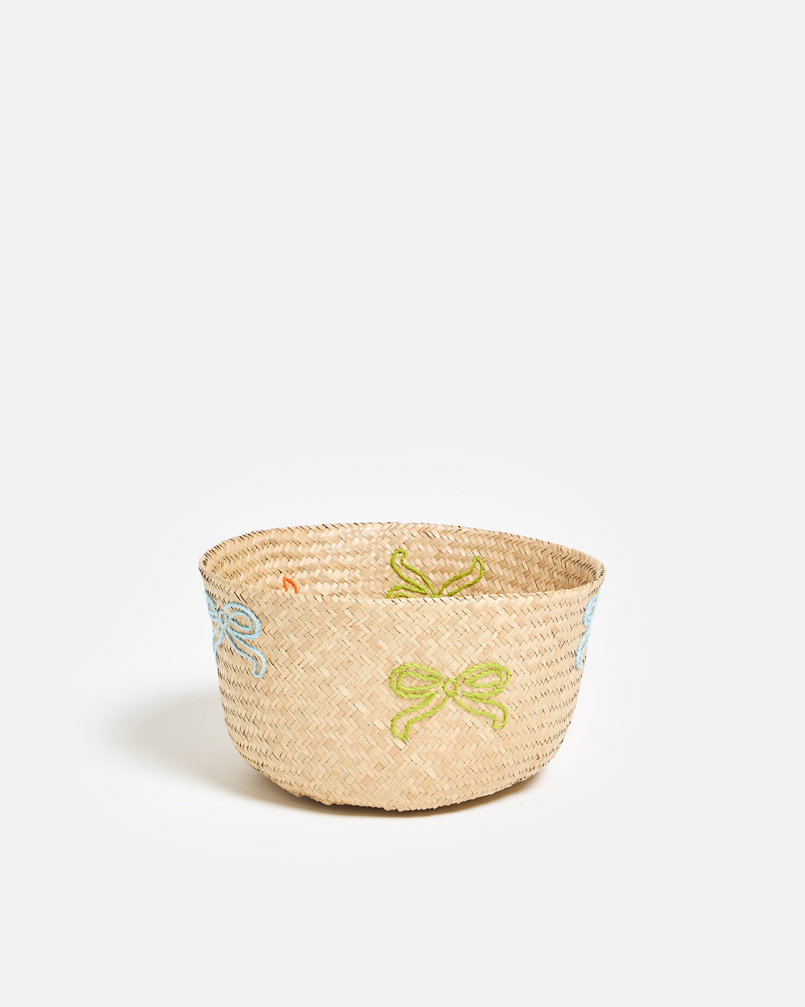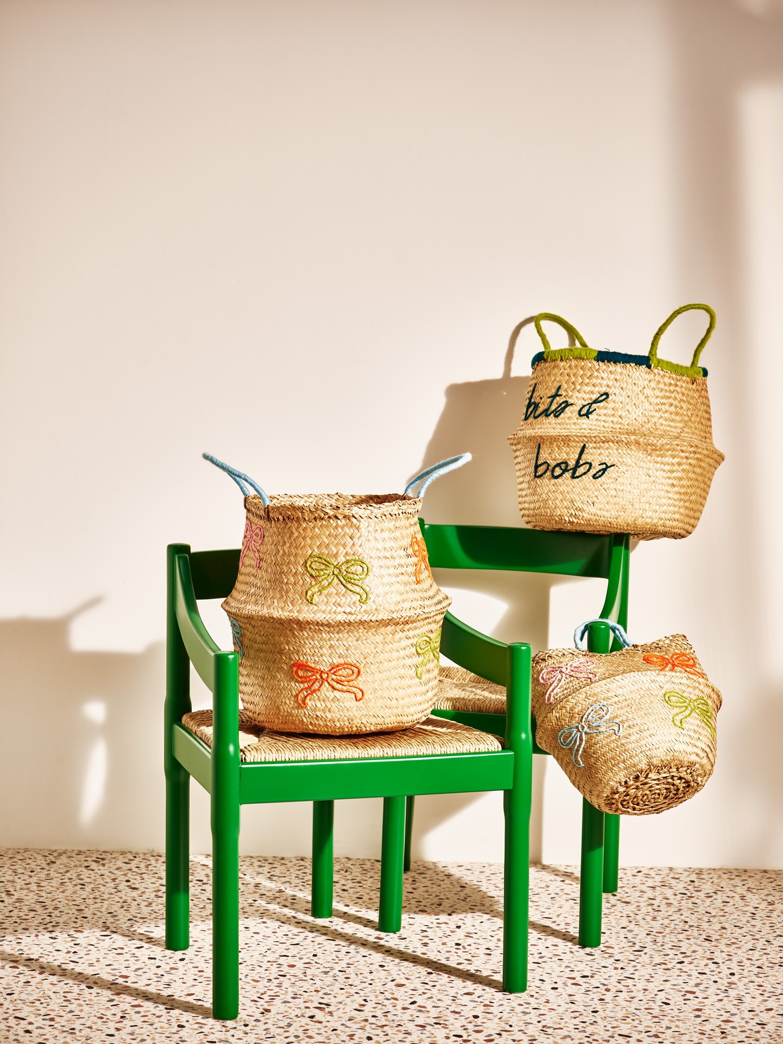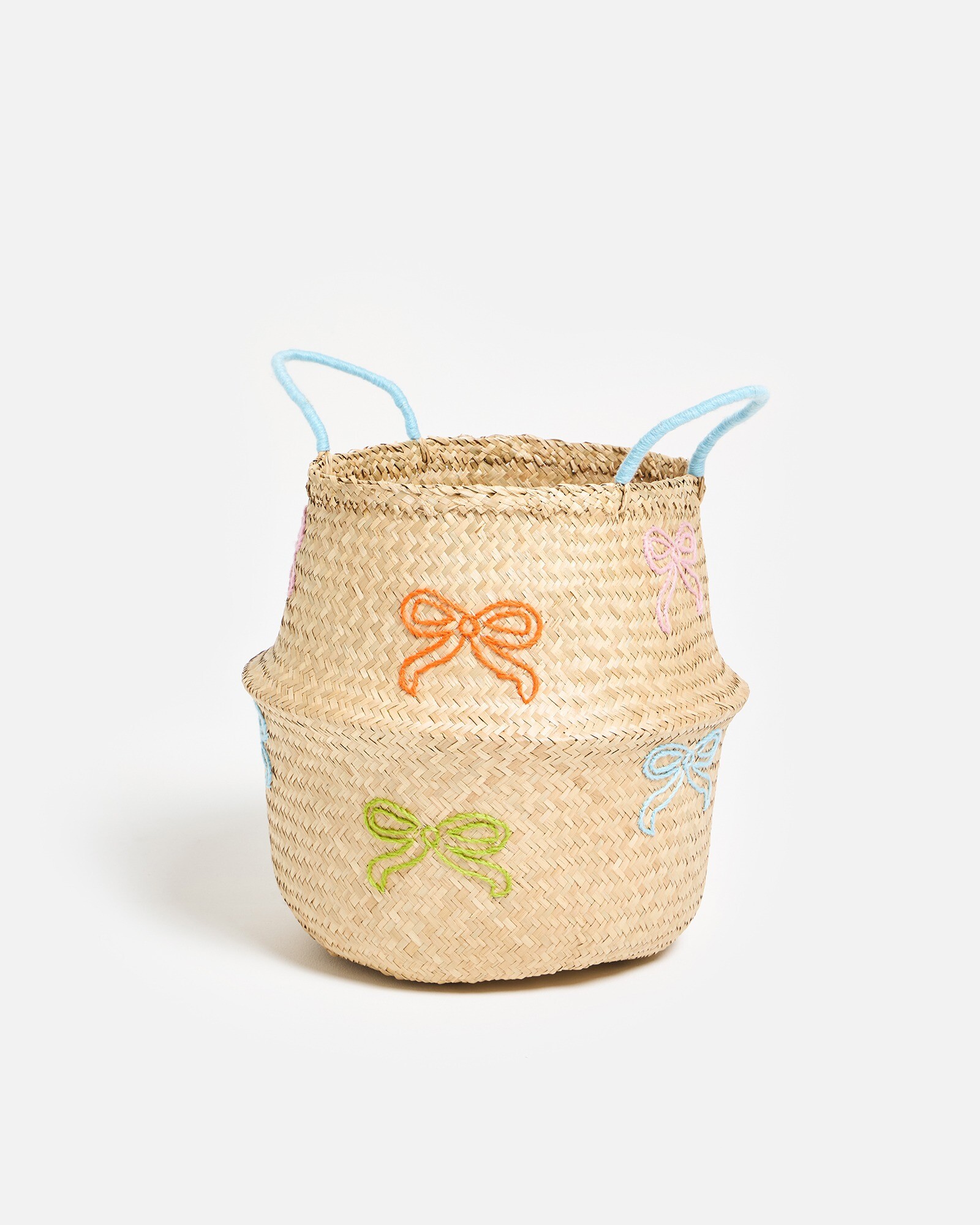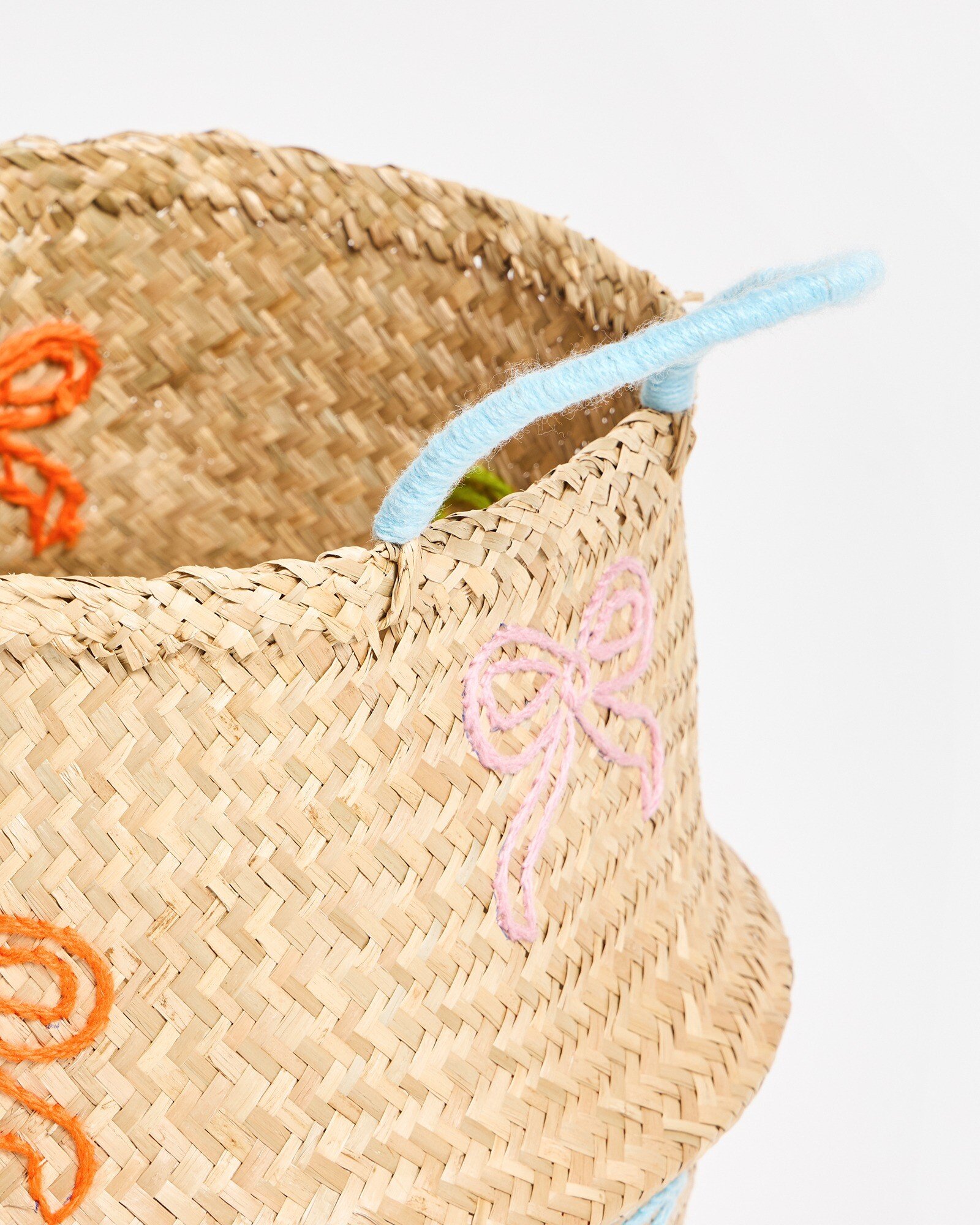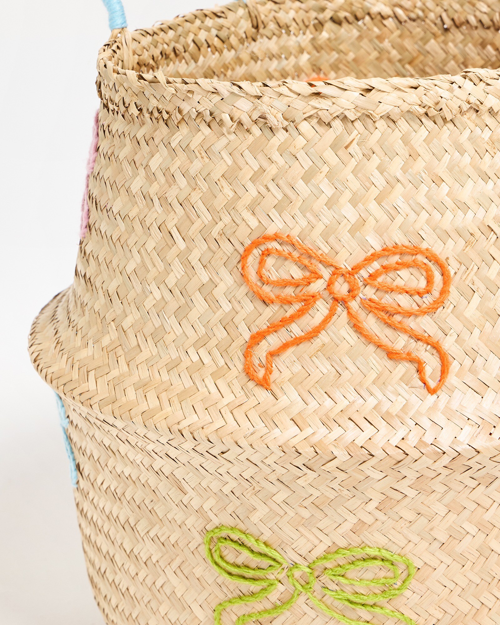 Made from a natural seagrass weave, this foldable large storage basket features embroidered multicoloured bow motifs and woven blue handles. Perfect for storing throws, blankets and small household bits and bobs, place this large storage basket in your bedroom or living room for a joyful addition to your home décor.