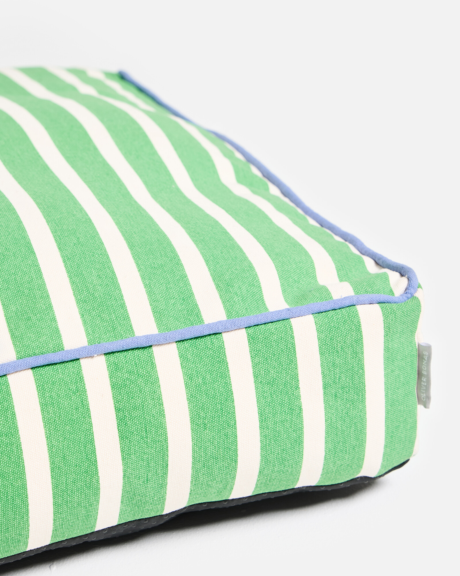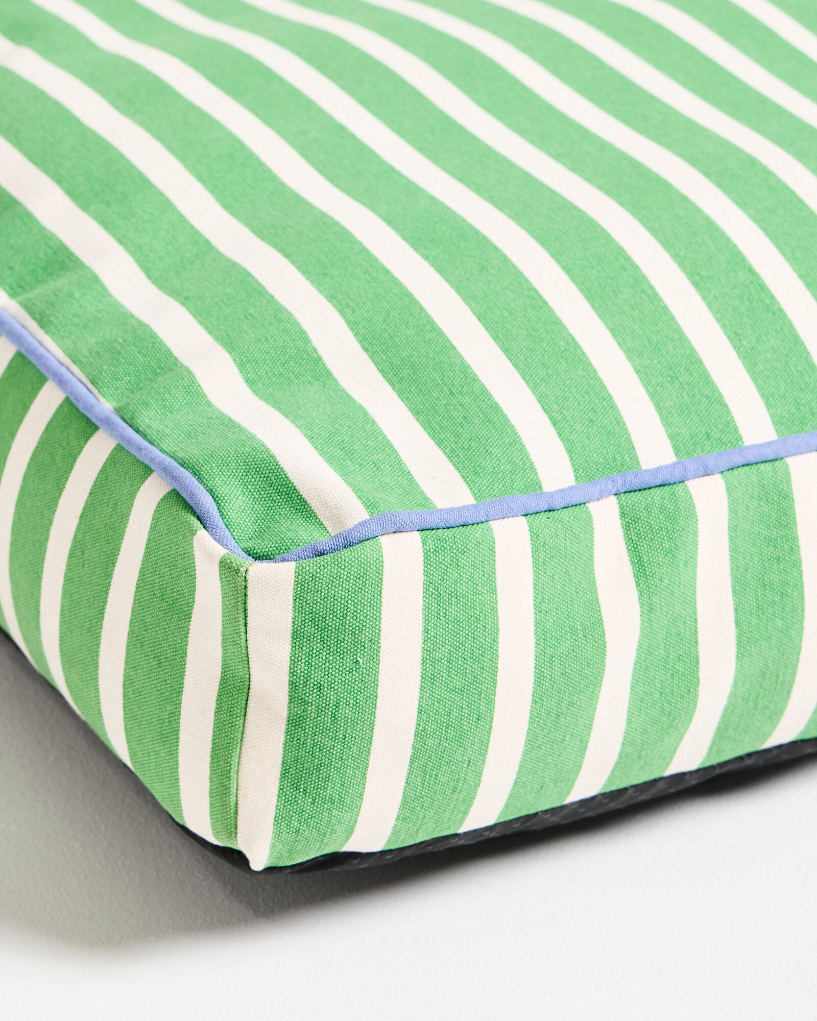 Fabric pet bed printed with a stripy green and white pattern with contrasting blue piping. With removable cushion inners & a zip closure, the bed outer can be easily removed and washed. Use as a floor cushion or add comfort to a sleeping crate, as the non-slip base will keep it in place.