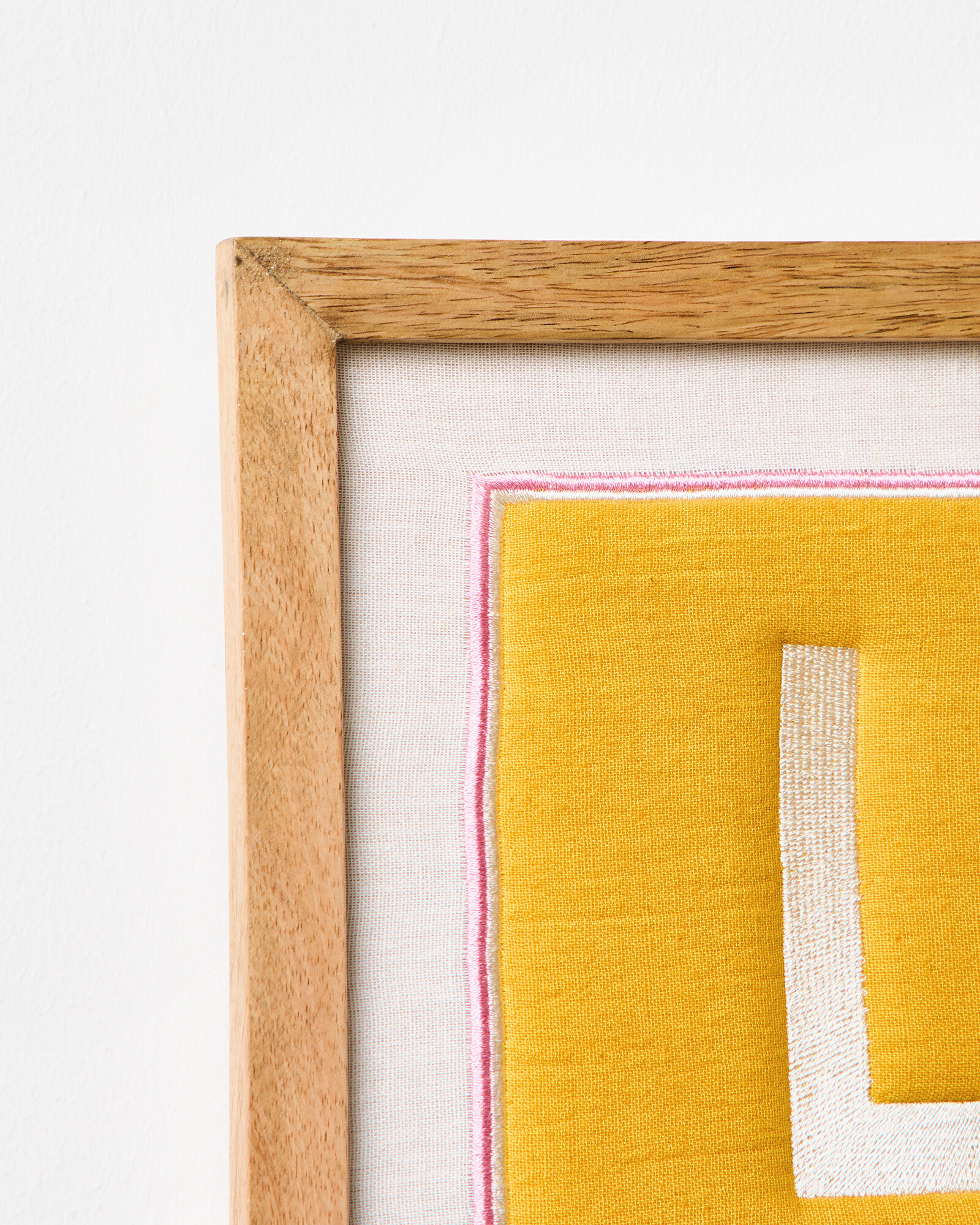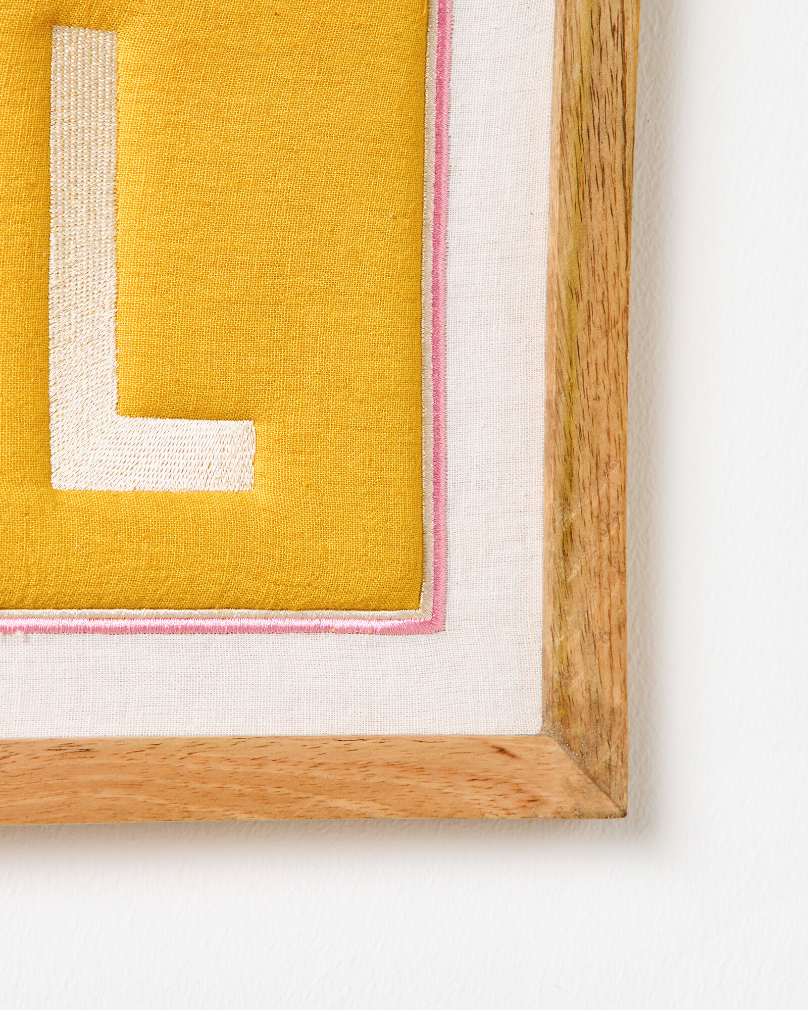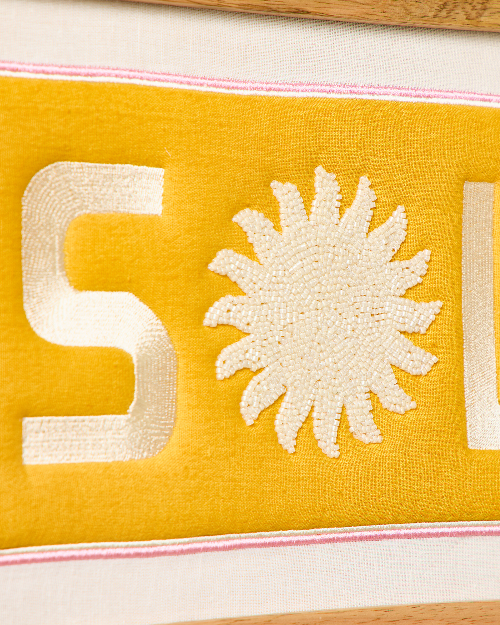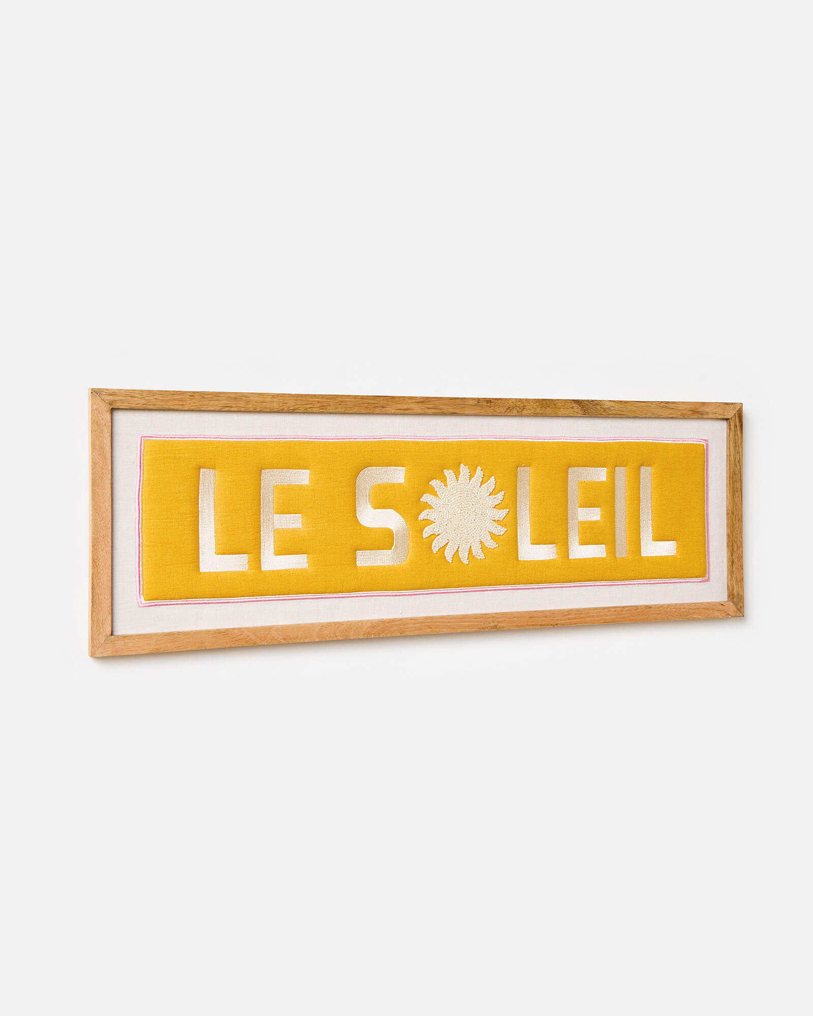 In a natural wooden frame, this landscape fabric wall art features 'Le Soleil' in gold embroidered lettering, with a beaded sun motif replacing the 'o'. The written motif sits in a yellow fabric rectangle, with a striped pink outline on a natural fabric border. Hang in your living room or hallway for a sunny pop of colour.