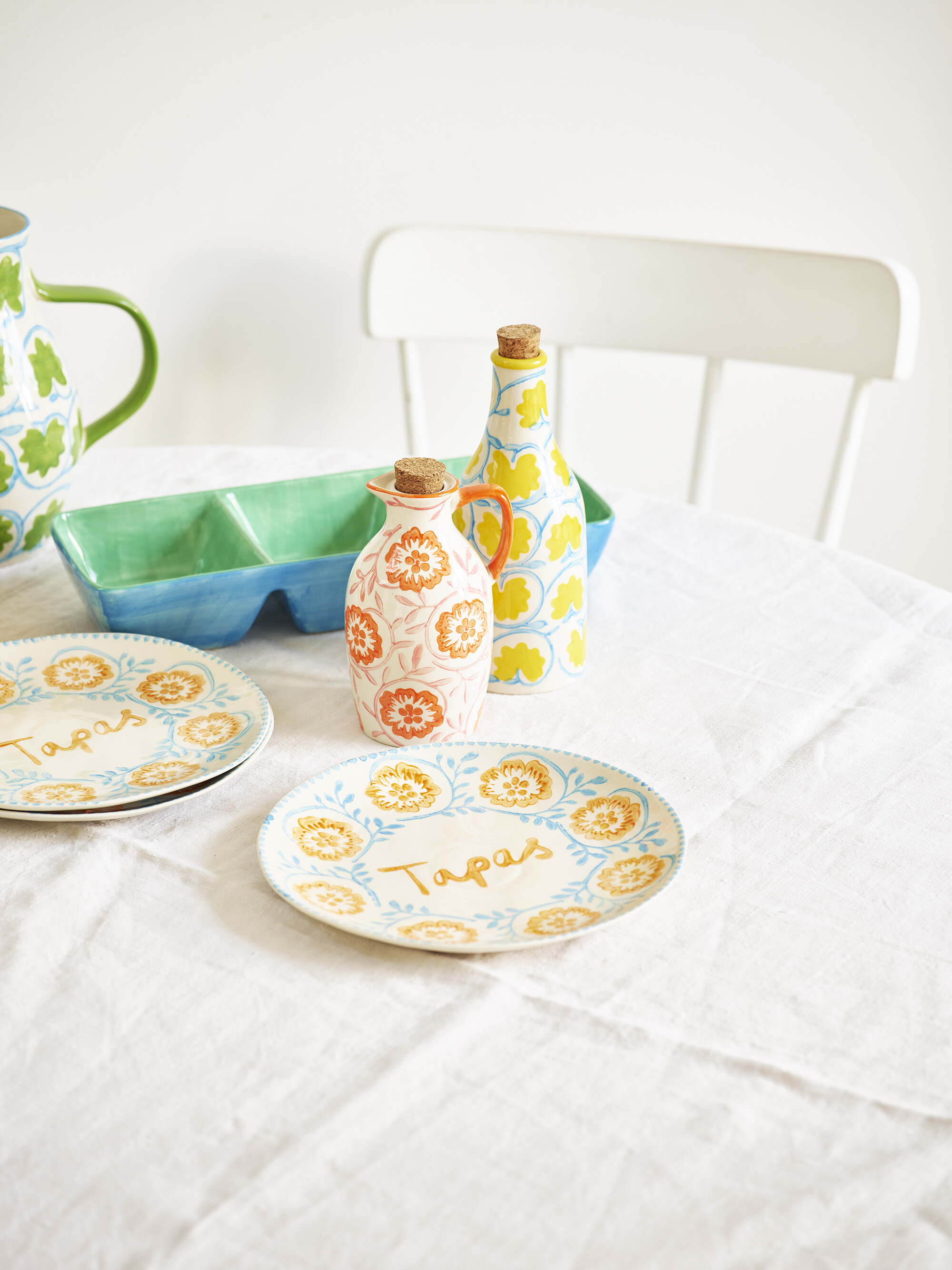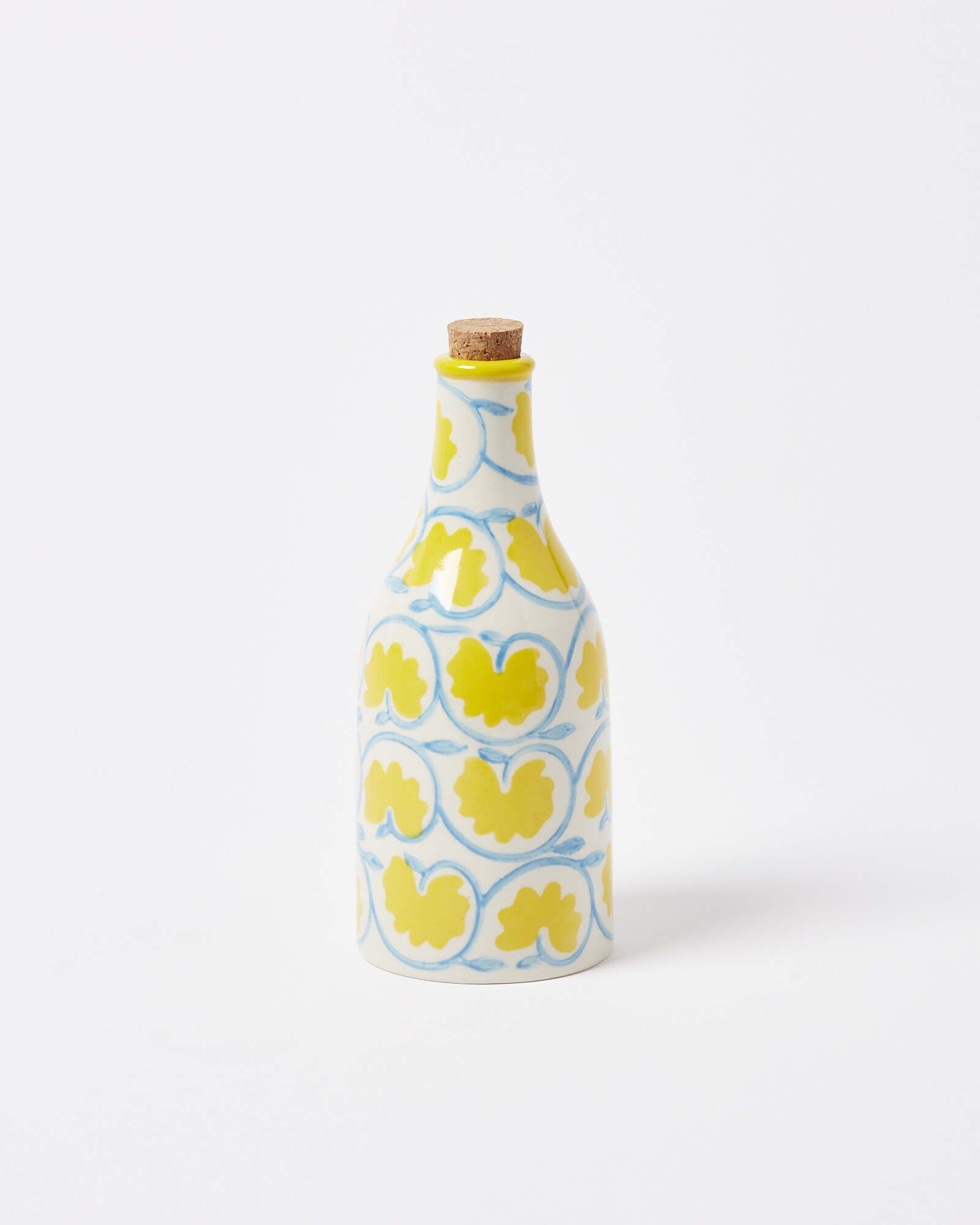 Elevate your serveware with this ceramic oil bottle. Adorned in a floral print in tones of yellow and blue, it sits in a traditional bottle silhouette, complete with a cork stopper for easy pouring.