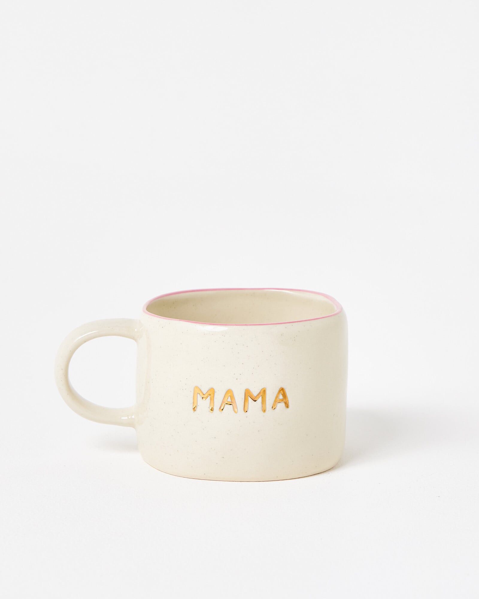 In a low, organic silhouette, this ecru mug features a speckled surface and 'mama' in gold debossed lettering. With a subtle pink rim and tactile finish, it's the perfect way for new mums to enjoy their morning cuppa and makes a thoughtful gift for Mother's Day, birthday's or any special occasion.