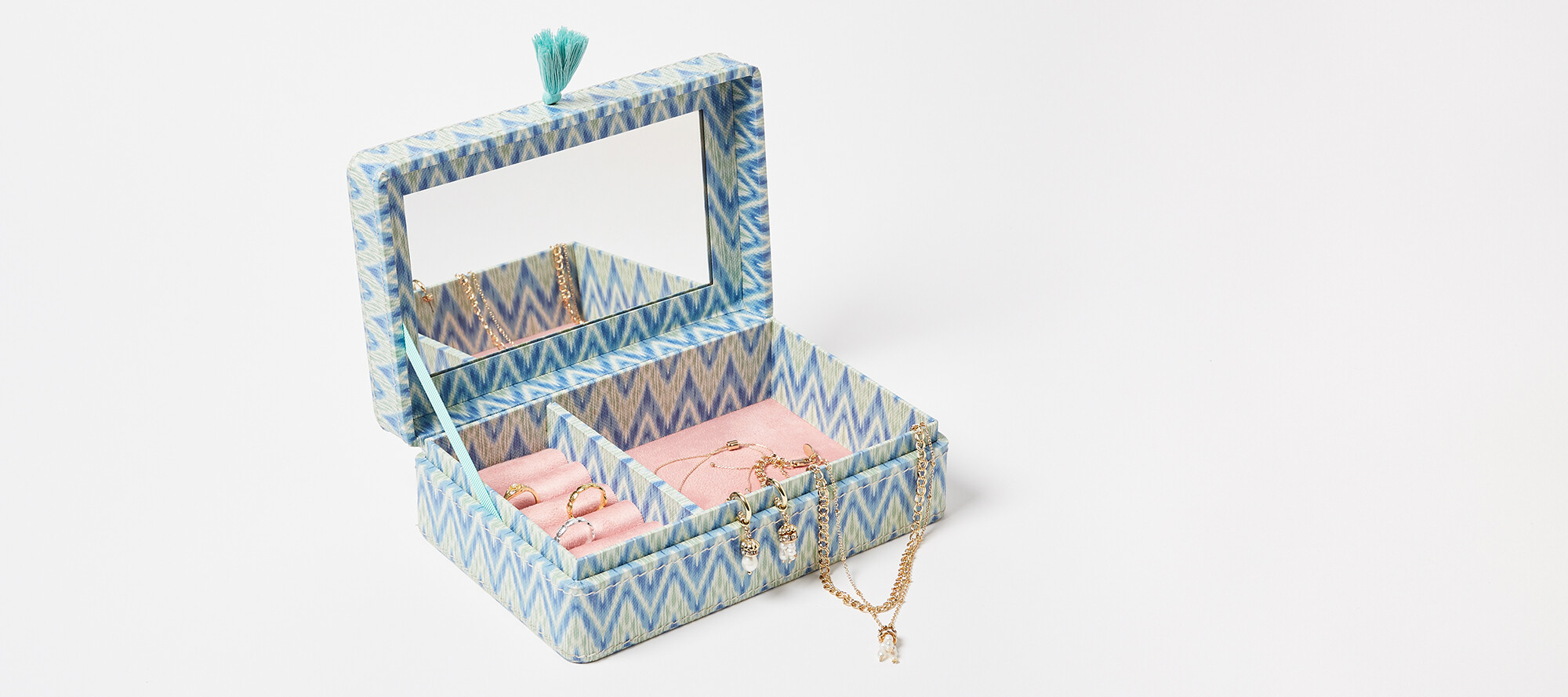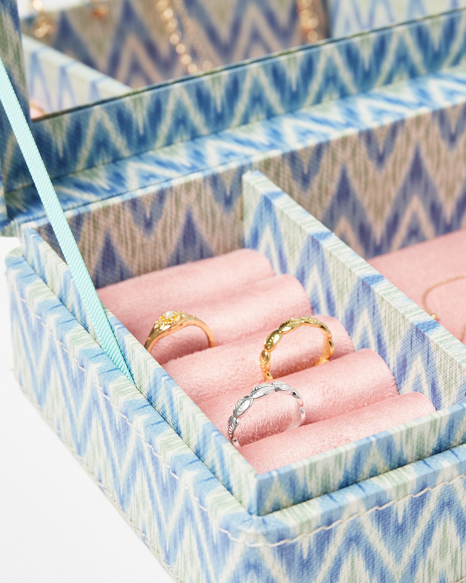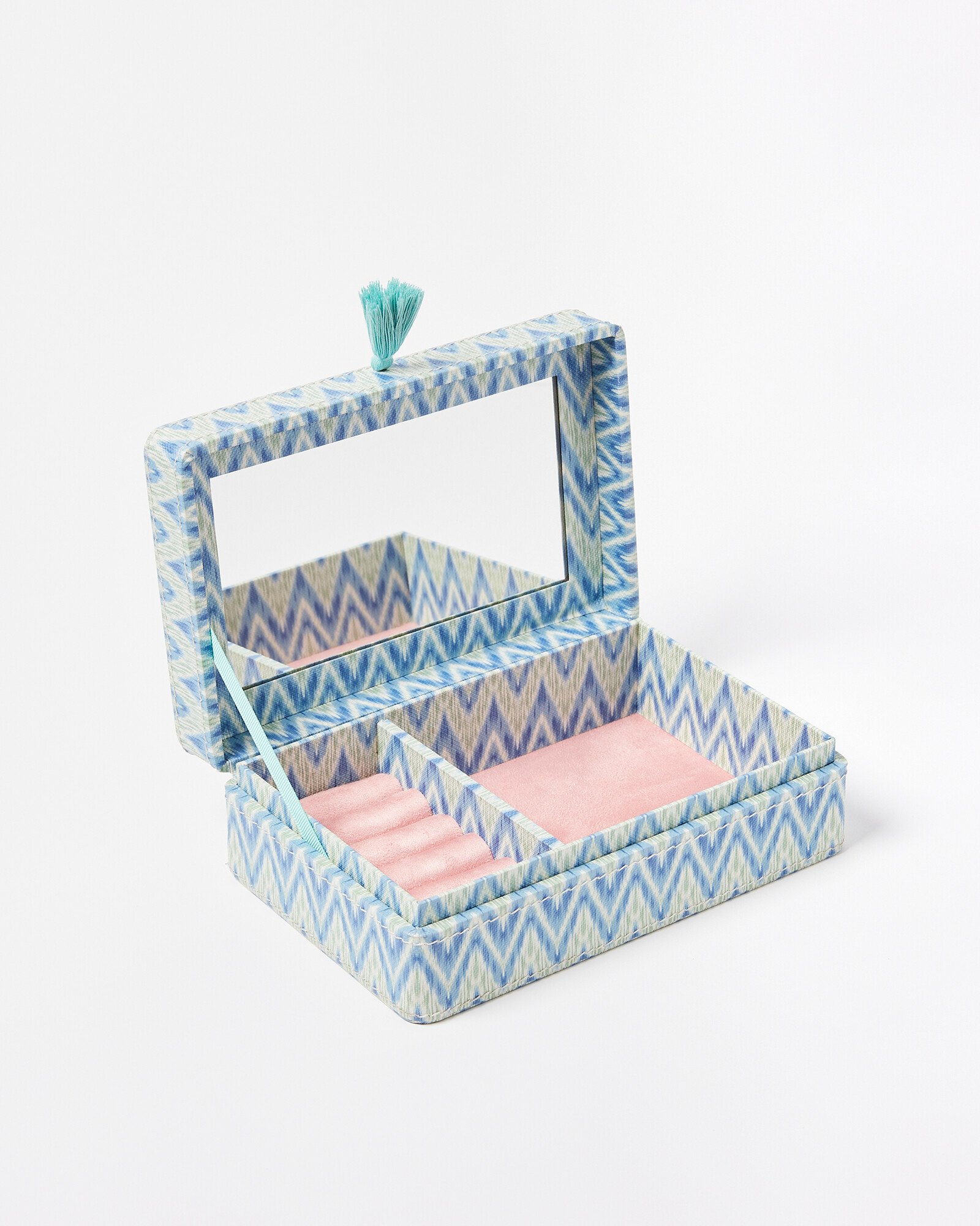 With a colourful print designed in-house, our Mica jewellery box is made from cotton fibres to create a soft, paper texture.