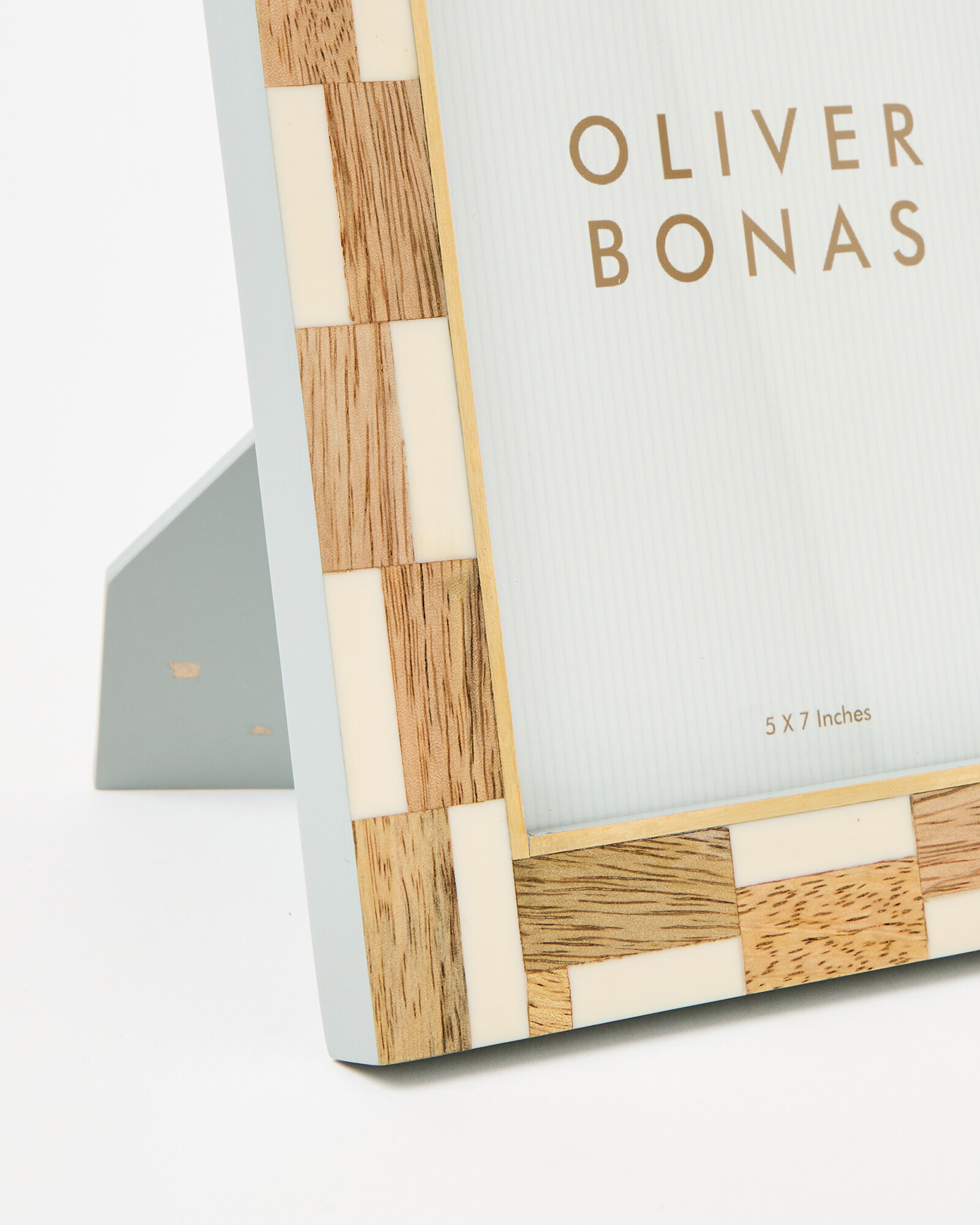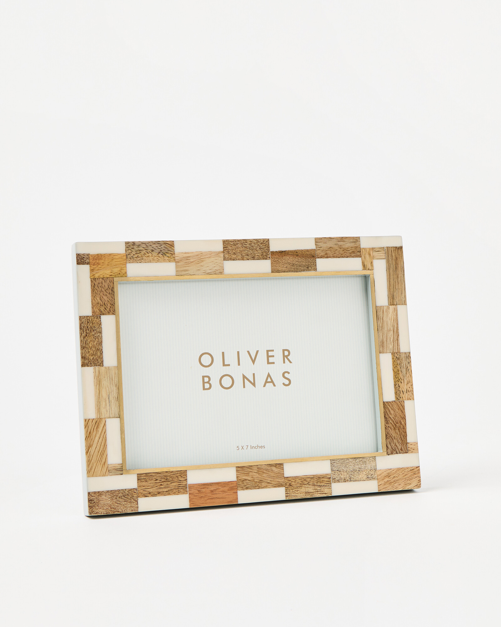 Neutral photo frame with a handmade mango wood, cream resin and brass chequerboard design.