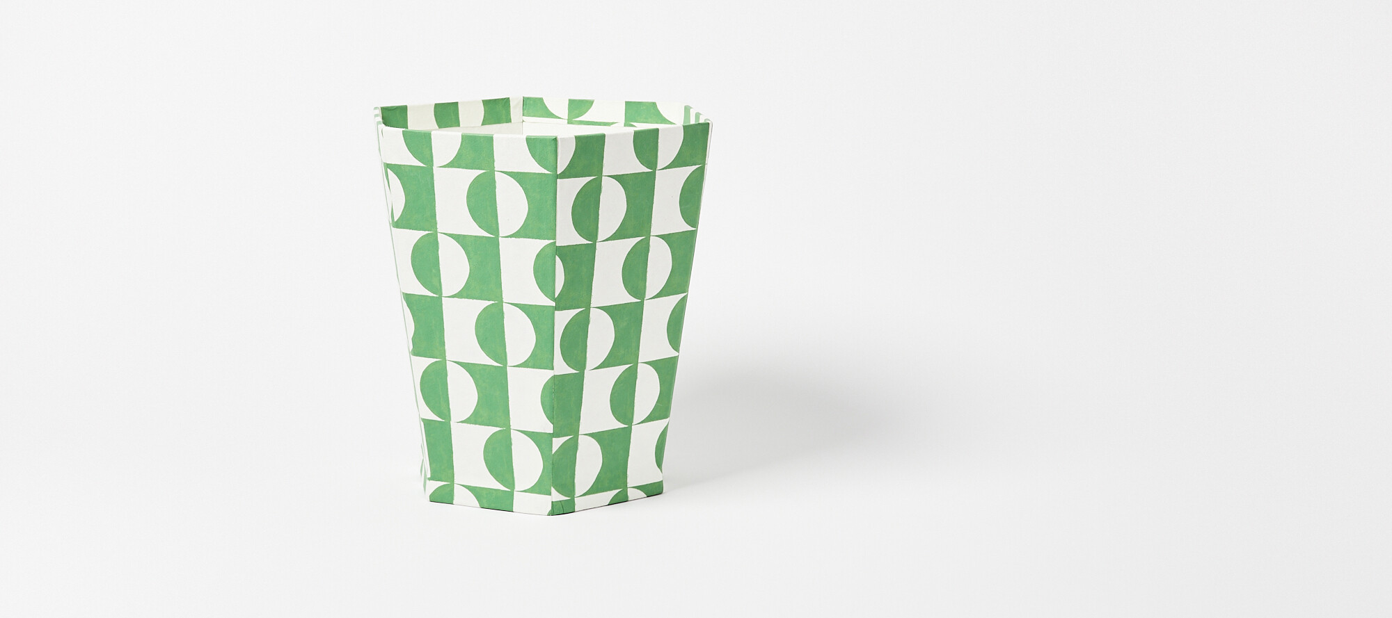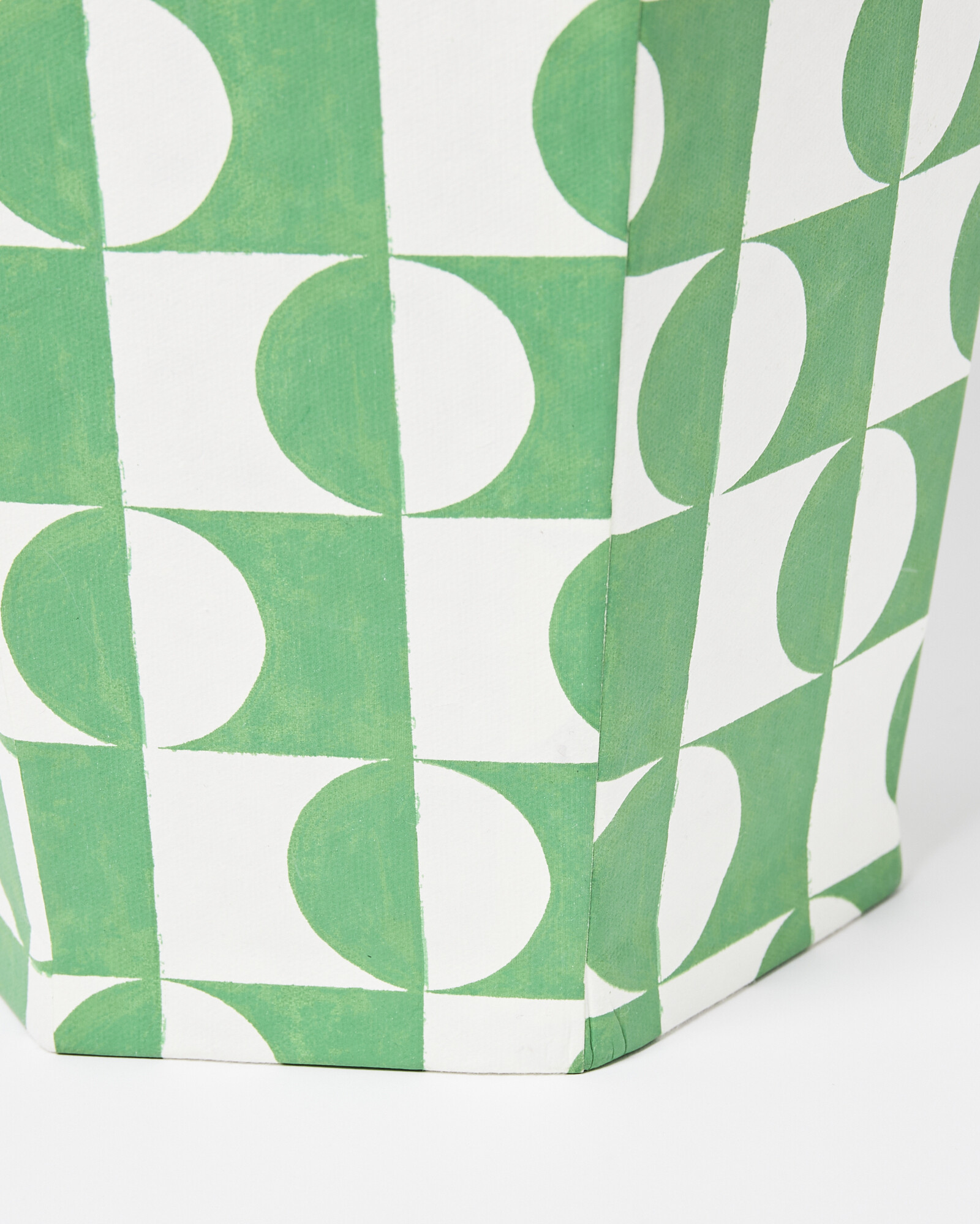 In a hexagonal profile, this paper bin has been hand-painted with a striking green and white geometric pattern