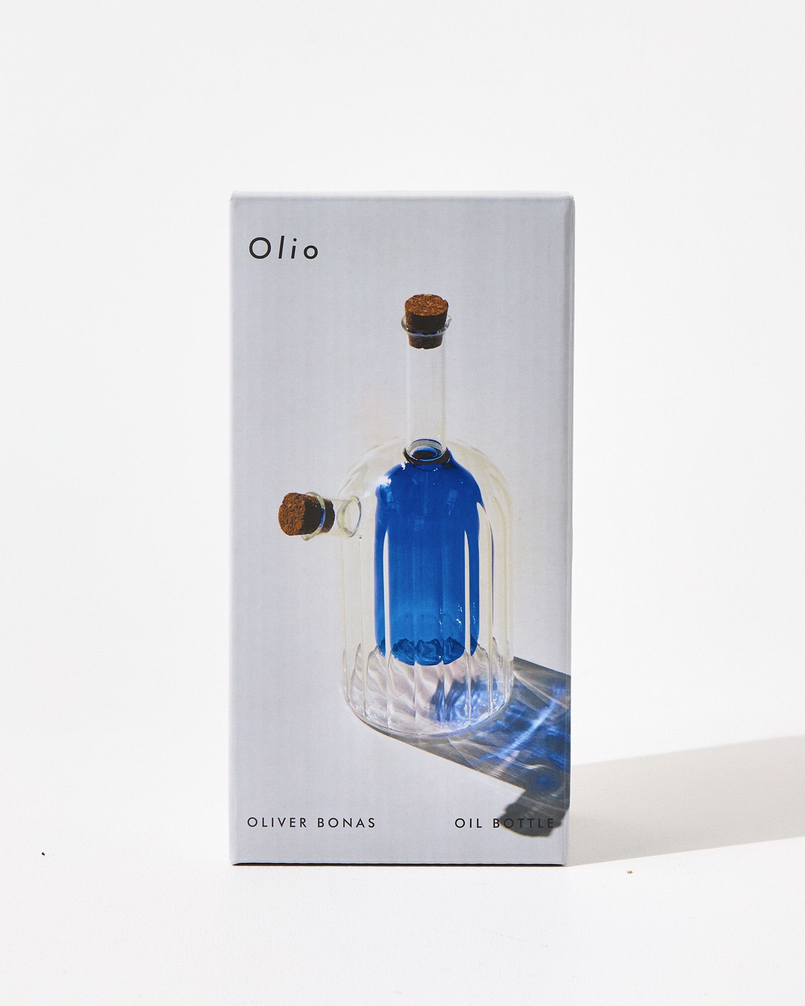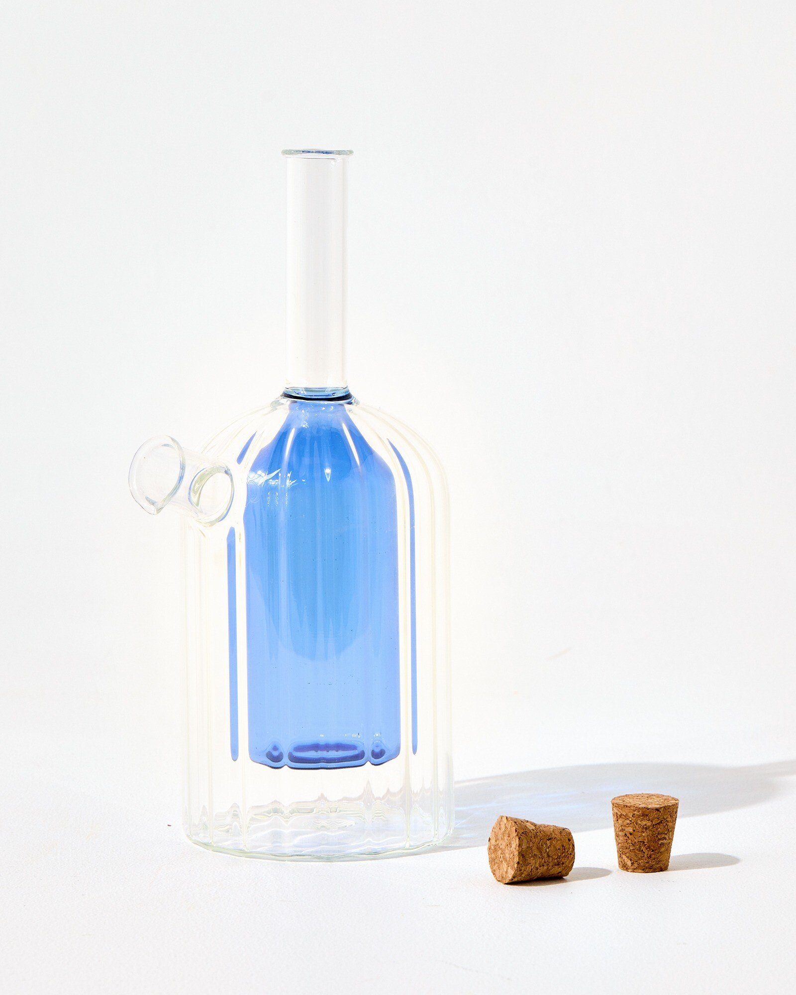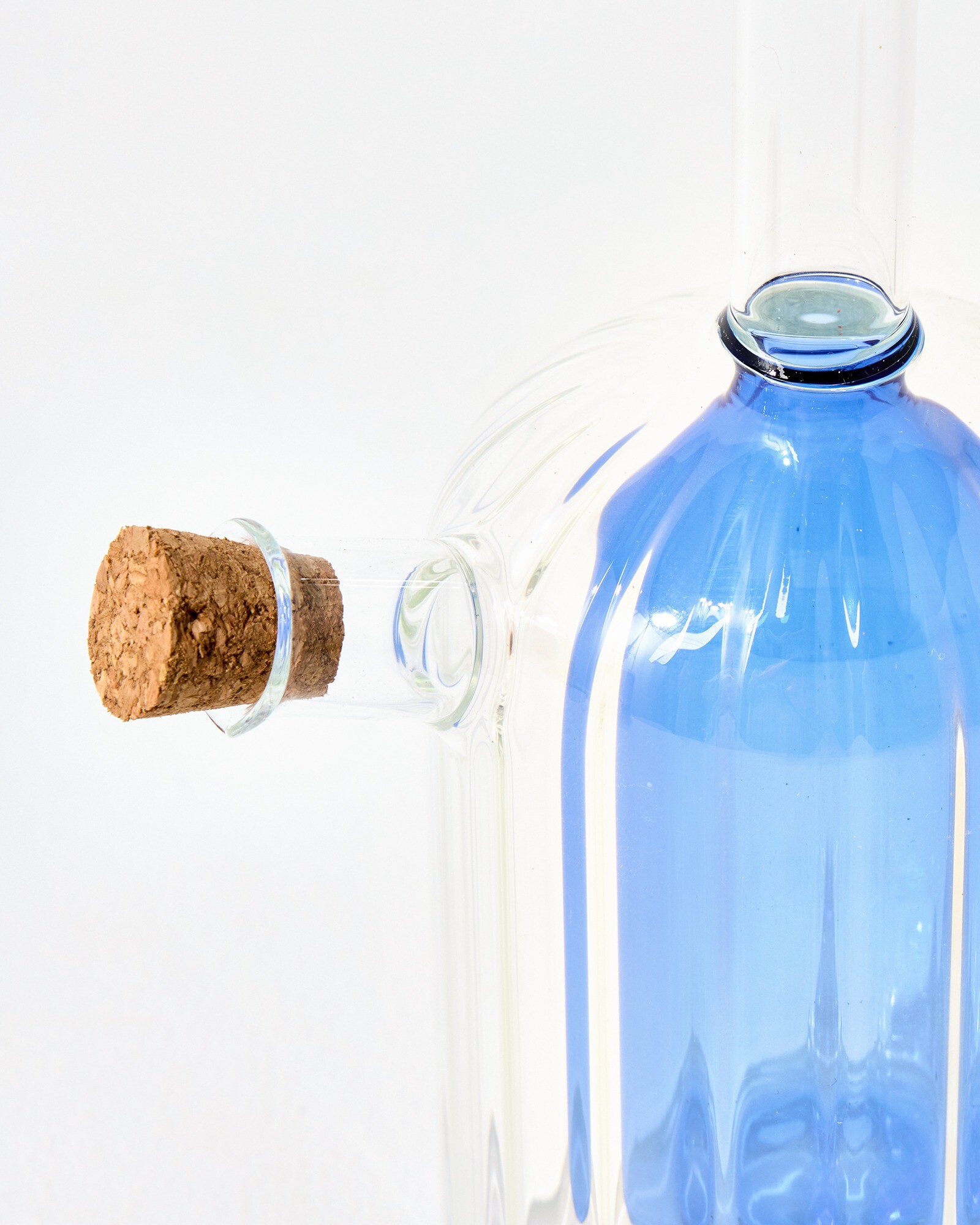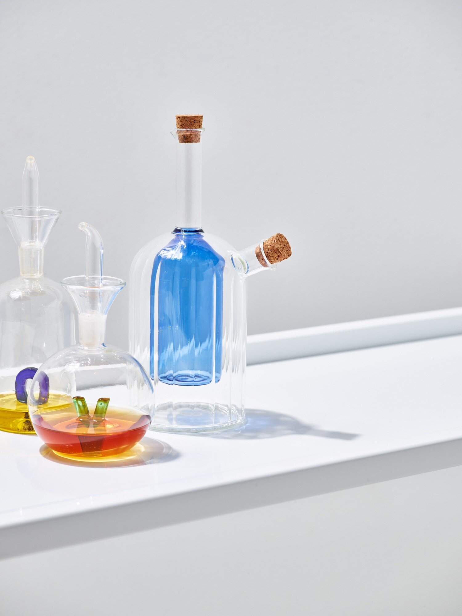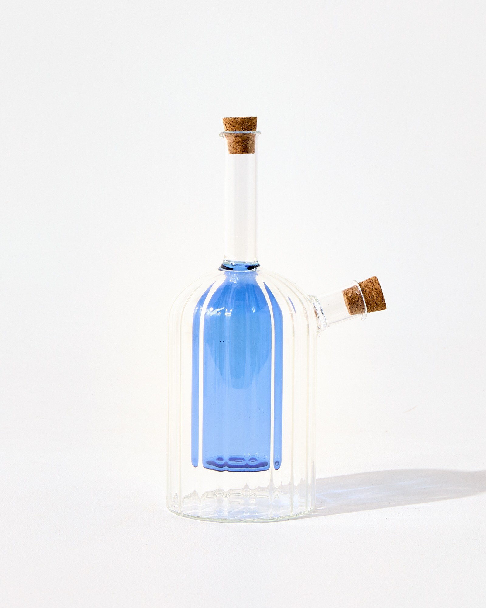 Double walled oil bottle with a central blue compartment for vinegar, and an outer compartment for oil formed from clear, ribbed glass. Each has its own cork stopper.