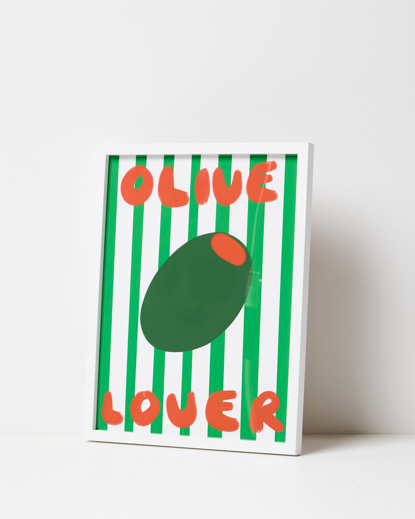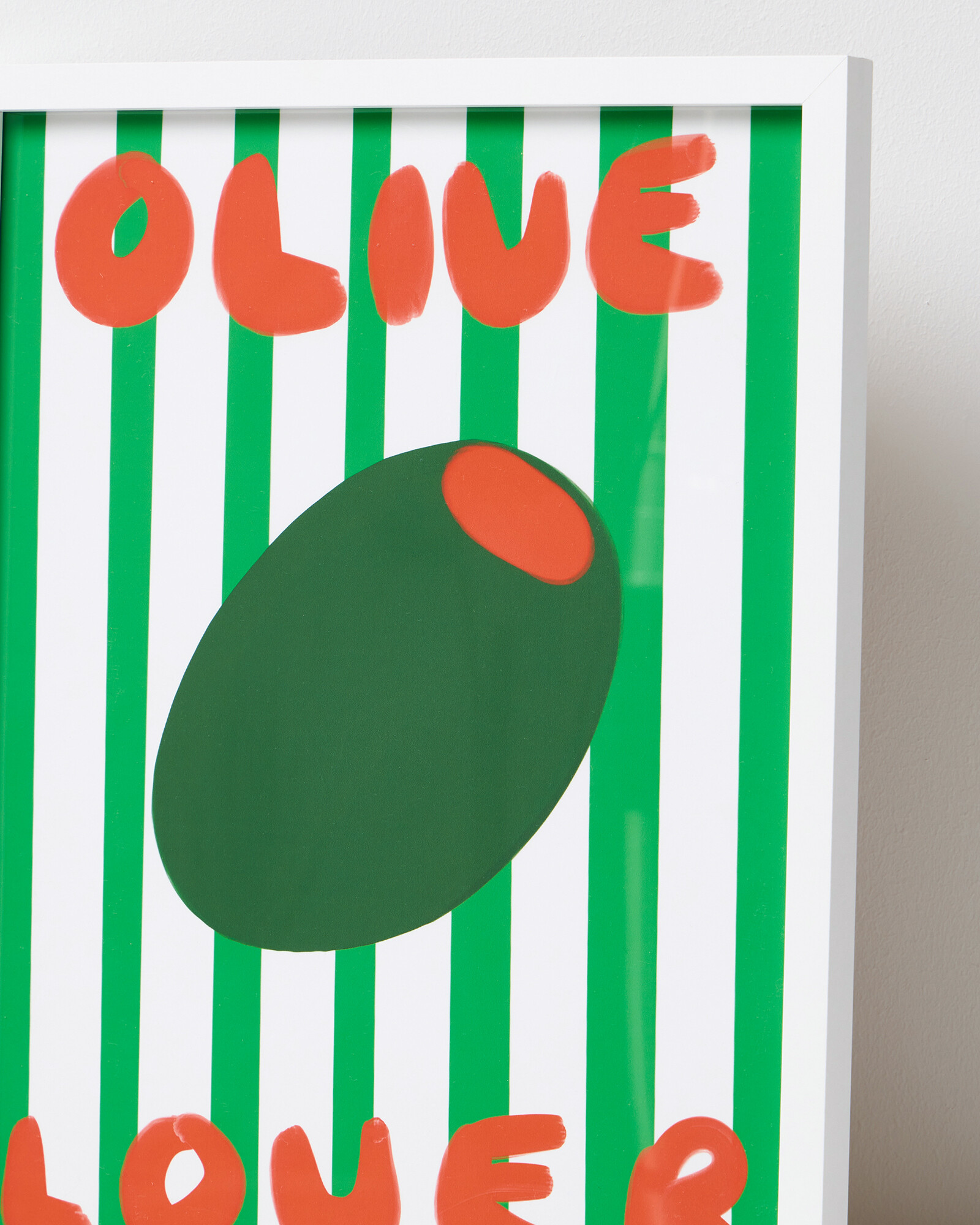 Vibrant wall art with a green stripe pattern, red handwritten text that says 'Oliver Lover' and fun olive illustration. Hang this kitchen wall art in your home for a pop of colour and joy.