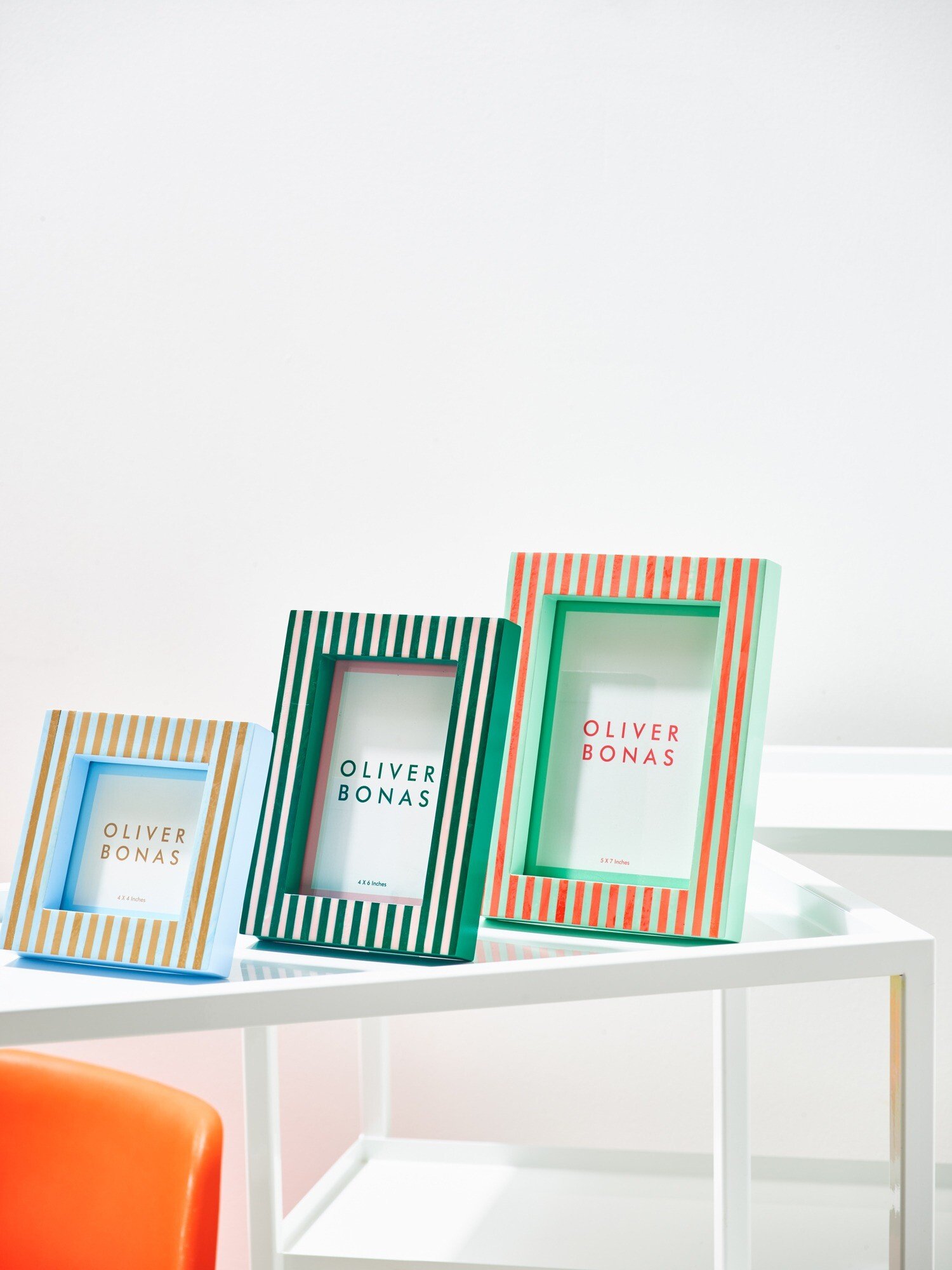 Patterned with a slim coral pink and sage green stripe pattern, this resin photo frame features a 5x7 inch window for displaying photographs or small art prints. Choose to display either portrait or landscape and place on your mantlepiece, bedside table or hallway console for a bright colour pop and personalised décor. This colourful resin photo frame would make a thoughtful gift to a friend or family member, for a memorable touch.
