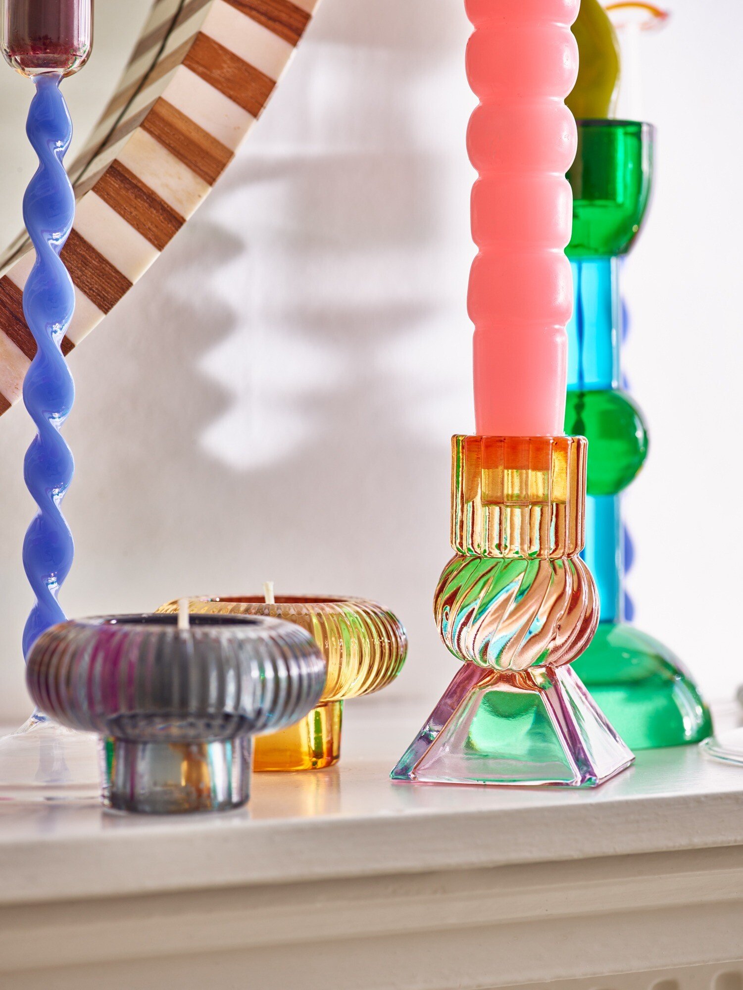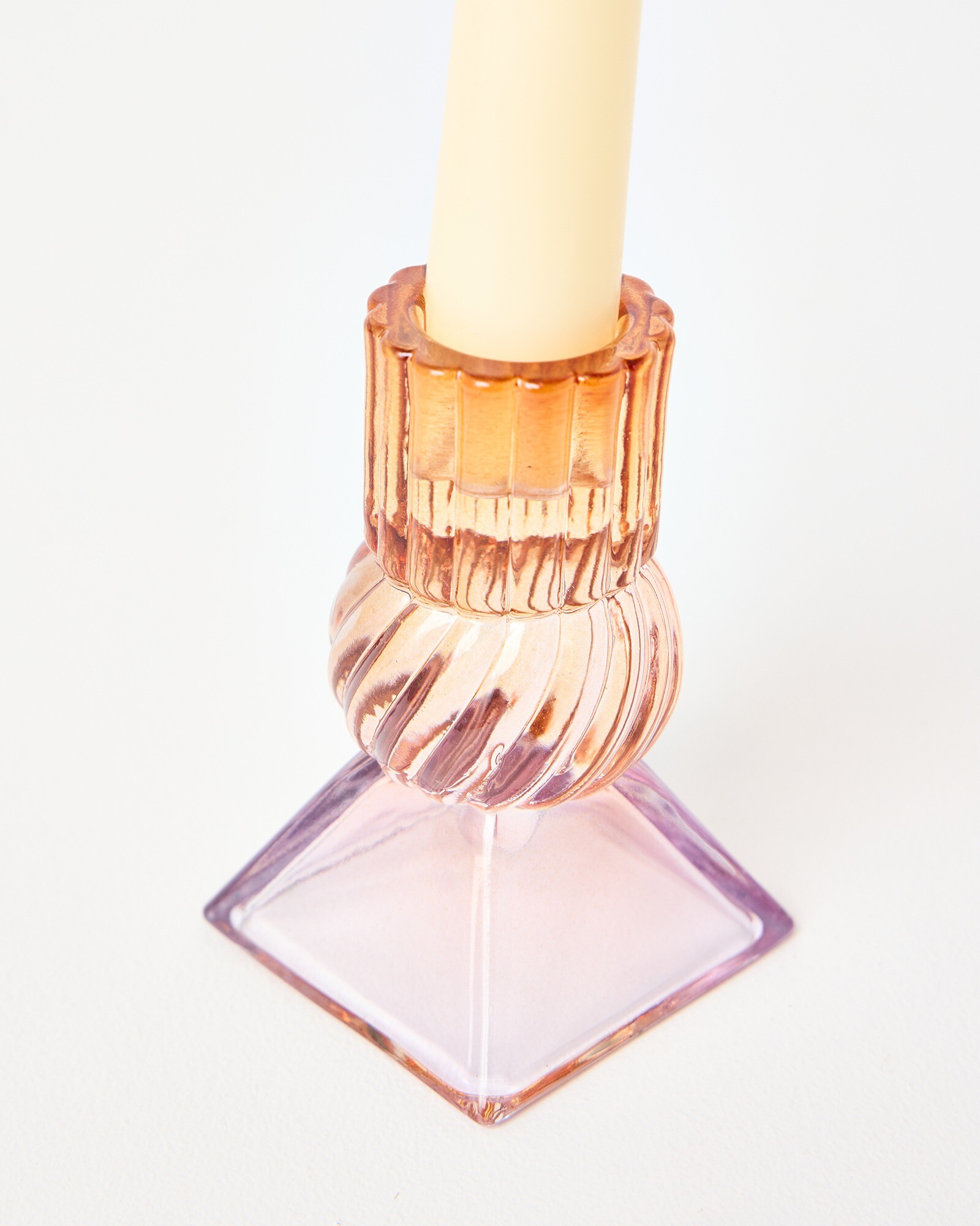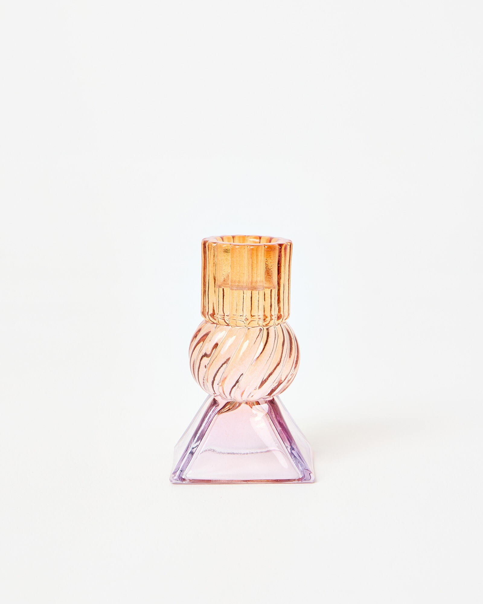 Tall glass candle holder in a geometric shape, featuring a trio of stacked shapes in pink, purple and orange hues. With a ribbed orange top, twisted bobbin middle and purple squared base, this stylish candle holder can hold a single standard sized candlestick, ideal for dinner table setting or placing in your living space for a luxurious look.