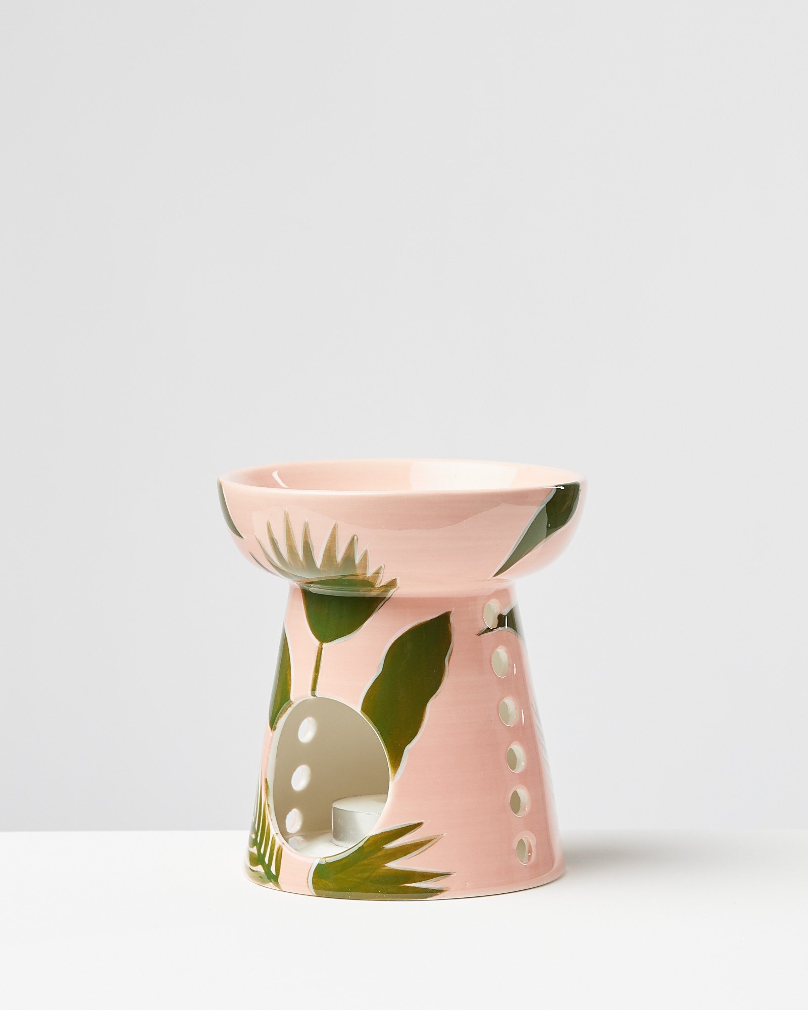 Handpainted with a green botanical design to transport you to a leafy paradise, this pink ceramic oil burner is a playful addition to your home accessories. With a bowl on top to hold an essential oil of yoru choosing, simply light a tealight inside the chamber below to infuse your space with a sweet, spicy or calming fragrance.