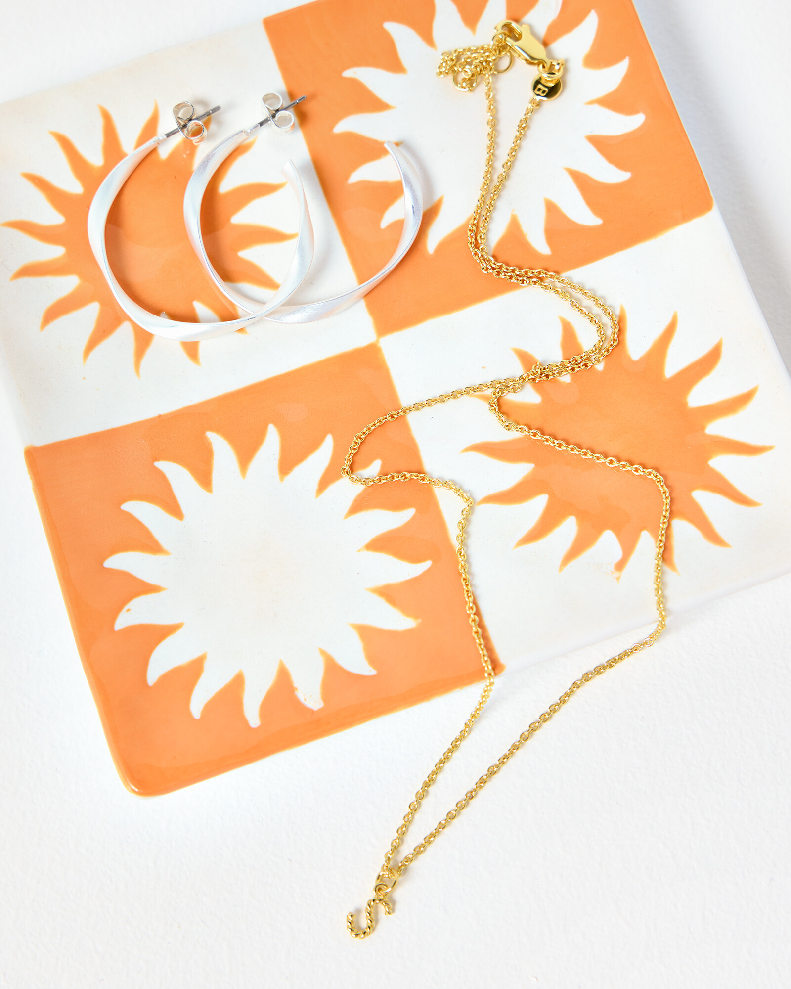 Square ceramic trinket dish with a patchwork sun print in alternating orange and white colour blocks. Perfect for storing everyday jewellery items and small accessories, on your bedside table or dresser.