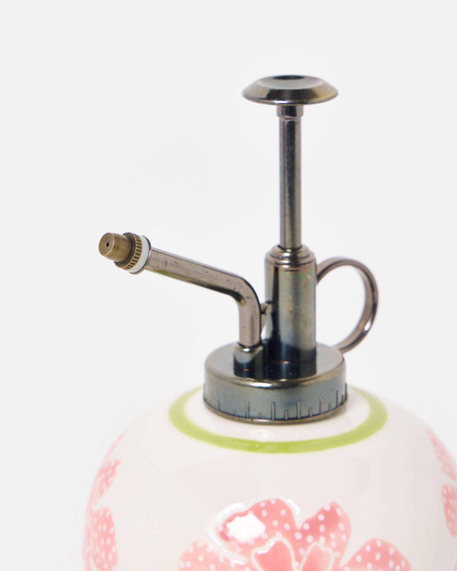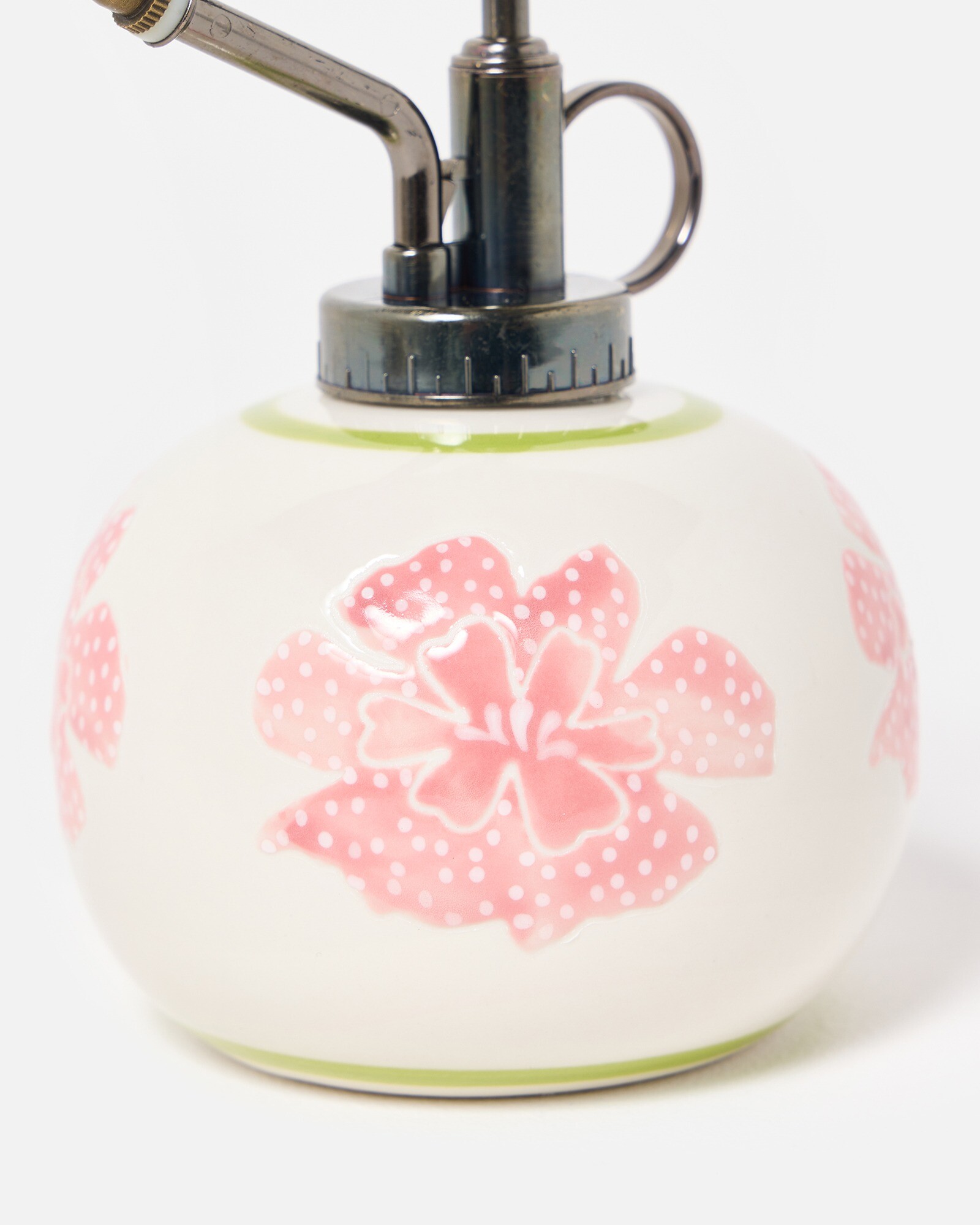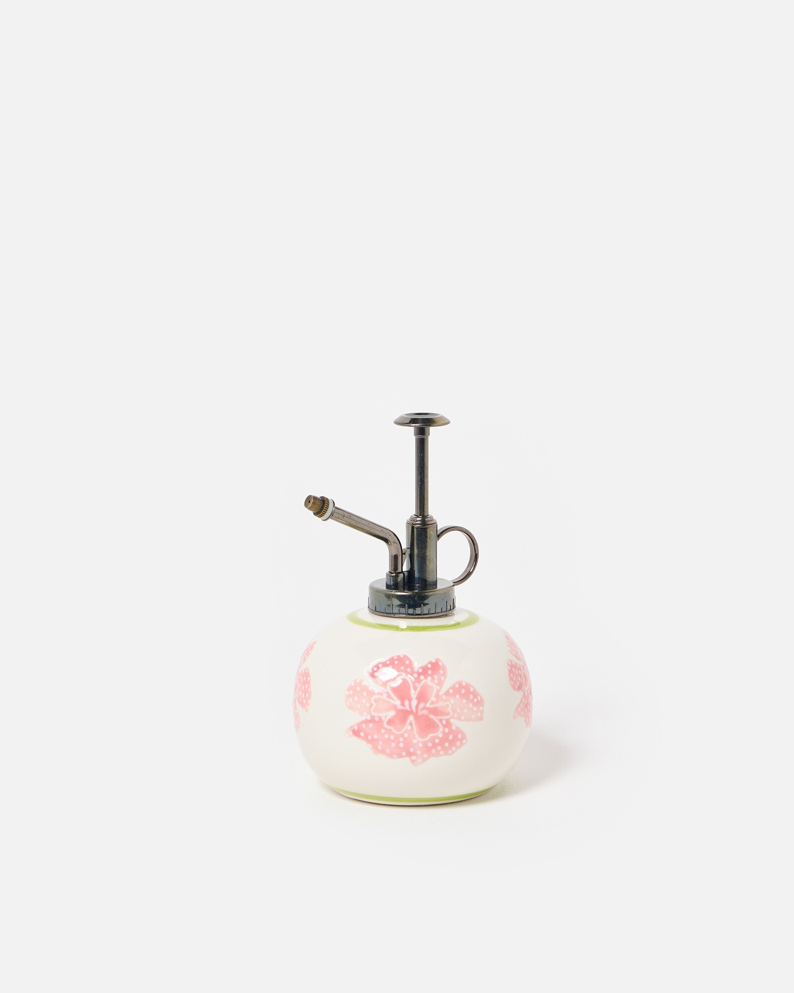 Rounded cream ceramic plant mister printed with a pink blossom motif on each side, finished with a metallic pump and handle and subtle green stripe. This floral plant is the ideal size for indoor plants, adding a touch of colour and practicality to your home décor. Be sure to pair with the matching watering can for a memorable gardening gift set.