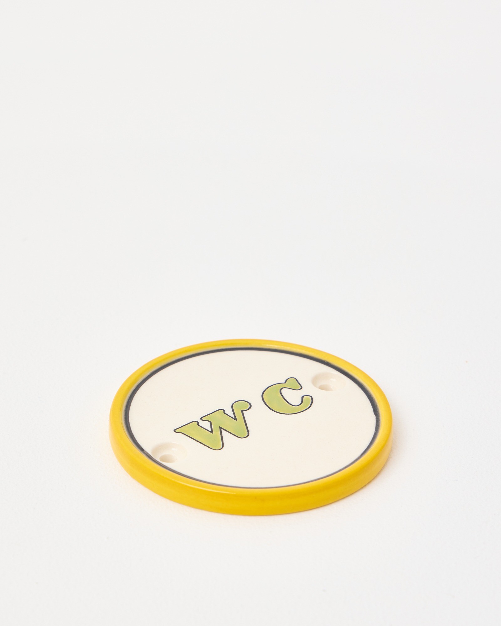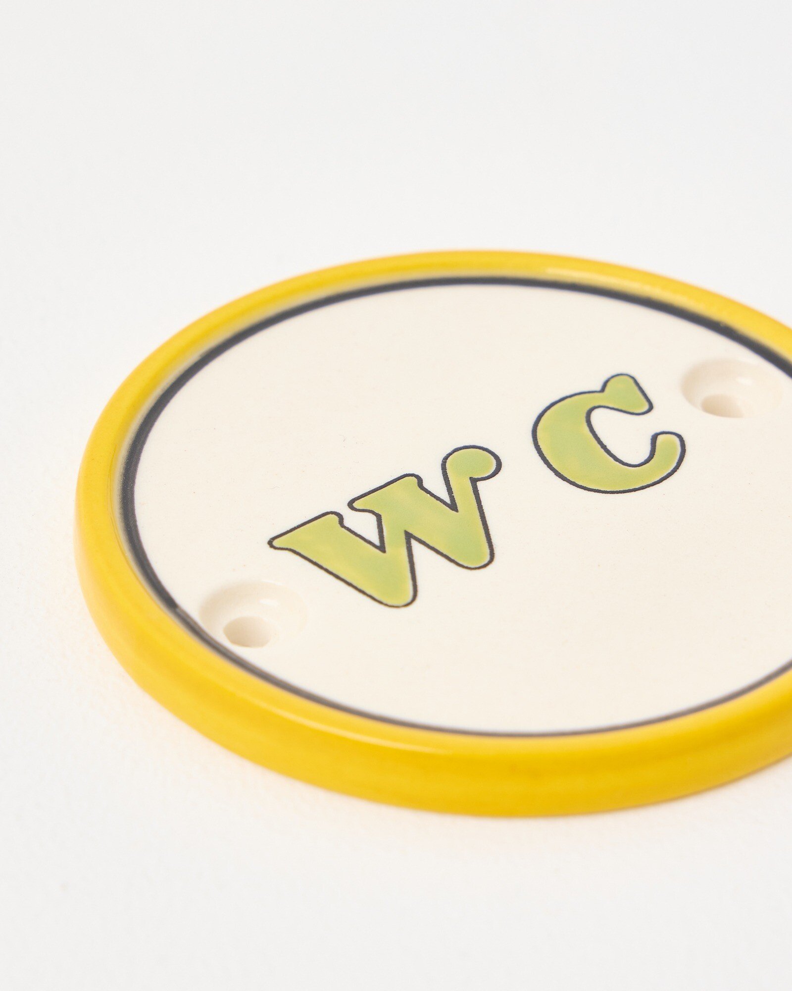 Round ceramic door sign with 'WC' glazed across the centre in italic green lettering, on a cream base with a raised yellow border. Use the two screw holes to secure this playful bathroom sign to your WC door, adding a playful pop of colour to your home. Screws not included.