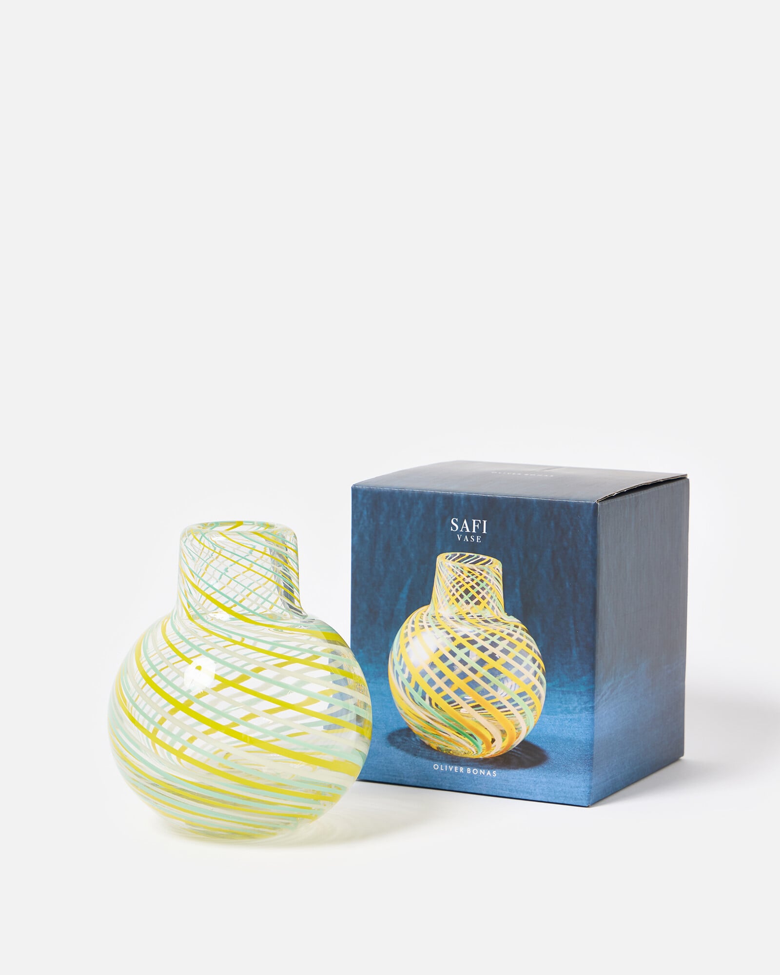Small, round-bodied glass vase with a tapered neck, and a twisted spiral pattern in yellow, blue and white hues. This small glass vase is a great size for cuttings and dried flowers, and with its colourful swirling stripes would make a colourful addition to your living room, dining table or windowsill.