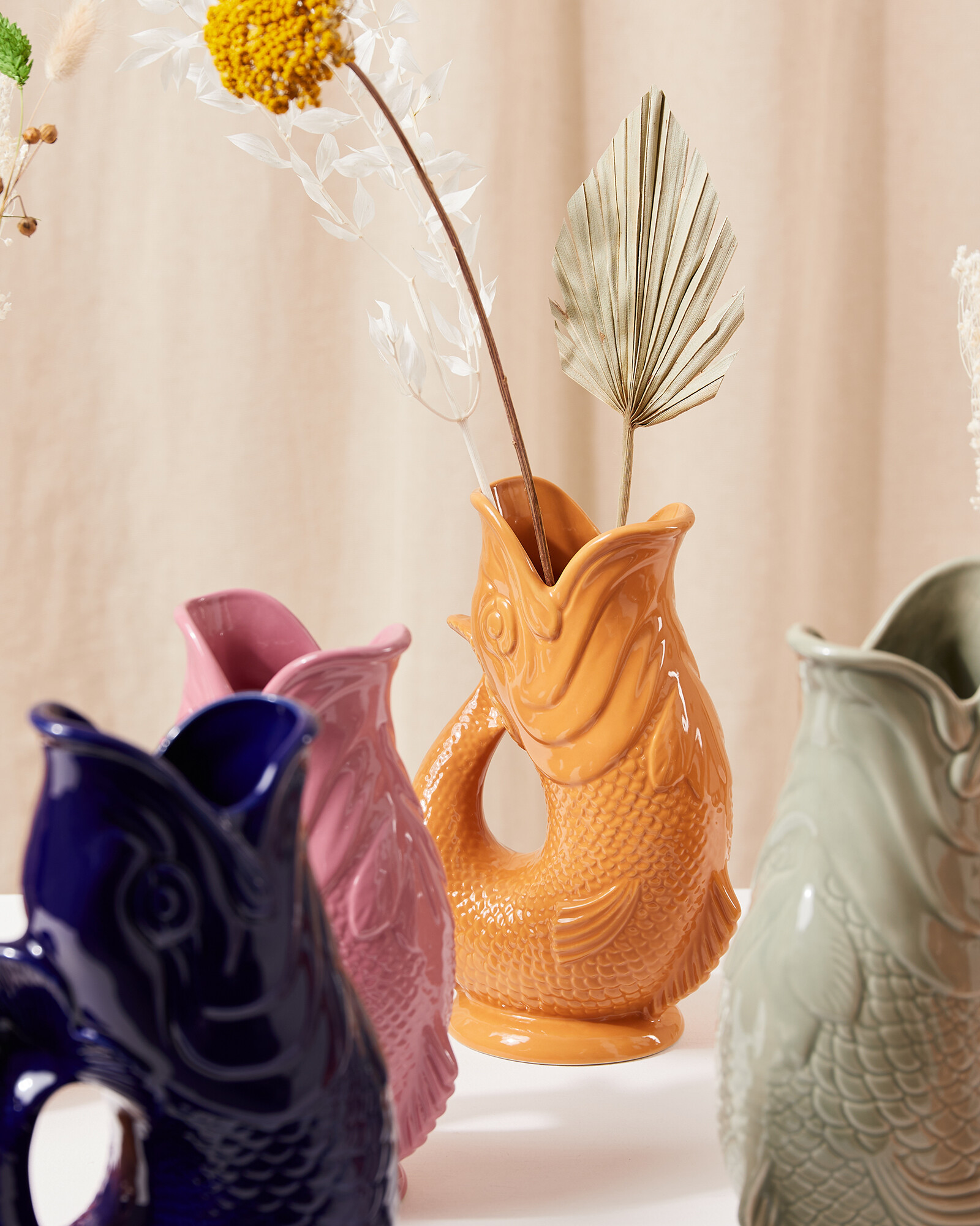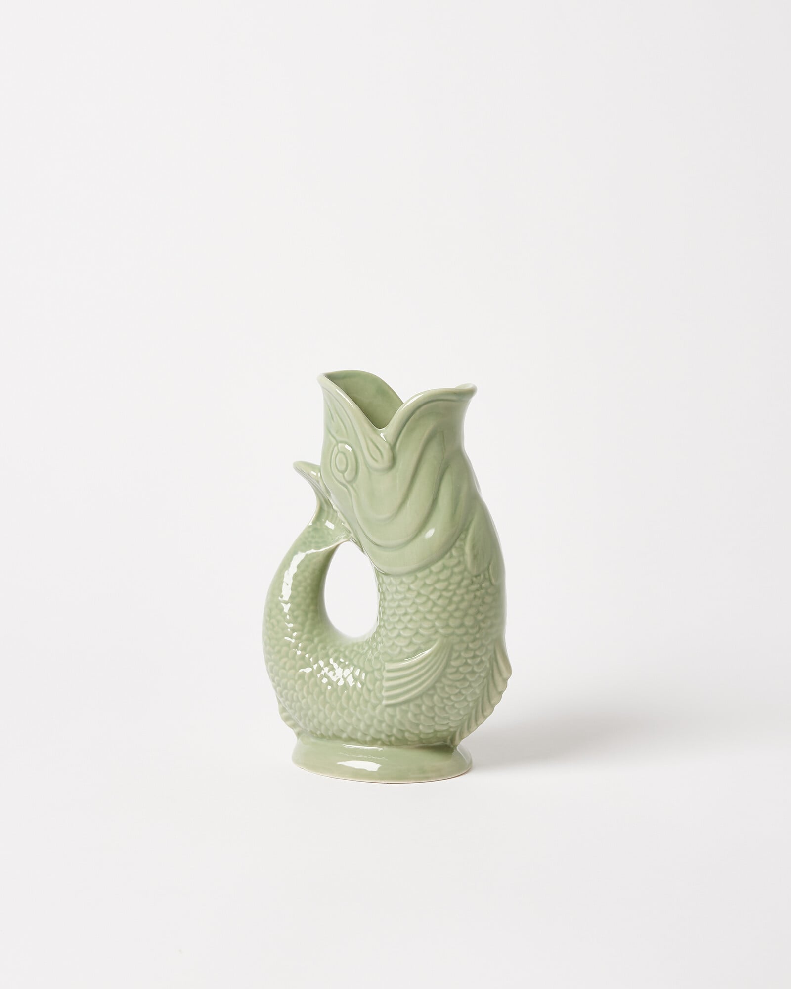 Gluggle jugs are named after the 'gluggle' sound that they make when poured. The original fish-shaped vase was made in Staffordshire over a hundred years ago, and now comes in plenty of colours and sizes. Use as a jug, vase, decanter or utensil holder.
