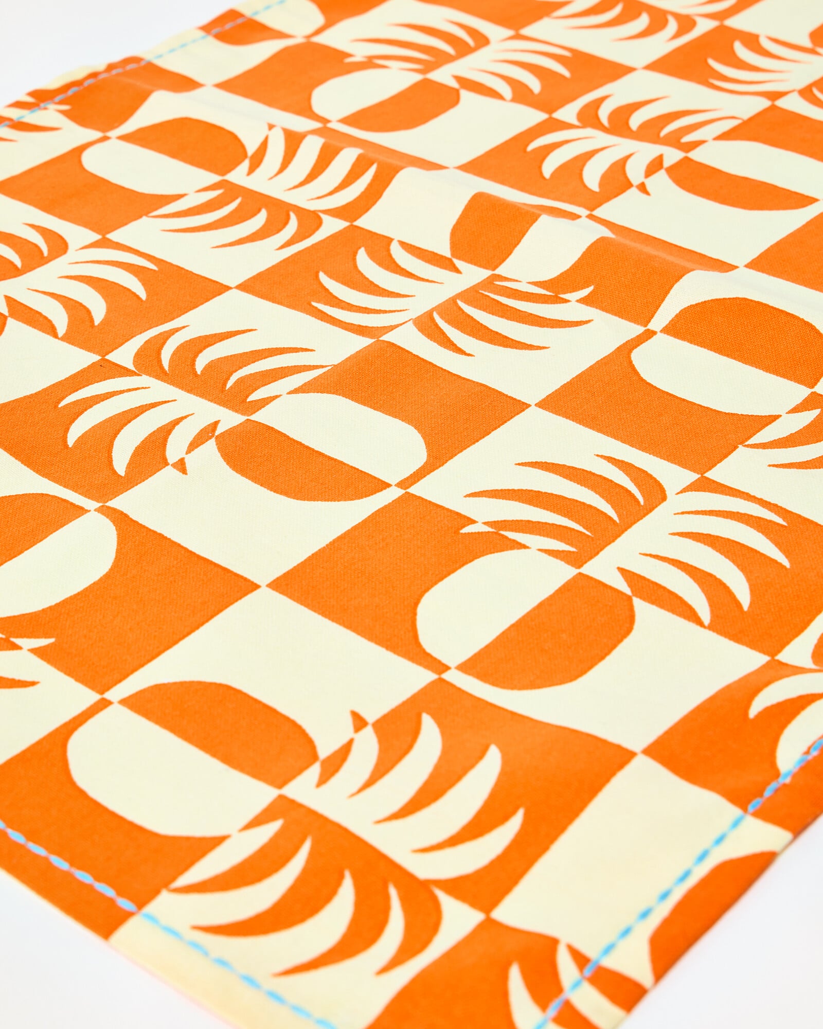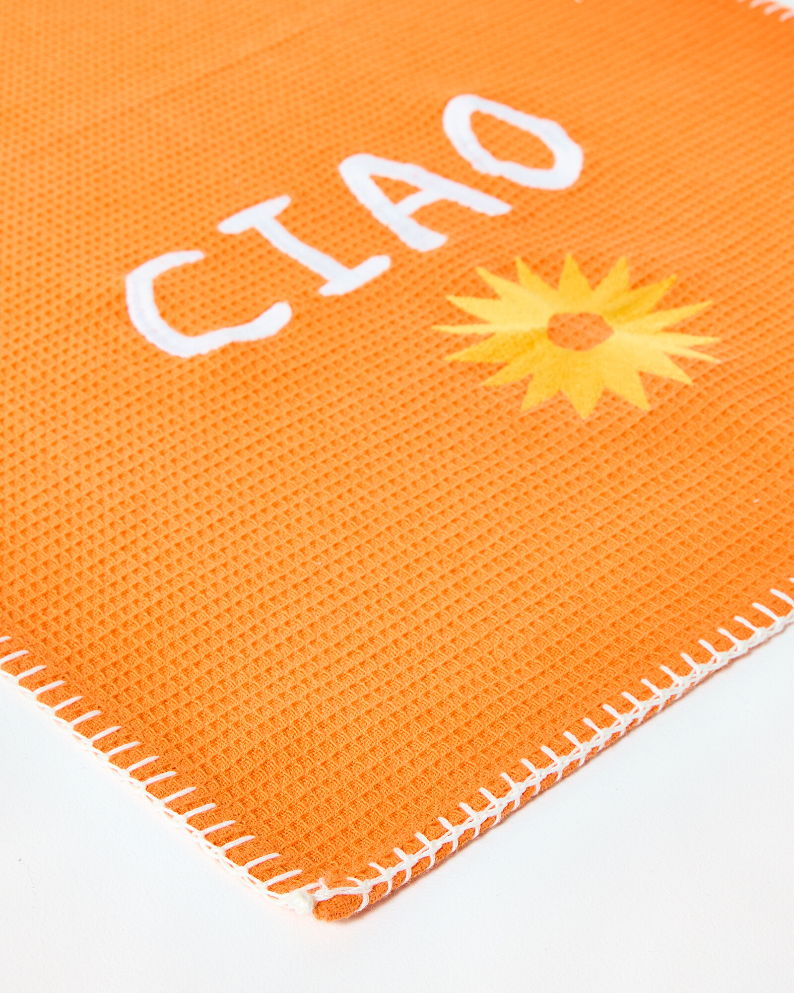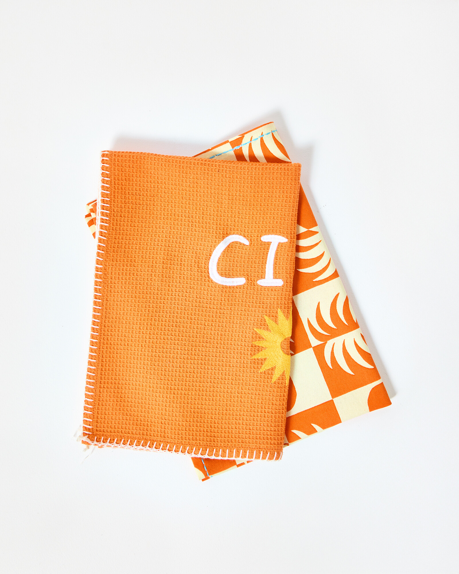 Set of two orange tea towels with bold sun-inspired designs. One tea towel features a block printed pineapple motif in an orange and white chequerboard pattern, finished with blue stitching along the border. The other is made from a bright orange waffle fabric, with a contrasting white overlock stitch border, and embroidered 'Ciao' and yellow sun detail. Every tea towel has been individually ink-stamped by hand using traditional block-printing techniques, giving each a unique finish. Due to the handmade nature of this technique there may be slight smudges in the print.