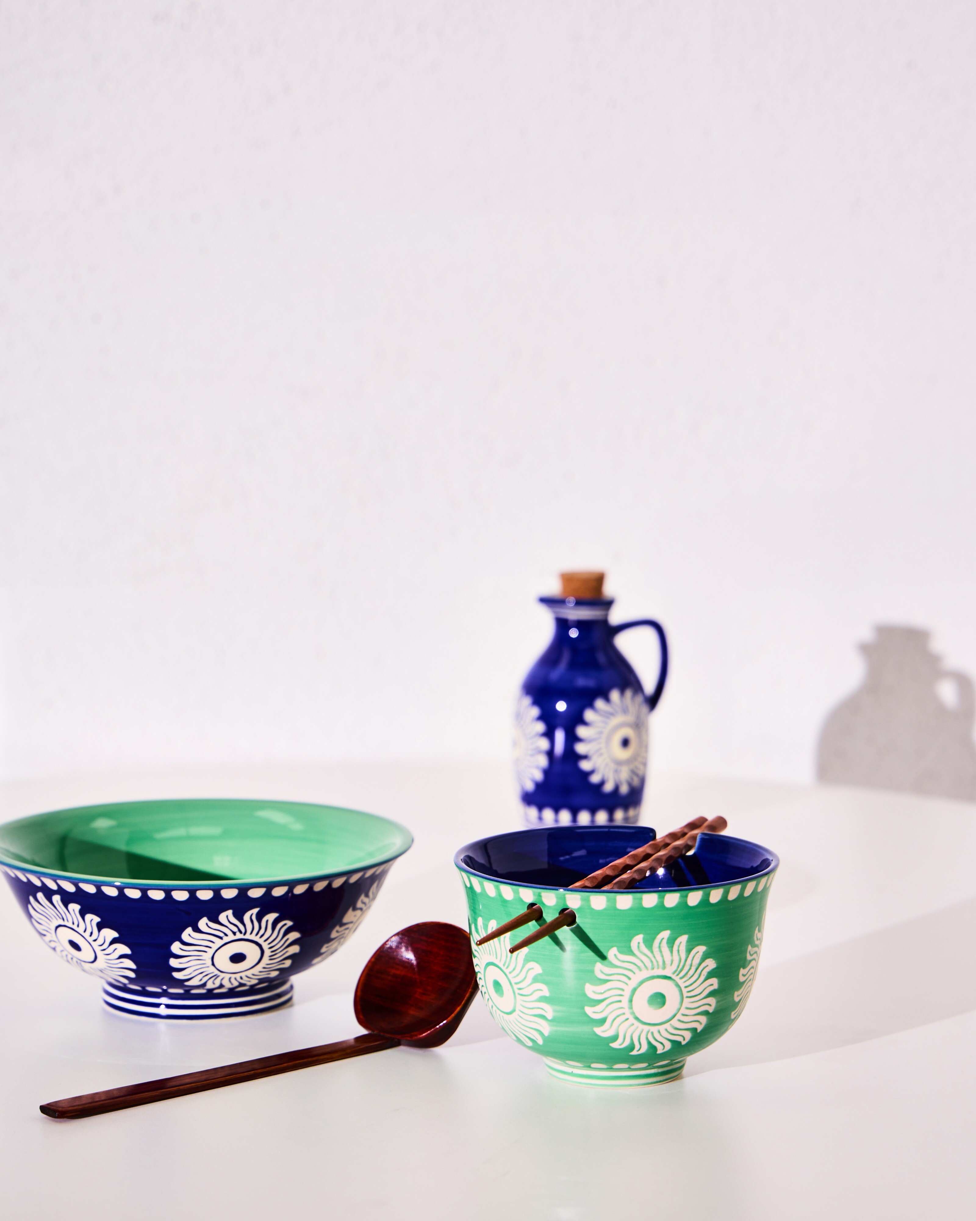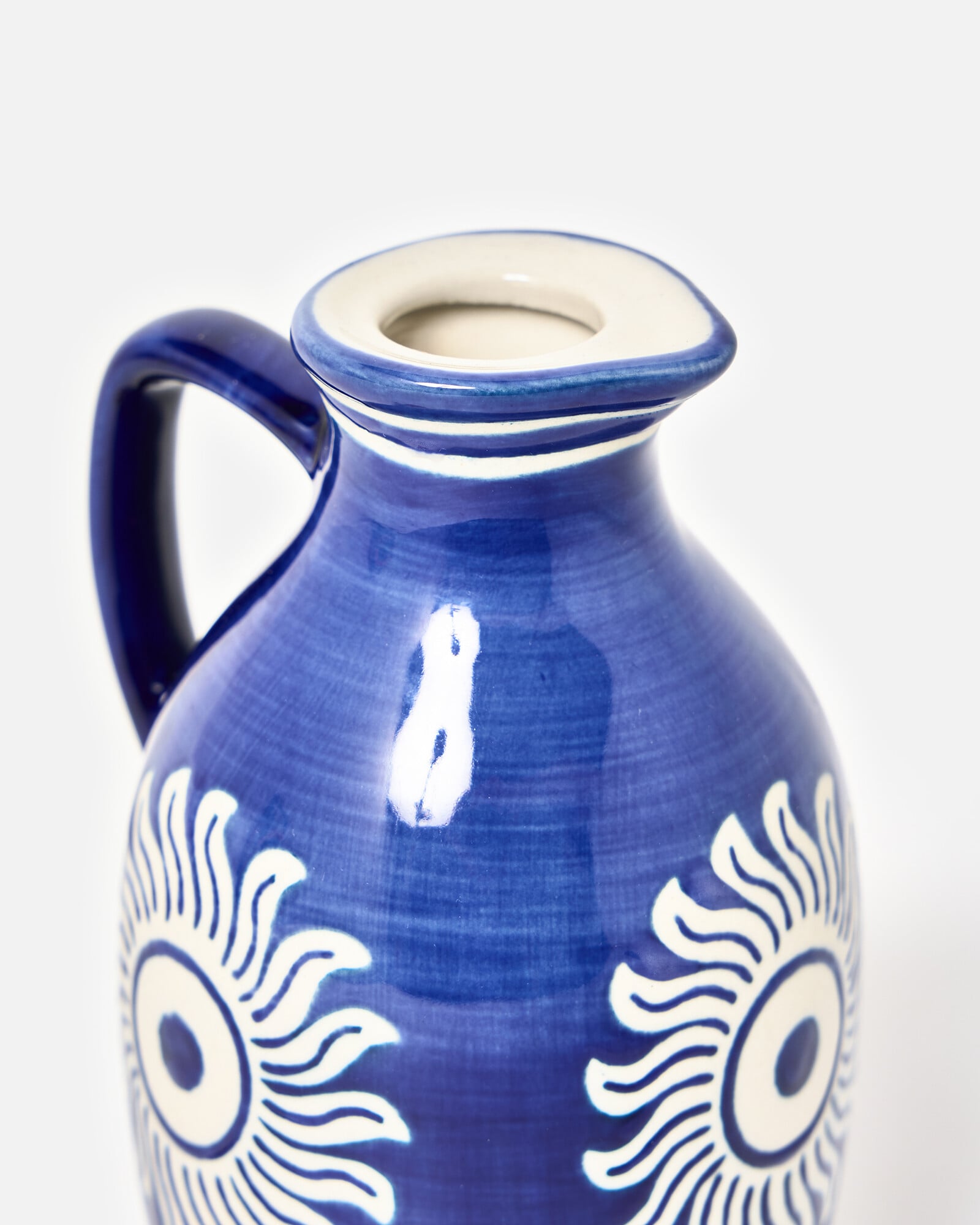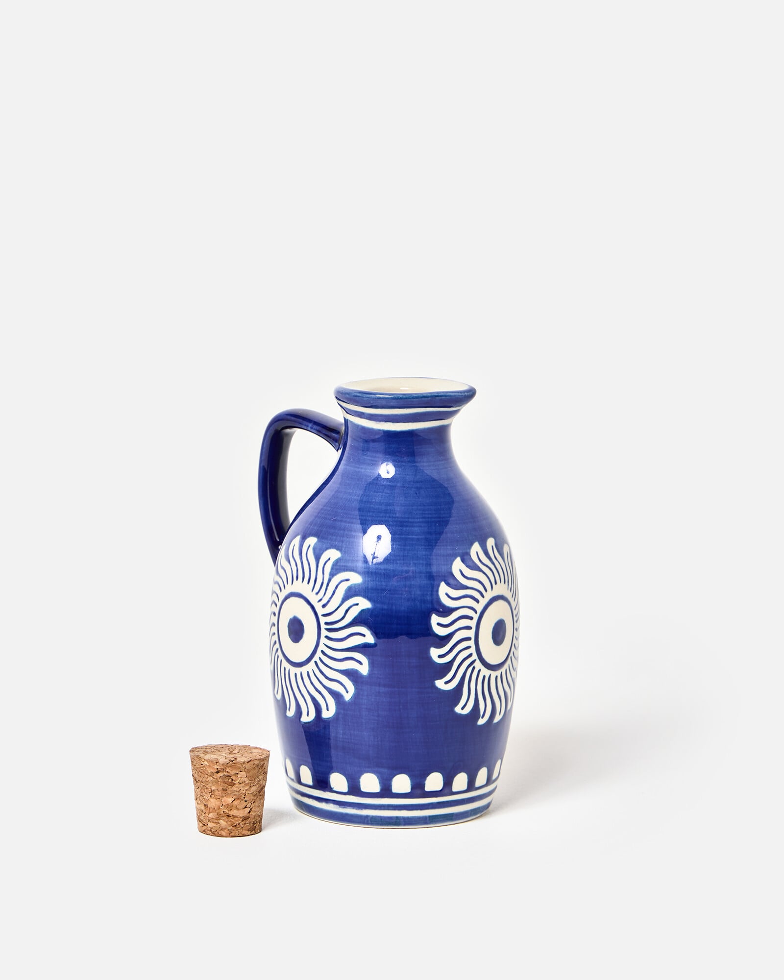 Blue ceramic oil bottle with a wax resist sun motif and details around the rim and base. In a classic curved oil bottle profile with a handle and cork top, use as a decorative addition to your summer dining table, for serving alongside salads and pasta dishes.