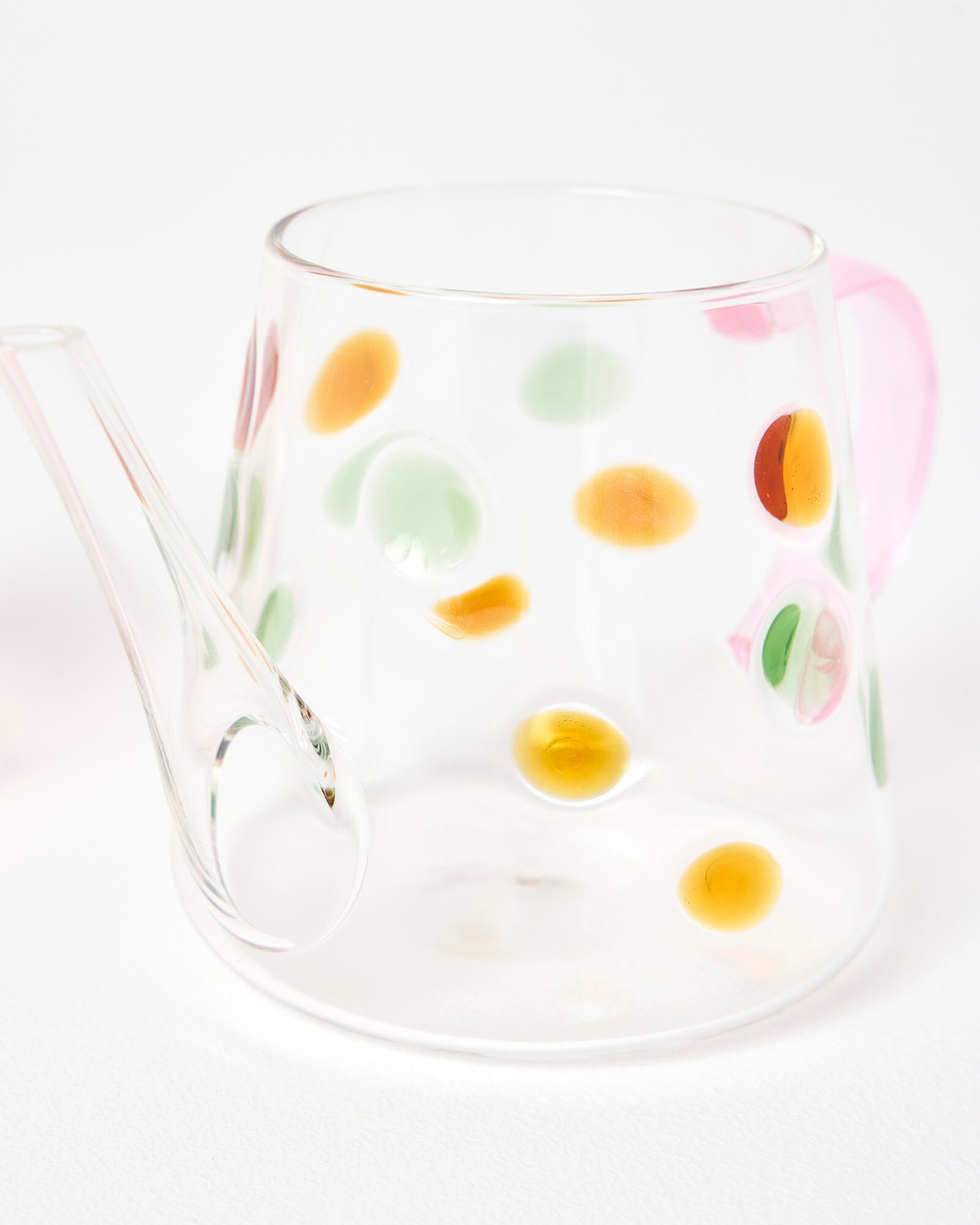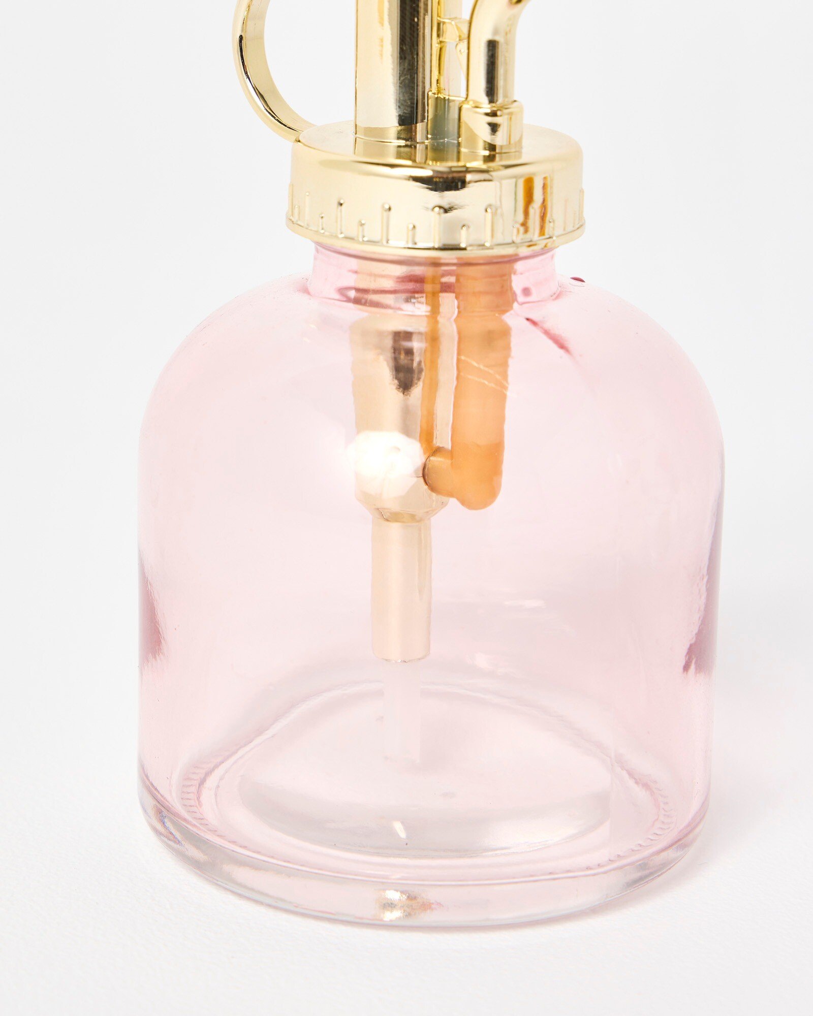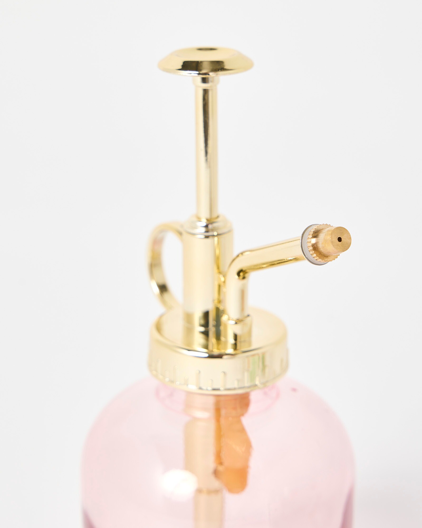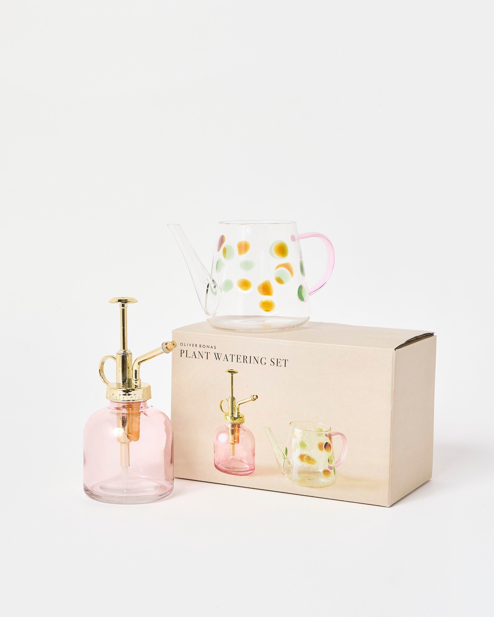Gardening gift set with a pink glass plant mister and spotted clear glass watering can, packaged together in a custom gift box. The pink plant mister has a golden handle and pump feature that easily unscrews to open and refill, and the watering can has multiple green and yellow spots all over, with a pink handle and slim spot. An ideal gift for your favourite houseplant enthusiast, this matching plant mister and watering can duo is the perfect size to sit on your windowsill, combining colour and functionality.