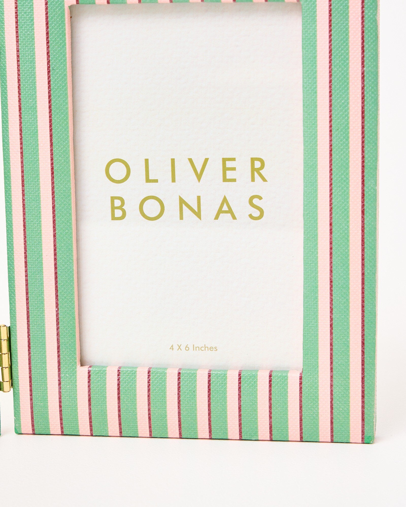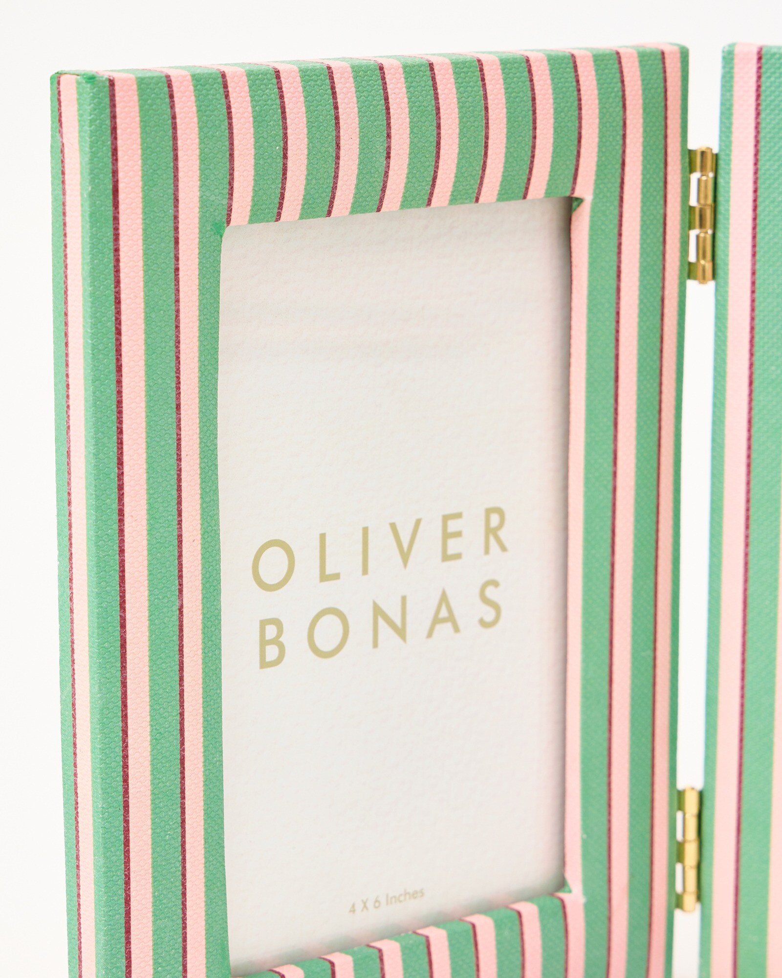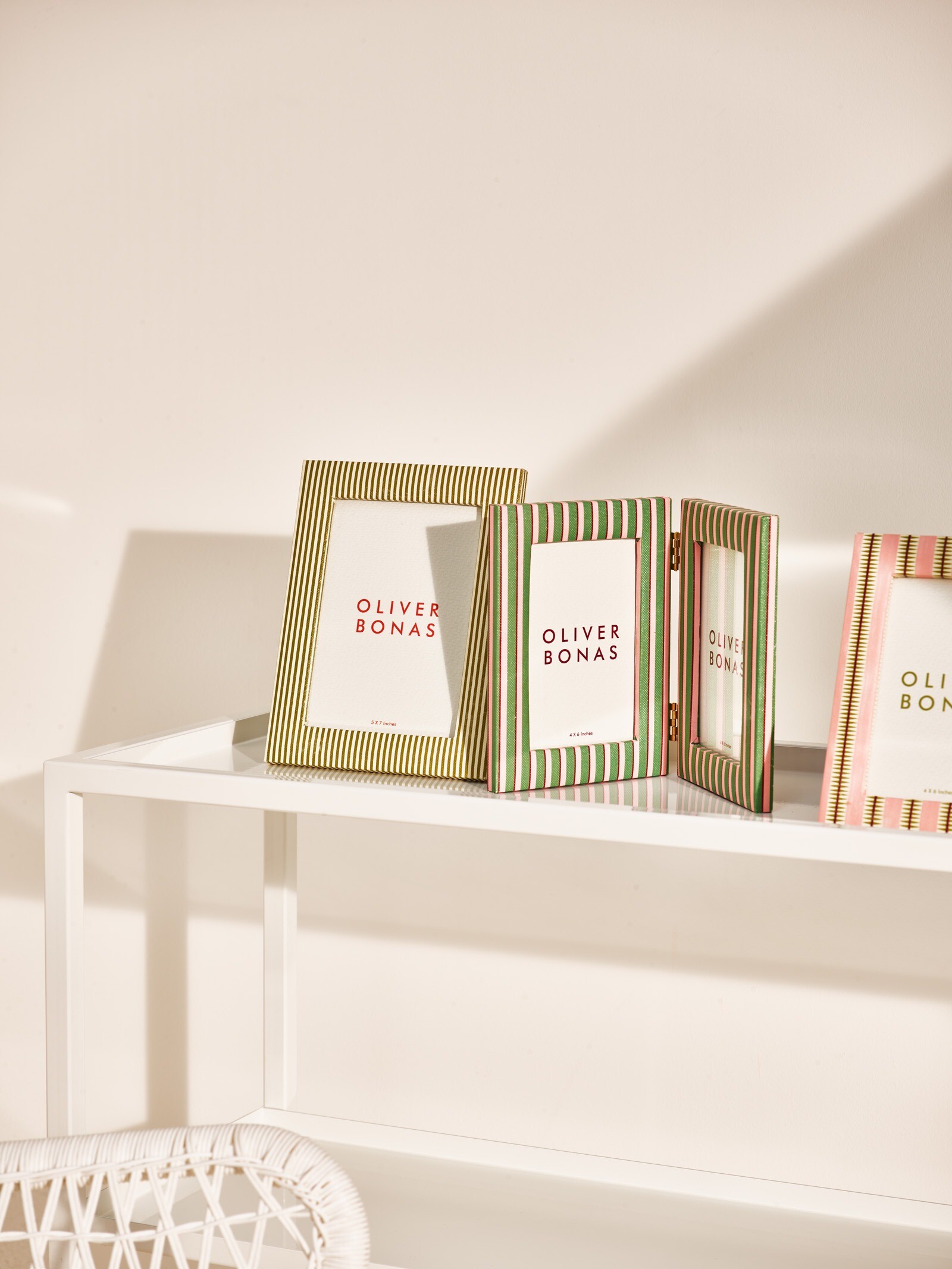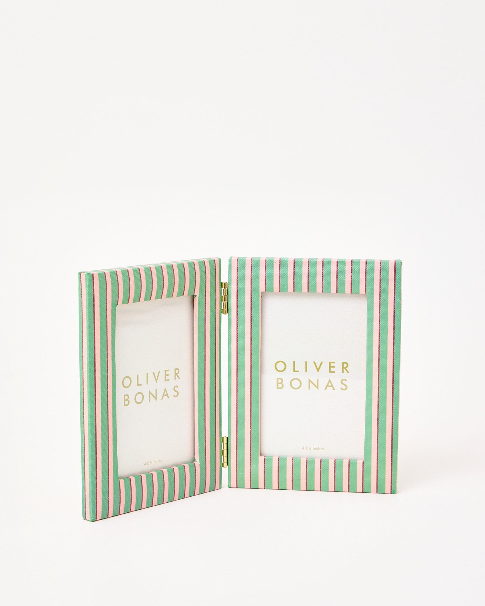 Multi photo frame with two 6x4 inch windows, secured with a gold hinge for a double portrait feature. With a bright and colourful stripe pattern all over in pink, green and burgundy hues, this multi photo frame would make a thoughtful gift, and can be personalised with family photos to stand in your living room, hallway or bedroom.