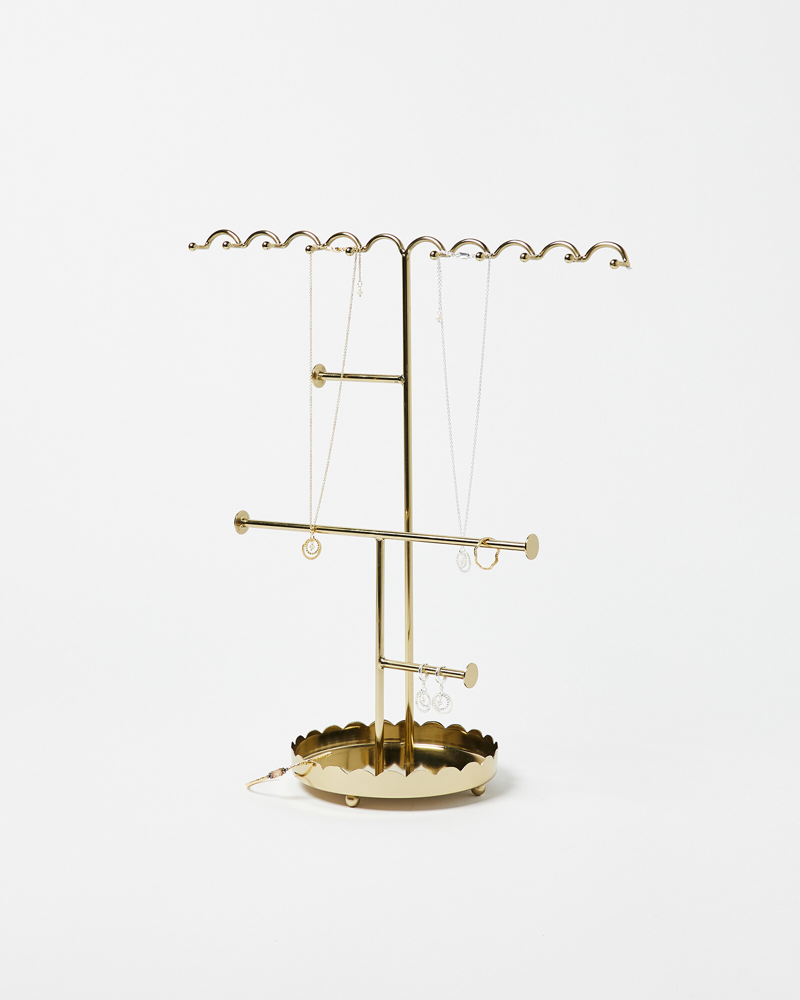 Functional jewellery stand with a sleek scalloped base and wavy storage hooks to store your longer pieces.