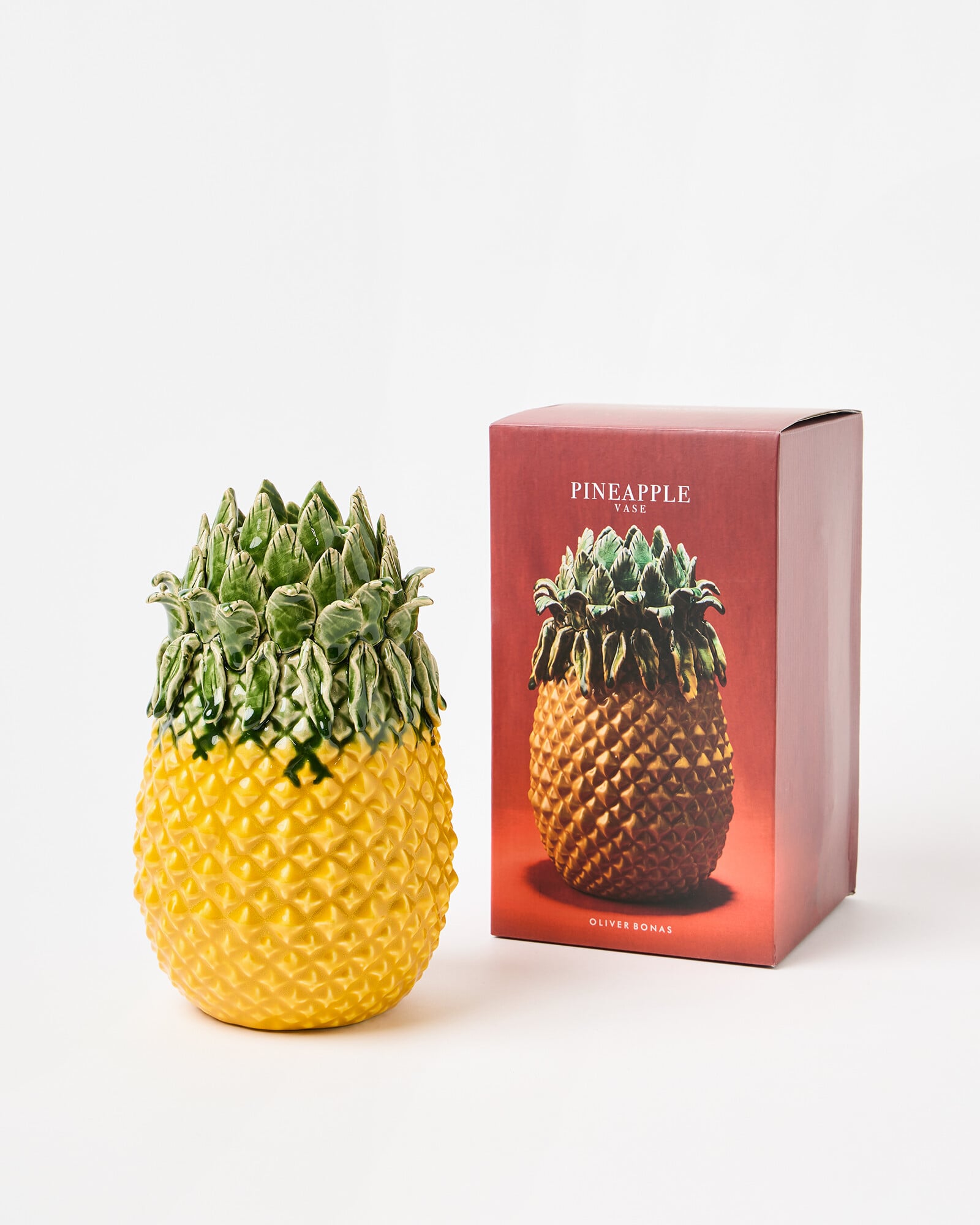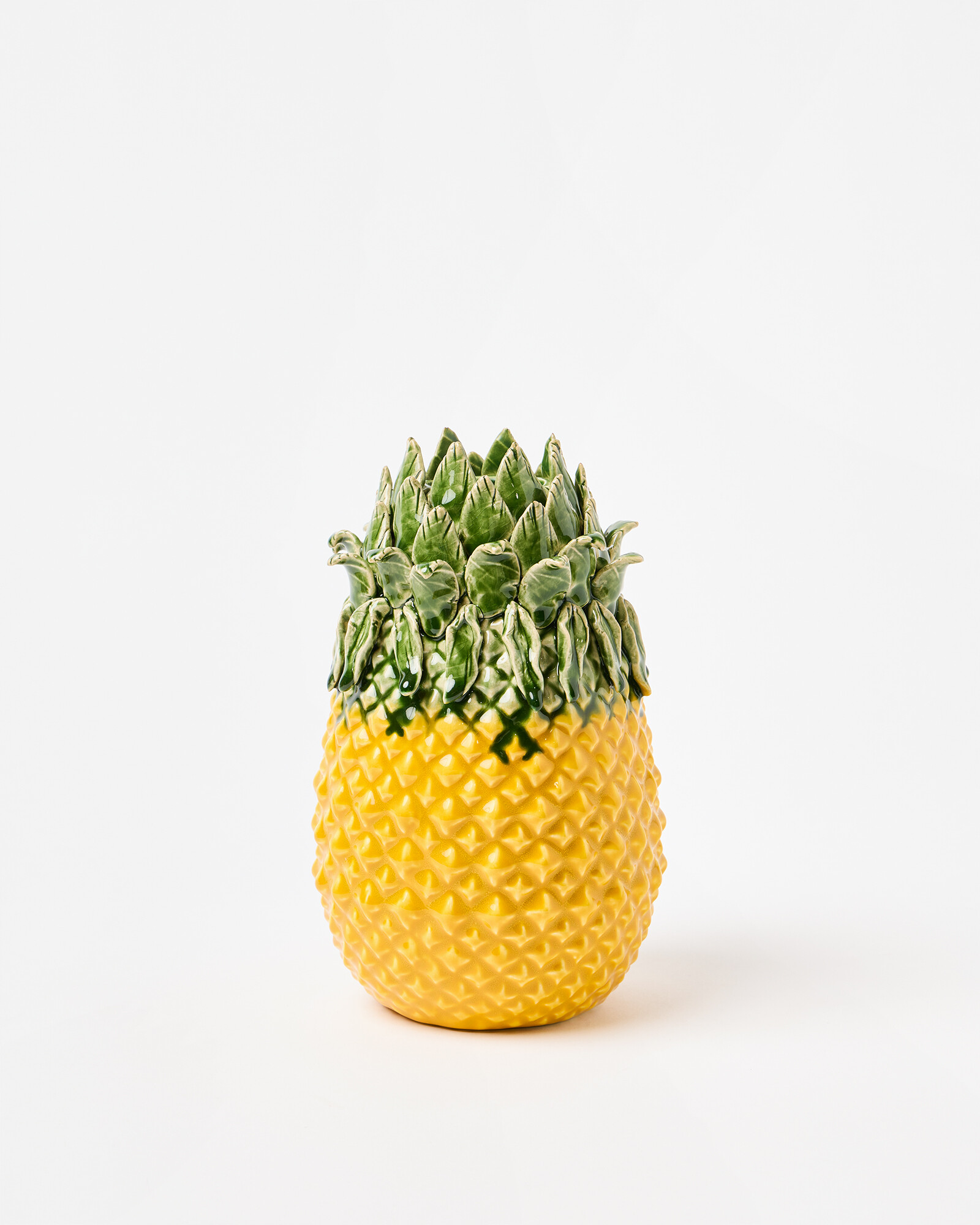 Pineapple-shaped ceramic vase with engraved details, hand-painted colour and a playful, sculptural design. Fill with flowers or display as an objet.