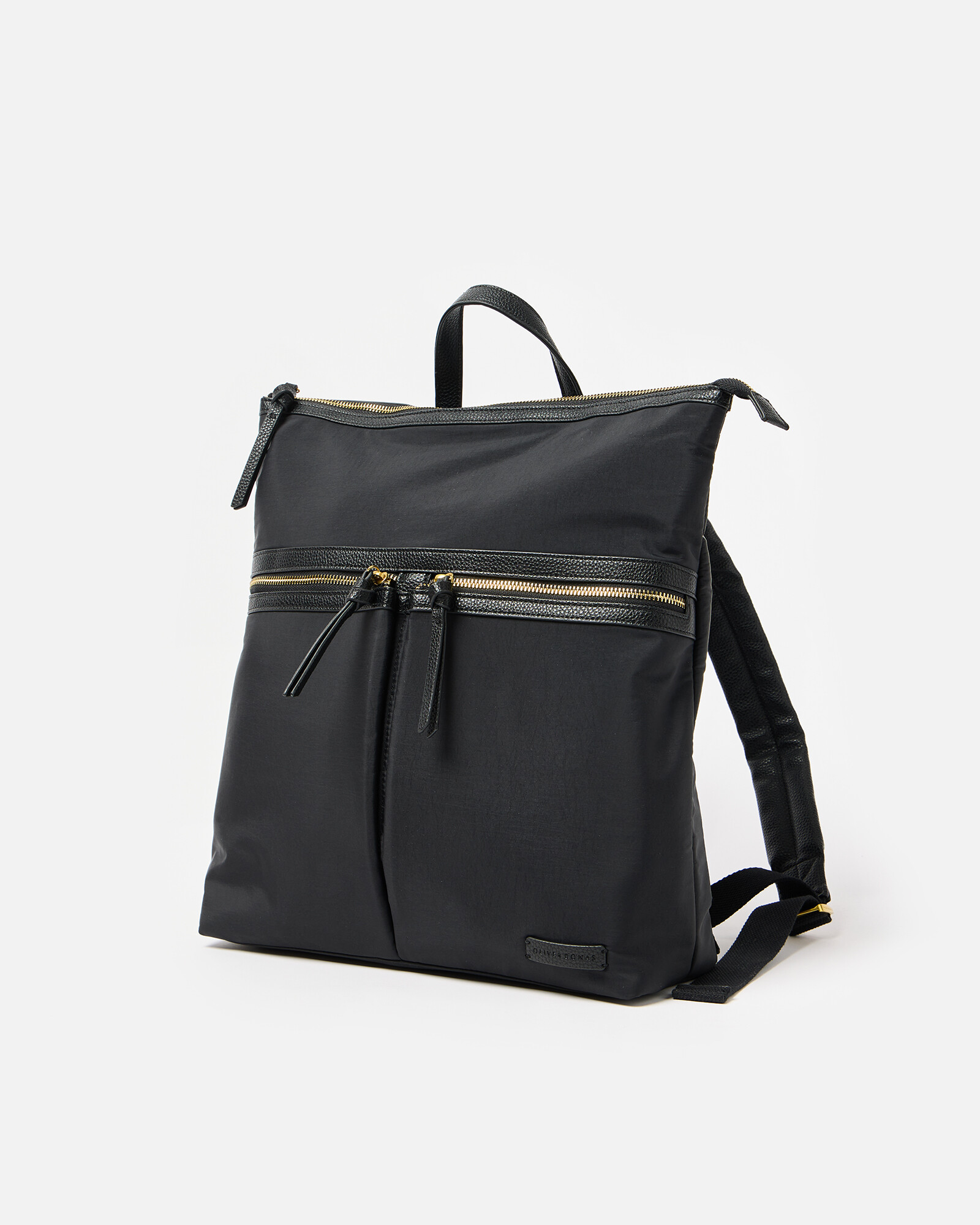 Black rucksack with three exterior zipped pockets, internal laptop slot and carry handle. Designed with a contrasting fabric and PU finish.