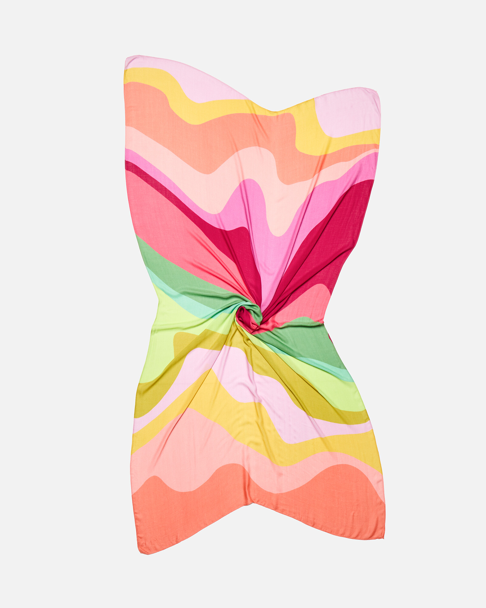 Lightweight scarf with a colourful wave pattern in tonal shades of pink, green and orange.