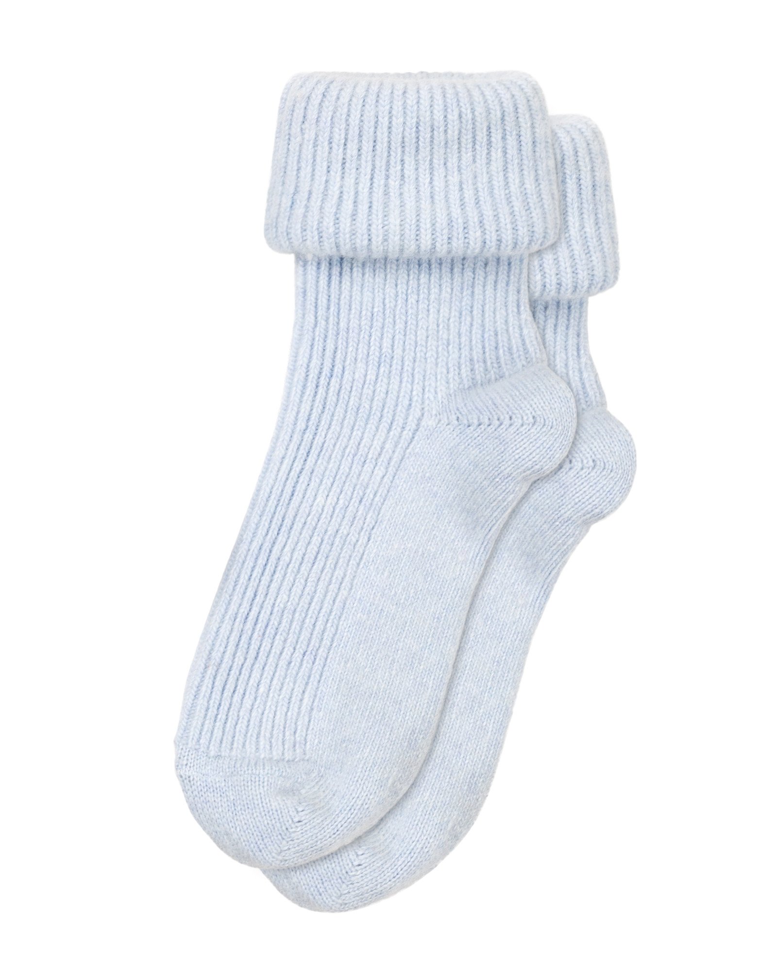 In a soft-touch wool and cashmere-blend yarn, these bed socks are knitted in sky blue ribbed design, completed with turned-down cuffs for a cosy addition to your accessories.