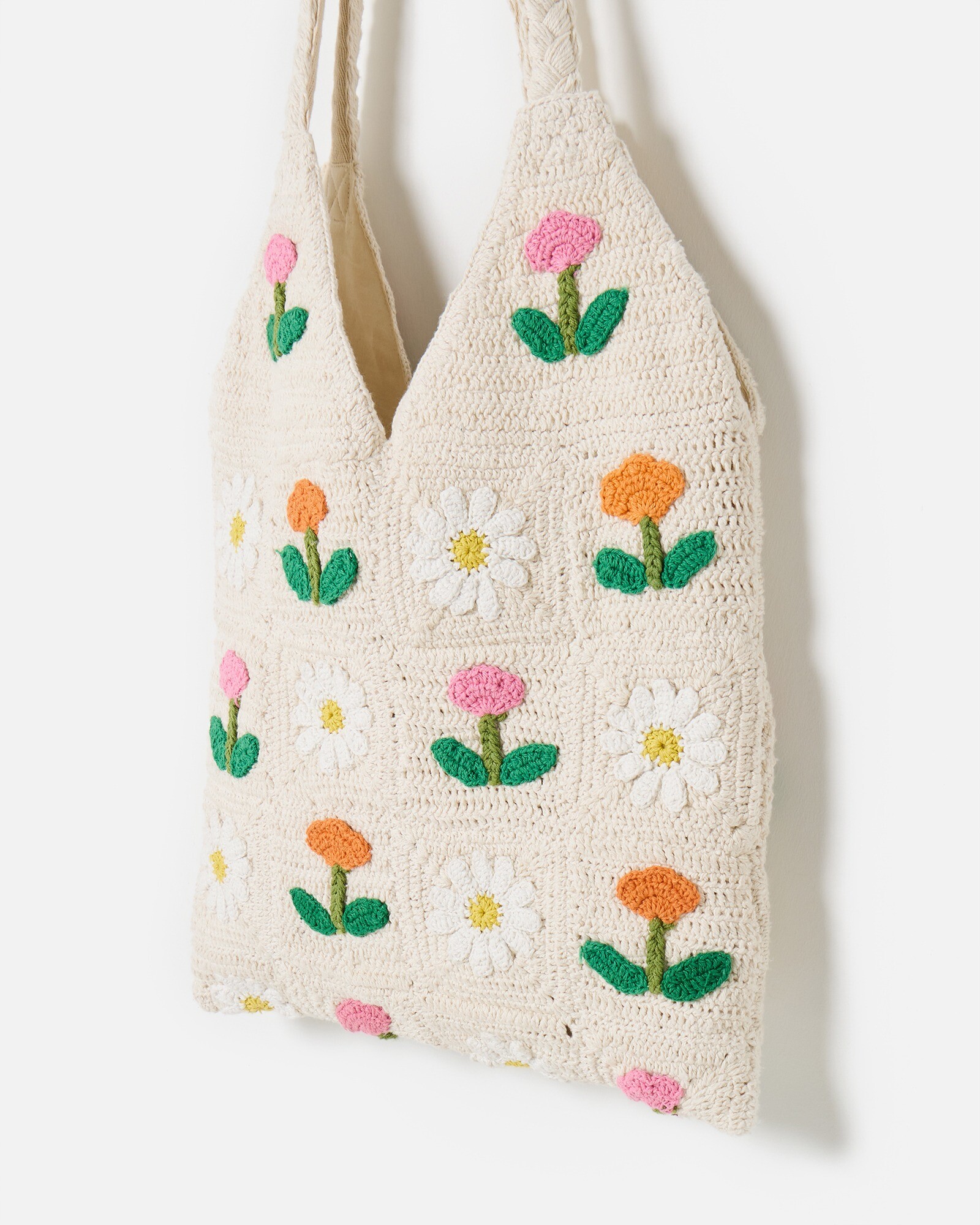 We've designed this cream cotton tote bag with crocheted white daisies and orange and pink tulips to bring a fresh, floral touch to your summer wardrobe. Lightweight and crafted with a cotton lining and a handy interior pocket, we've also added long plaited shoulder handles so it's easy to sling on your shoulder and go, making it ready for all your holiday adventures.