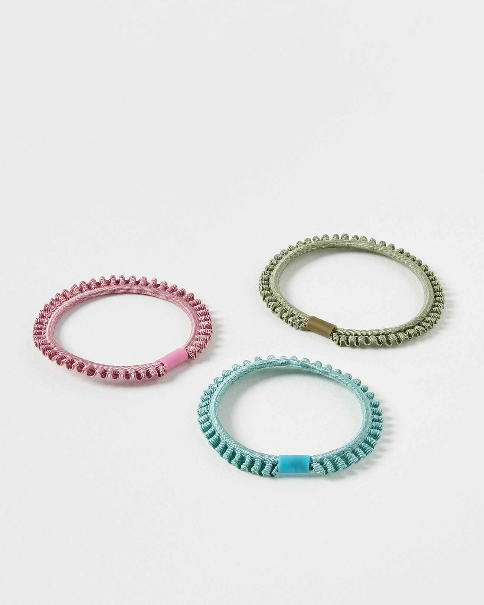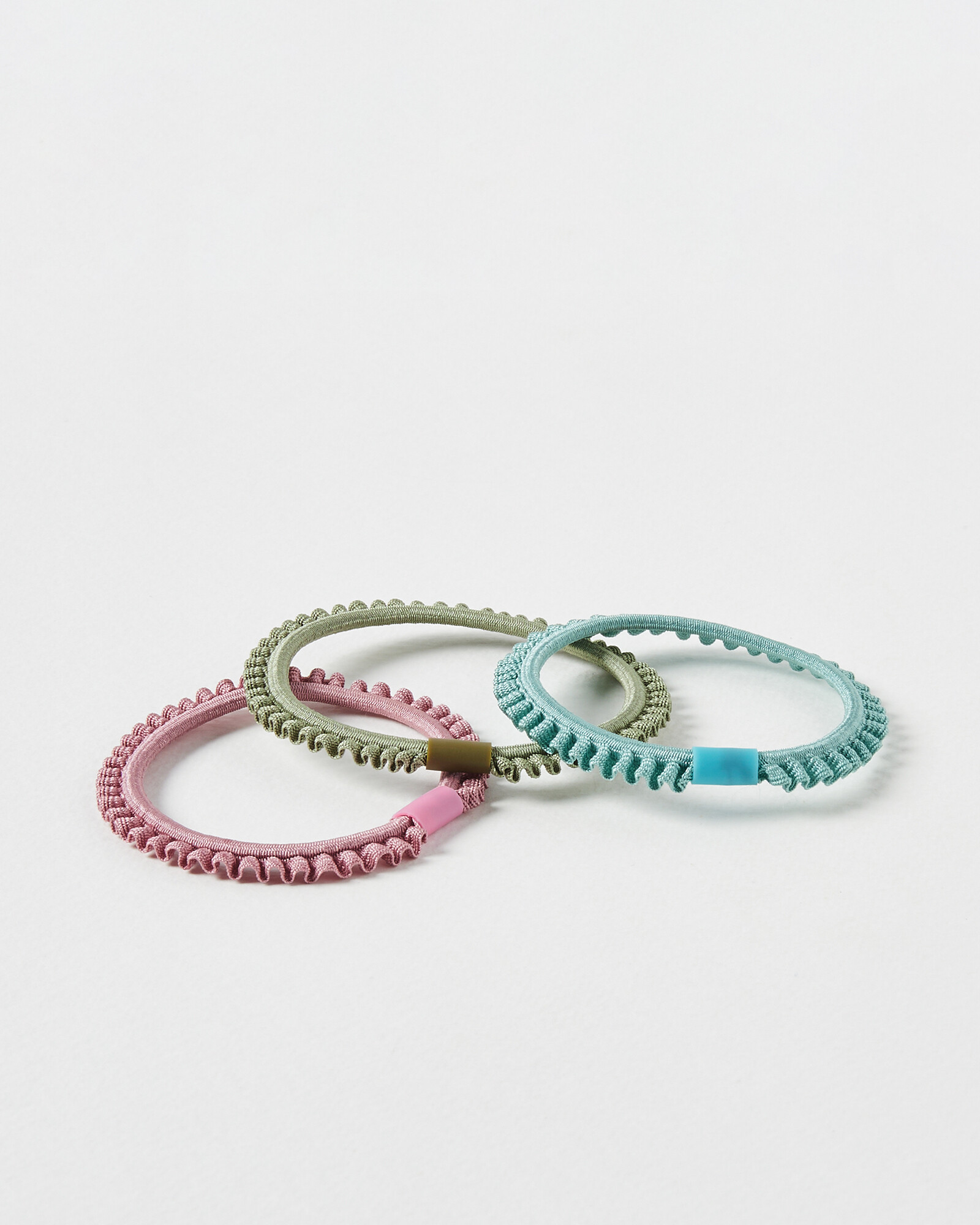 Set of three pink, green and blue elastic hair bands with a subtle frilly edge.