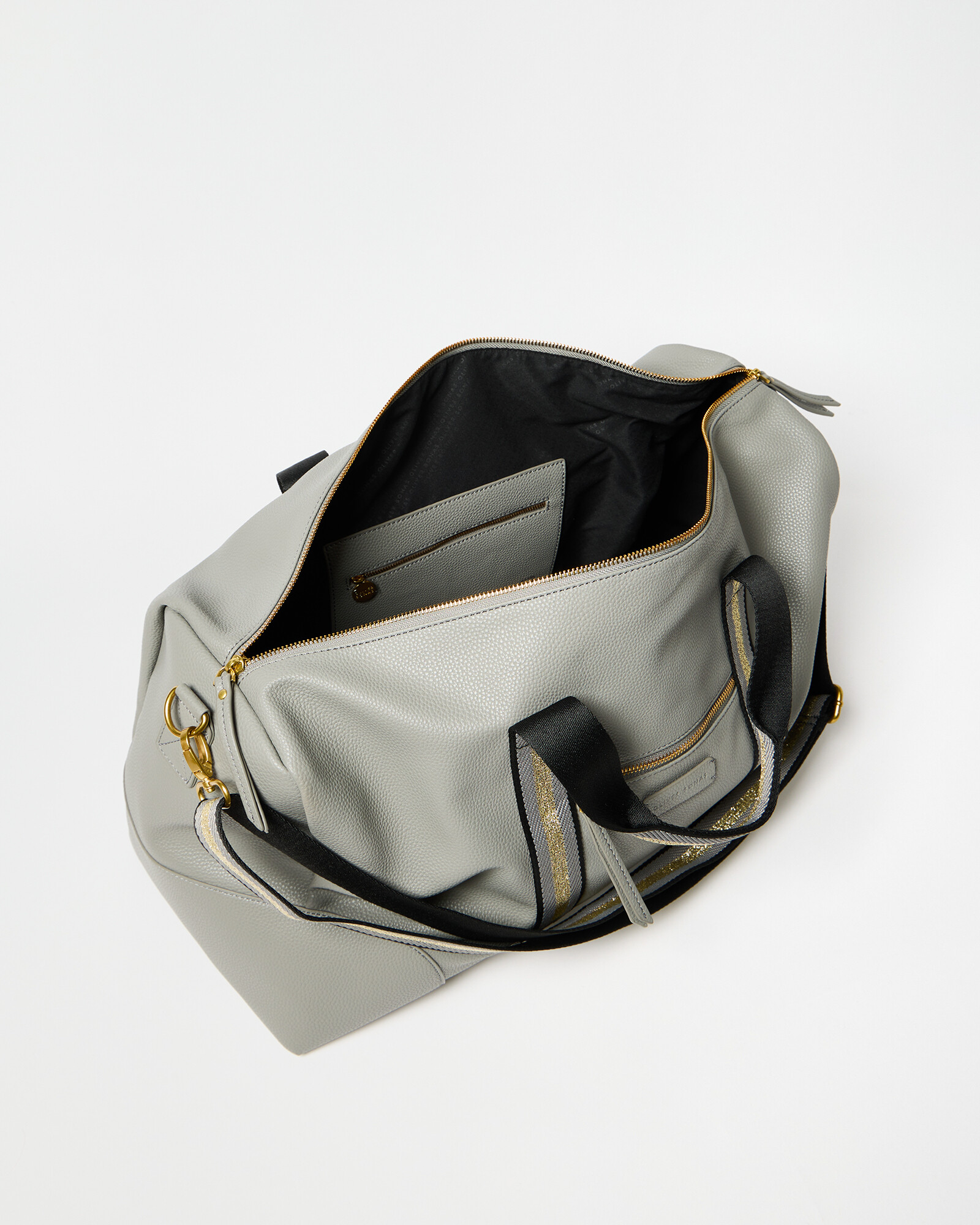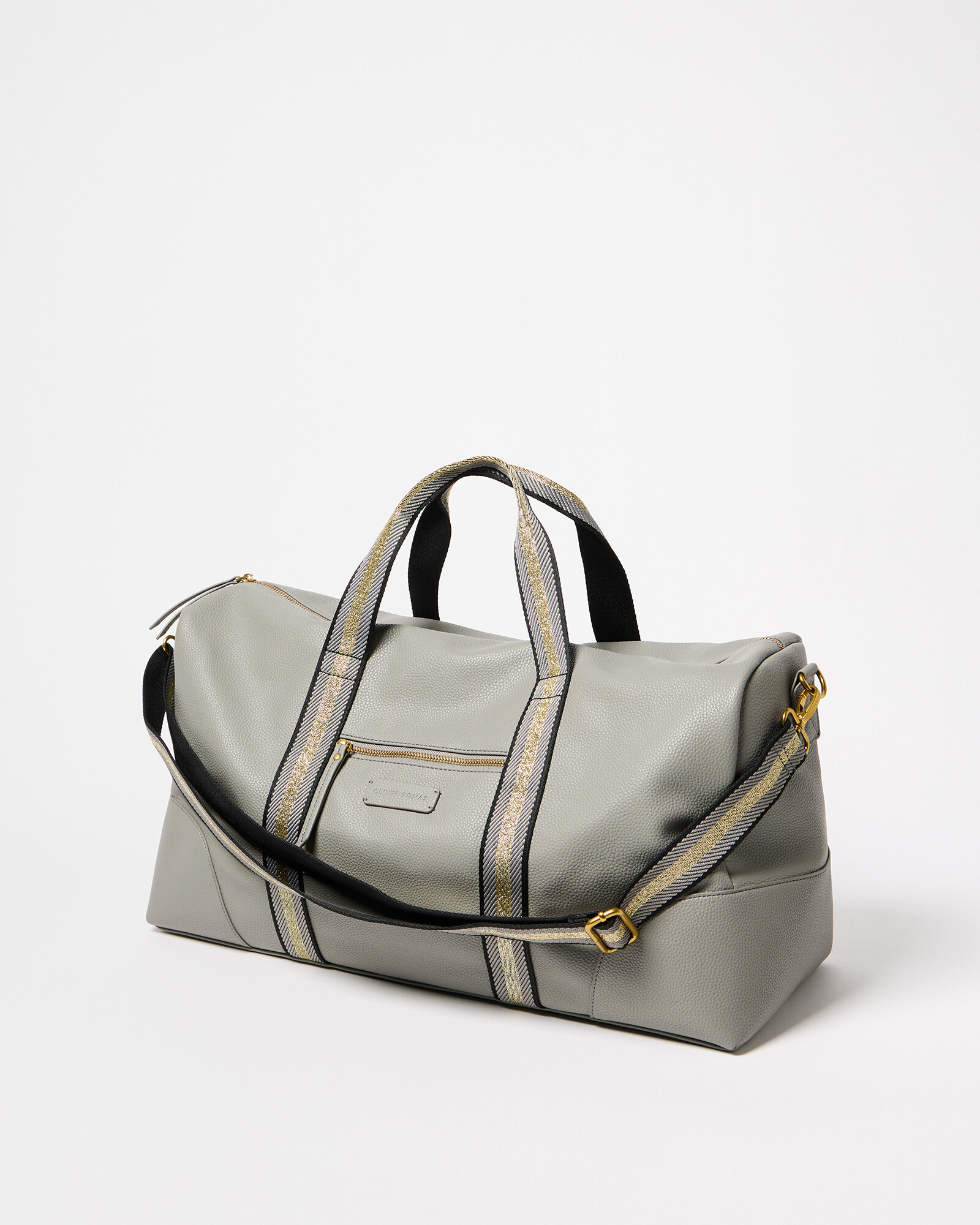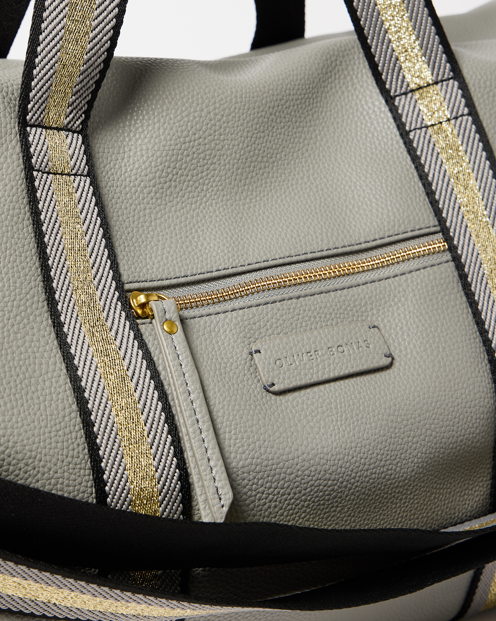 Grey weekend bag with gold metallic carry straps, a detachable crossbody strap and handy zipped pocket on the front. The interior pocket is embossed with the OB logo.