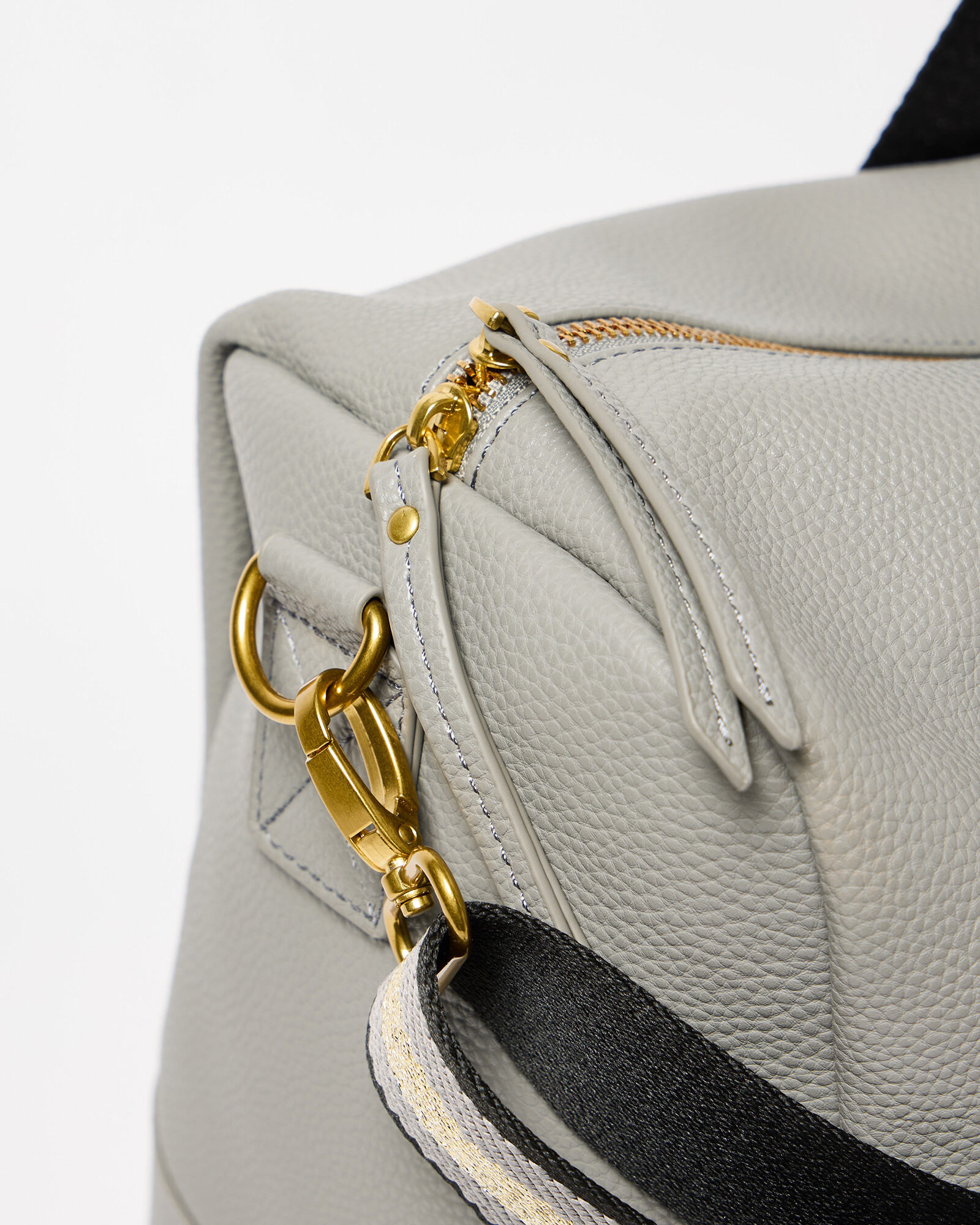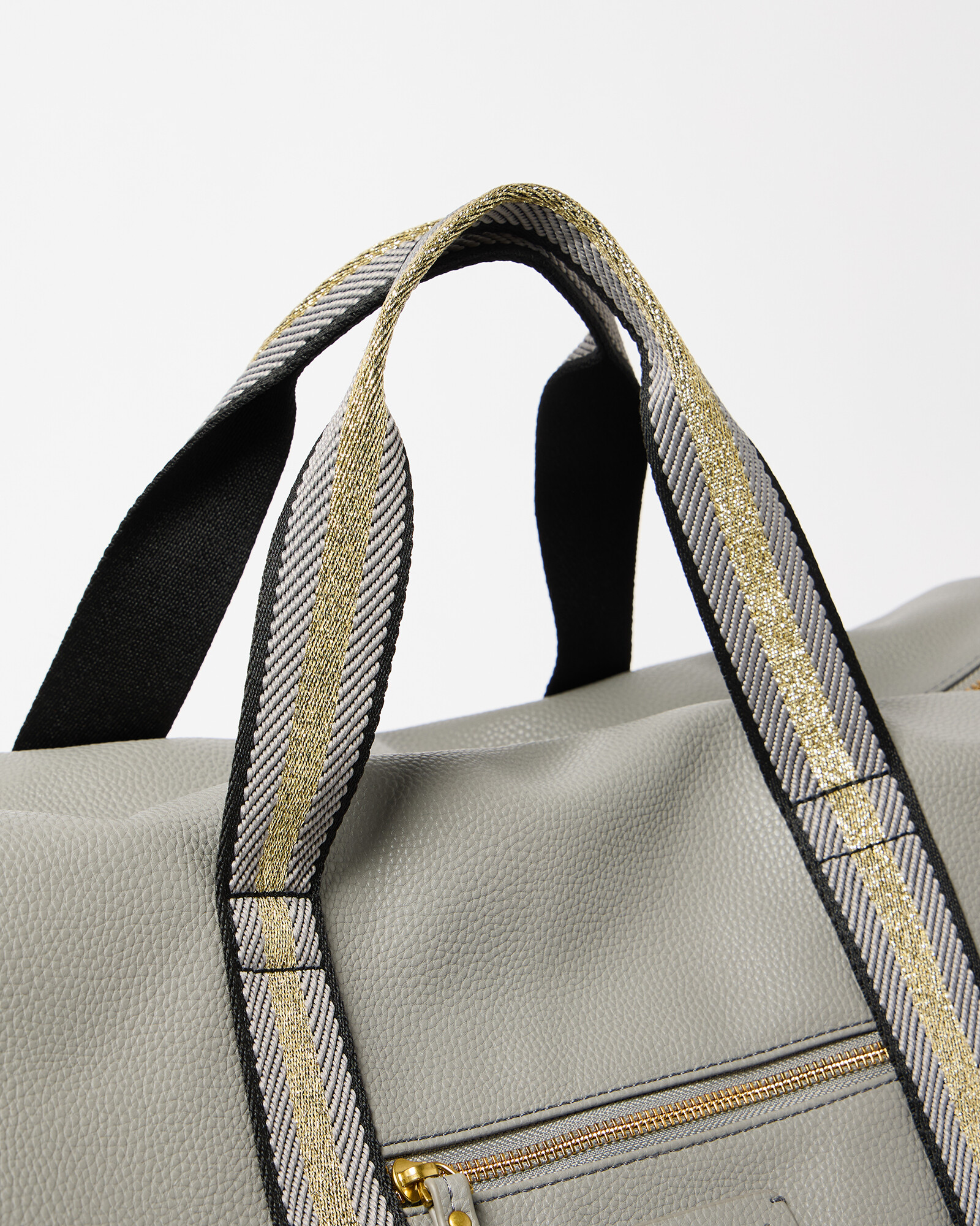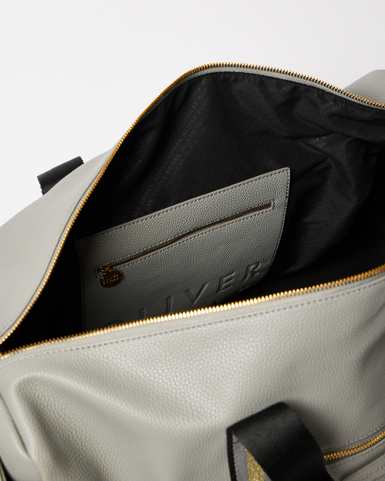 Grey weekend bag with gold metallic carry straps, a detachable crossbody strap and handy zipped pocket on the front. The interior pocket is embossed with the OB logo.