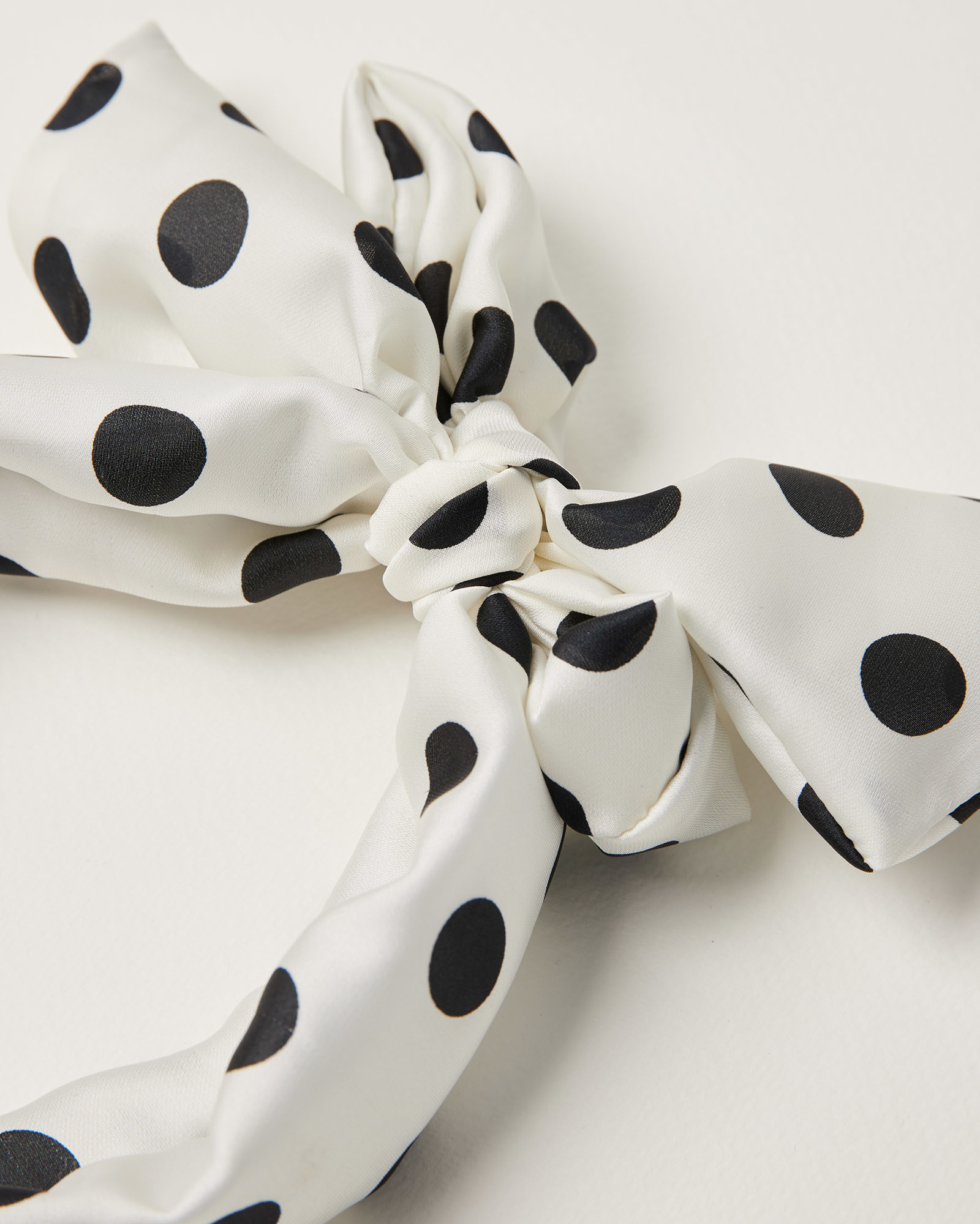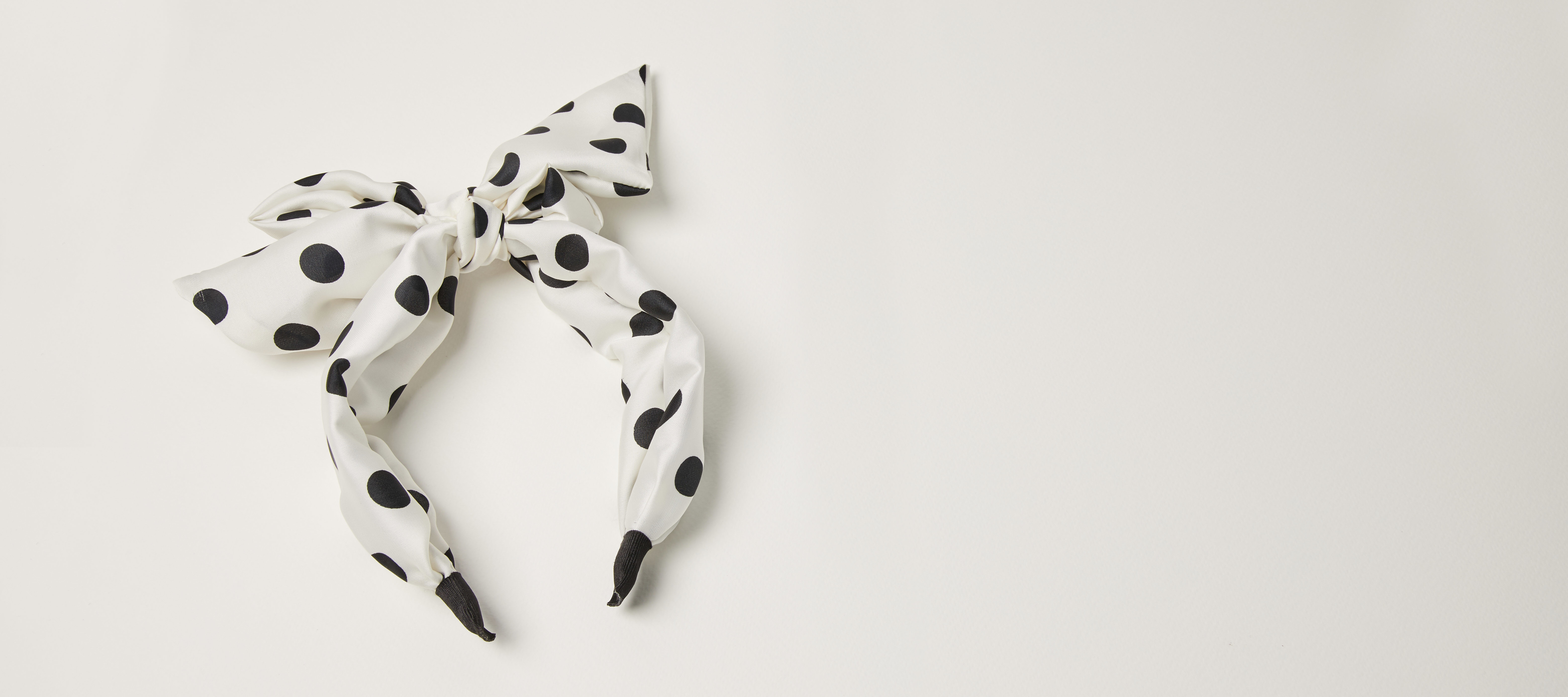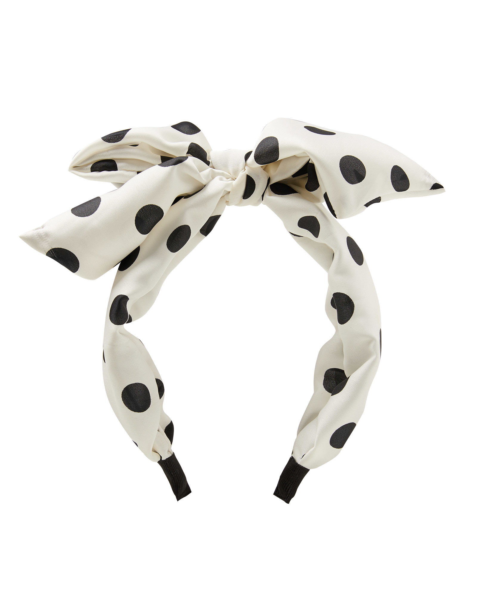 In a retro-inspired polka dot print, this monochrome headband features a bow design for a statement look.