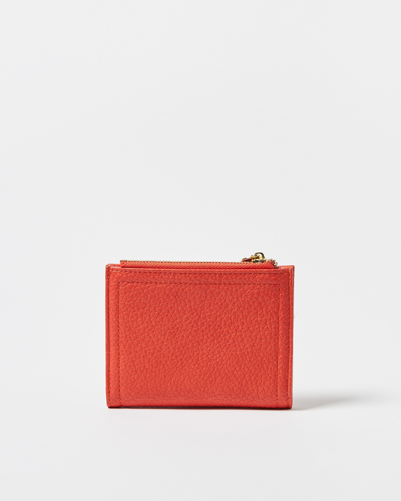 This orange zipped coin purse folds out to reveal a clear ID slot, card pockets and a small zipped pocket, with golden metalware and lettering.