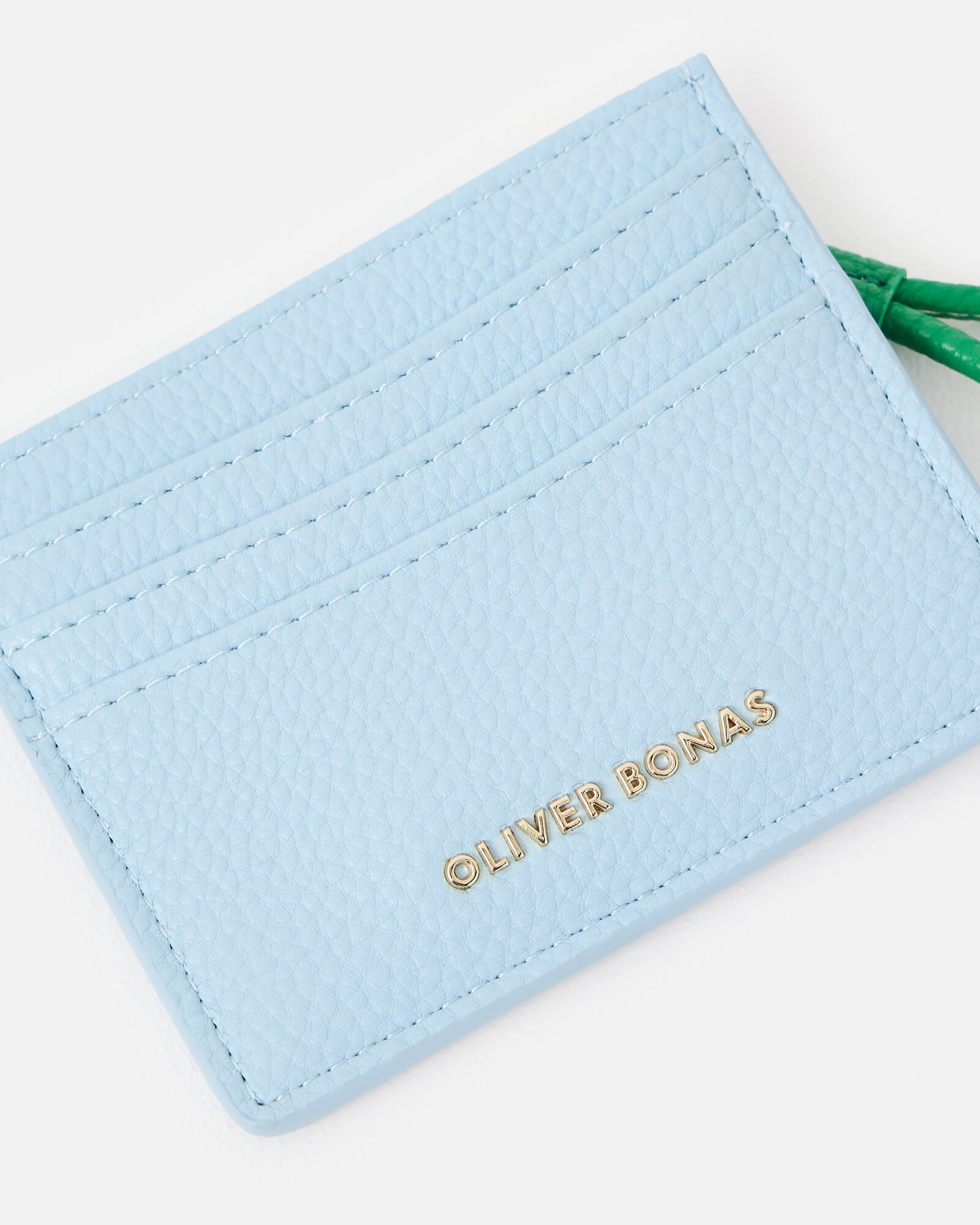 Slim light blue card holder with a zipped pocket on the back, gold OB logo and a green zip loop.
