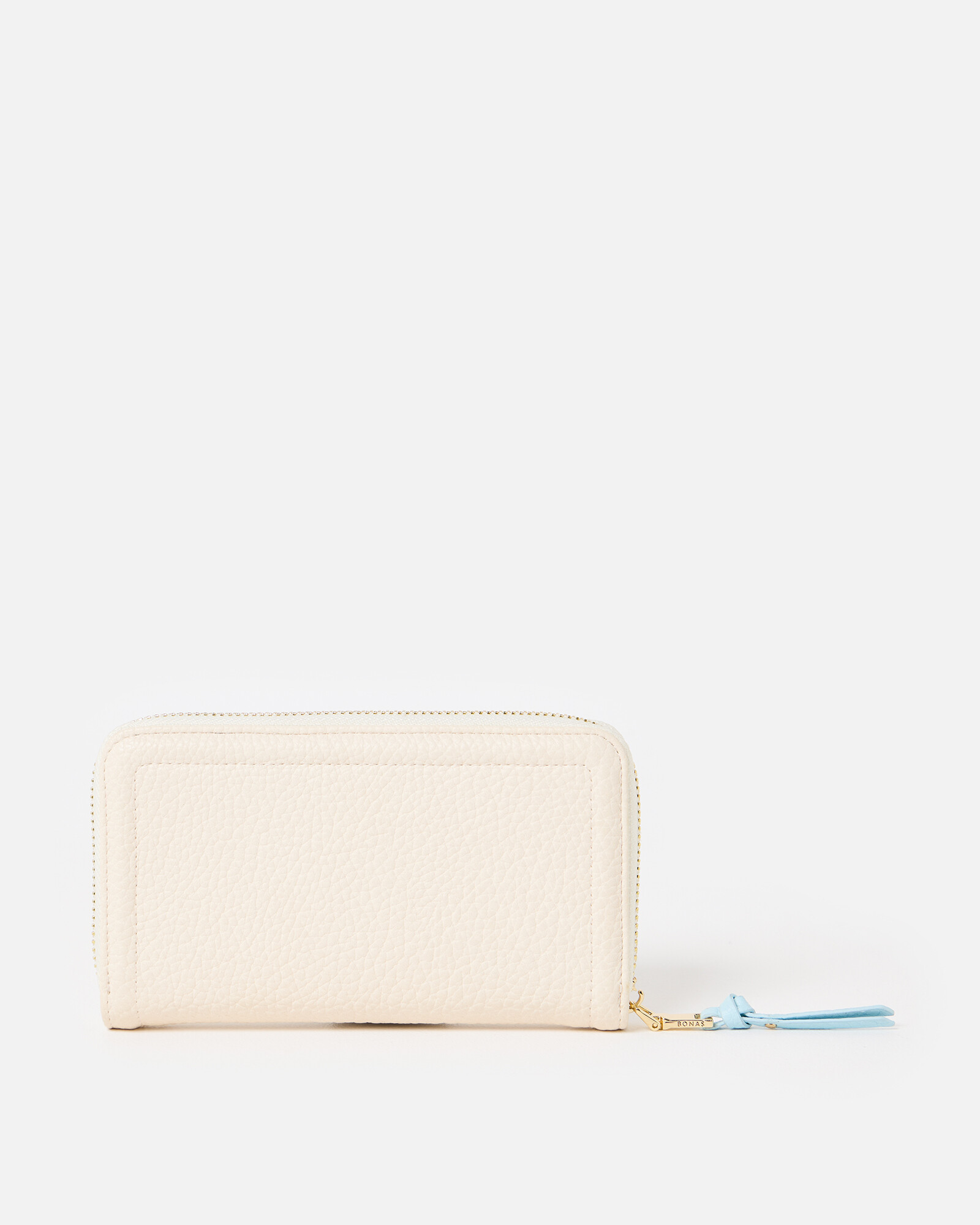 Ecru cream zip around purse with a contrasting light blue lining, coin pocket and embossed OB logo.