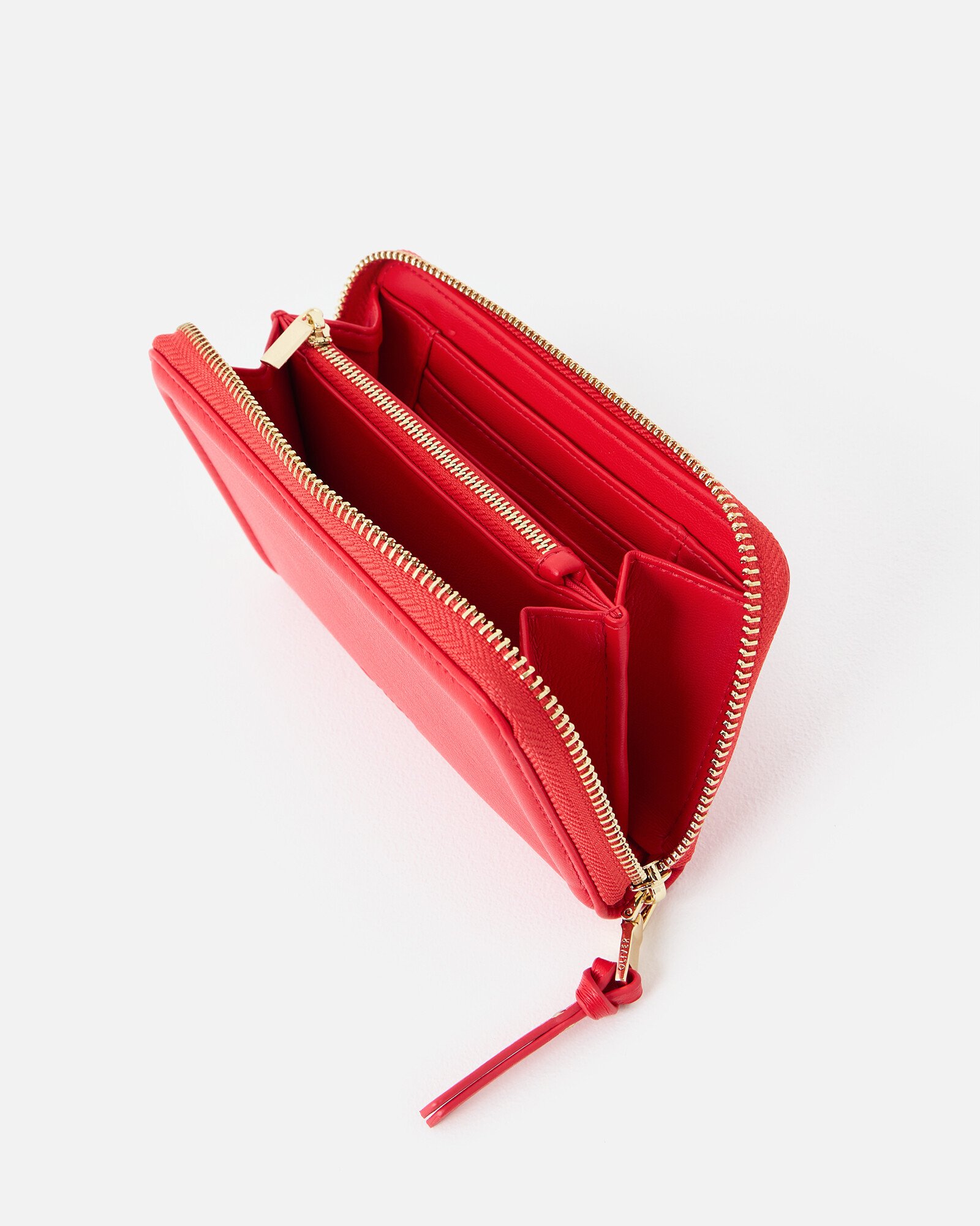 Red zip around purse with a gold zip, coin pocket and embossed OB logo.