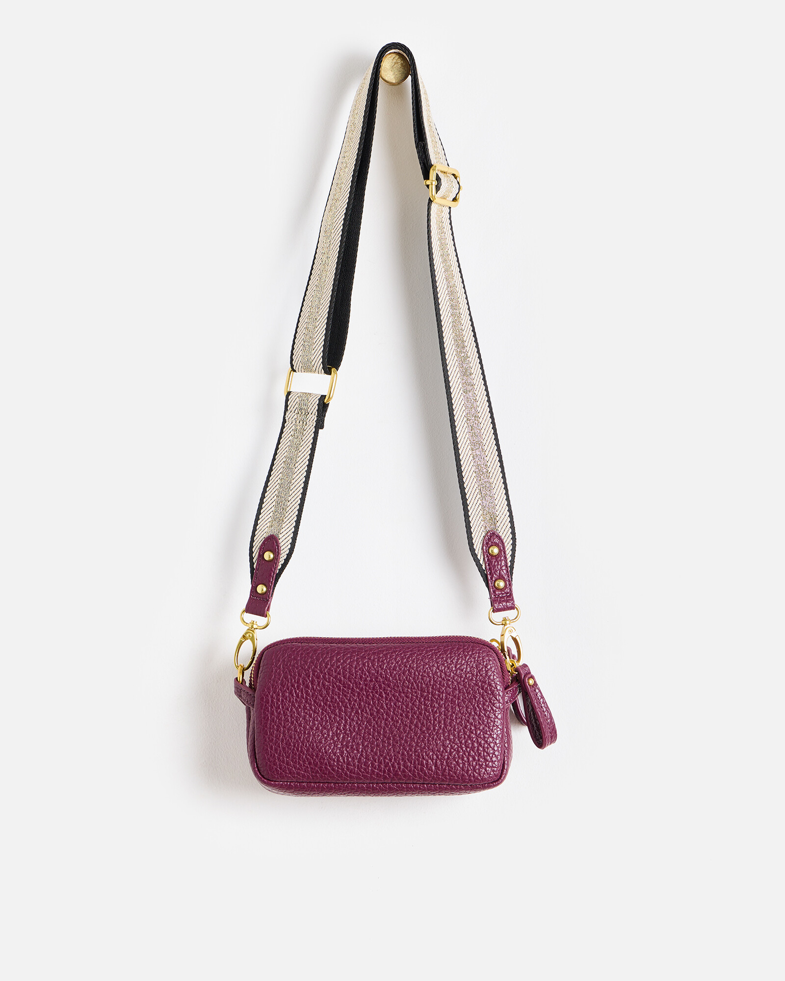 Berry red crossbody bag with two zipped pockets, stripy woven strap and compact rectangular shape. Switch to the matching slim strap or remove and use as a clutch.