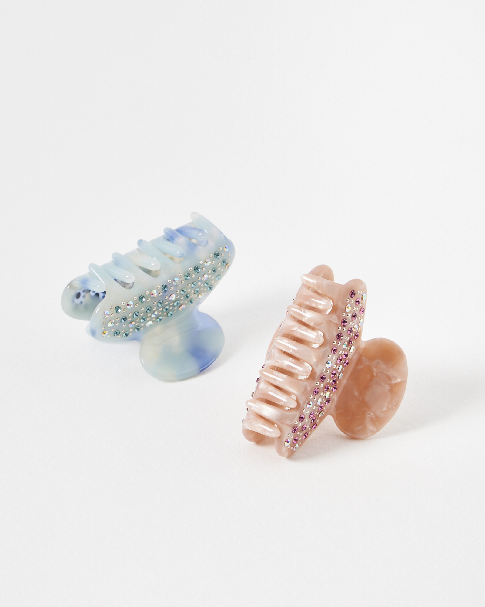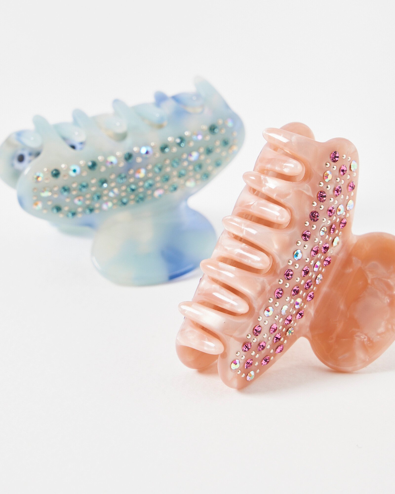 Set of two mini hair clips in blue and pink tortoiseshell-inspired patterns, embellished with coloured gems on either side.